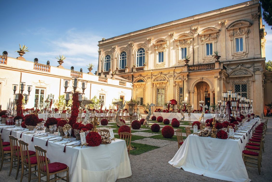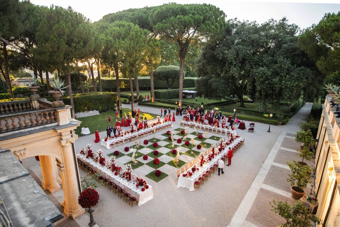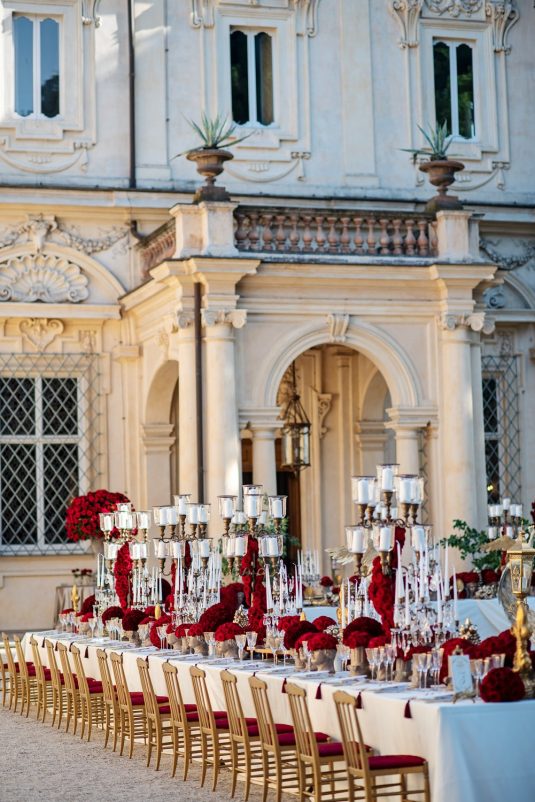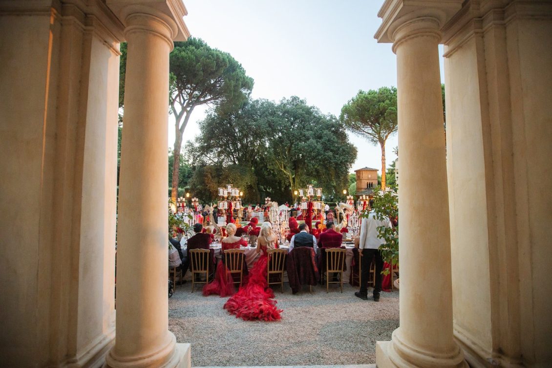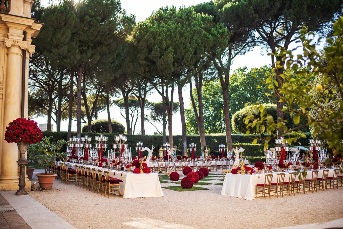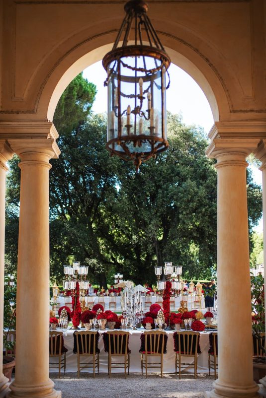 In honor of Valentine’s Day, we’re serving up red-Haute opulence! The day before their wedding, Sandra and Dario welcomed their guests in the most magnificent Villa in Rome, Villa Aurelia. How romantic is this setup—which we can only describe as being a baroque wonderland WOW!!!!