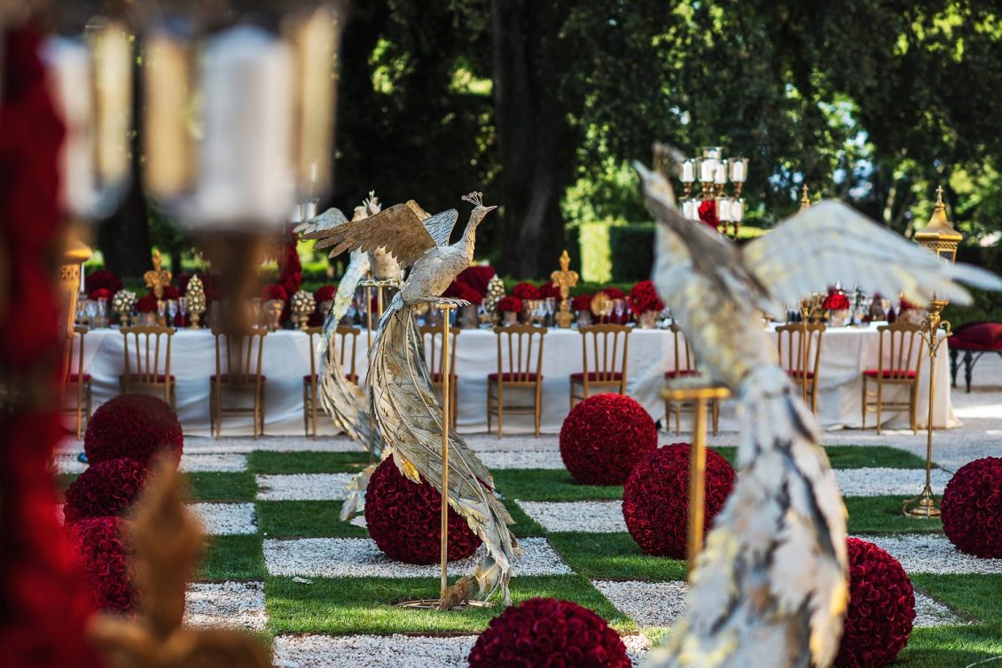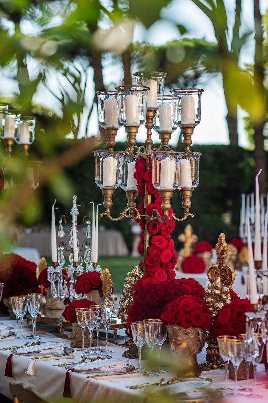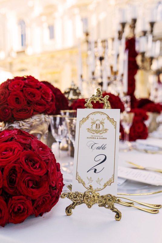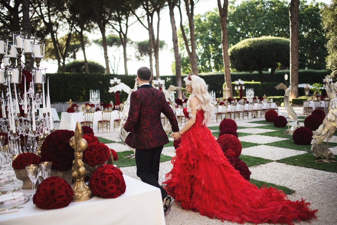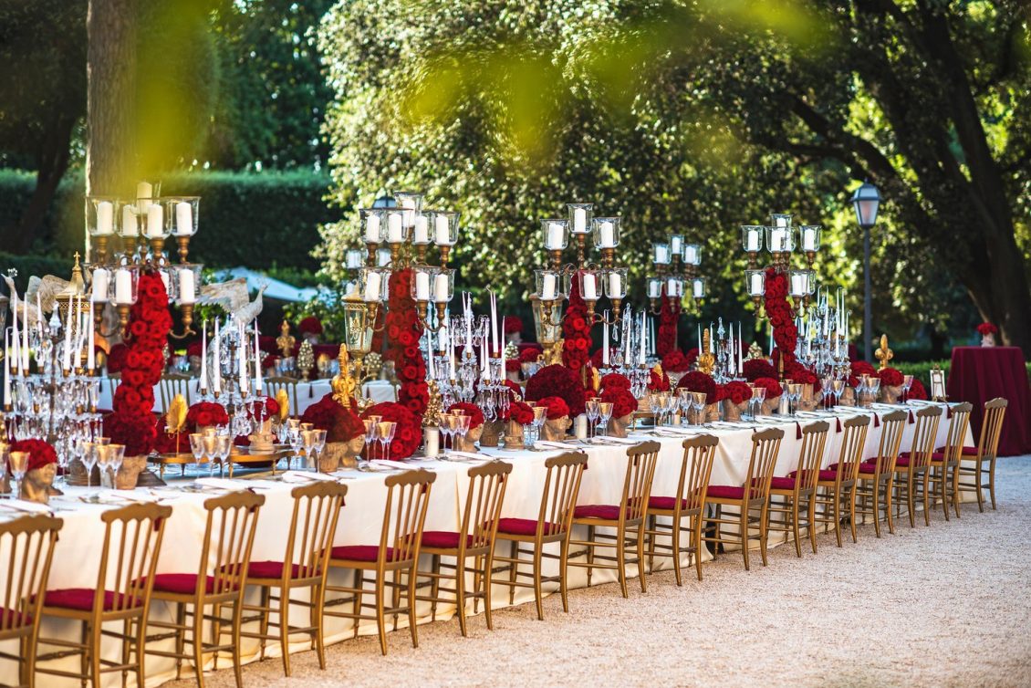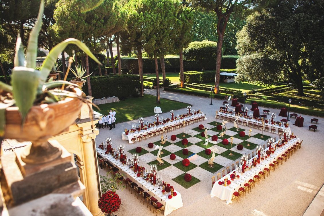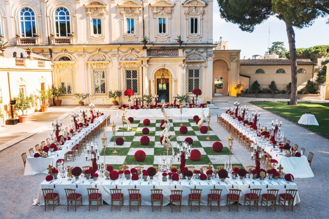 In honor of Valentine’s Day, we’re serving up red-Haute opulence! The day before their wedding, Sandra and Dario welcomed their guests in the most magnificent Villa in Rome, Villa Aurelia. How romantic is this setup—which we can only describe as being a baroque wonderland WOW!!!!