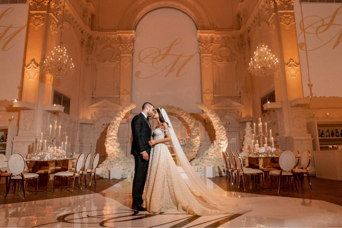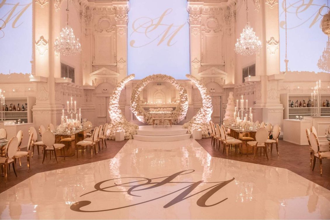 The reception was held at Maison Principal, a venue in Montreal known for gorgeous high ceilings, detailed mouldings, and spectacular in-house chandeliers. Creativ Nation projected the couples logo on the walls of the venue.