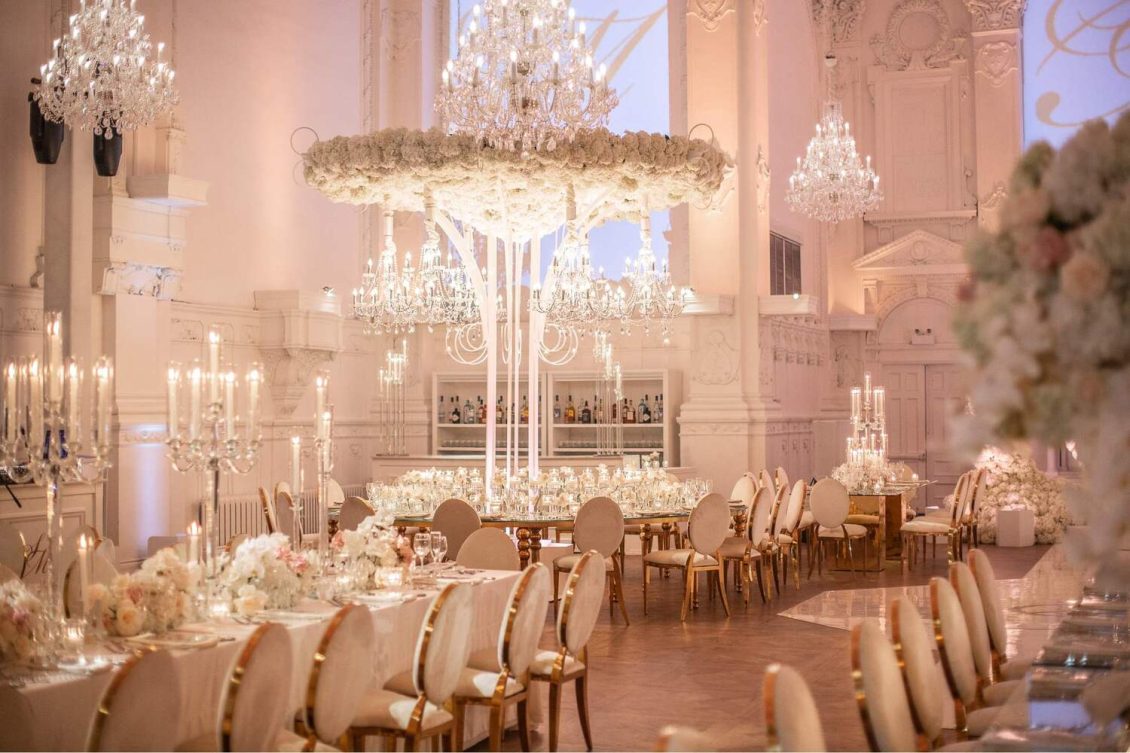 Two 12ft tall white metal structures with 12ft diameter circular “tops” were custom-manufactured. The top of the structures was completely covered with white hydrangeas; six chandeliers were then hung from each structure to complement the spectacular in-house chandeliers of Maison Principal.