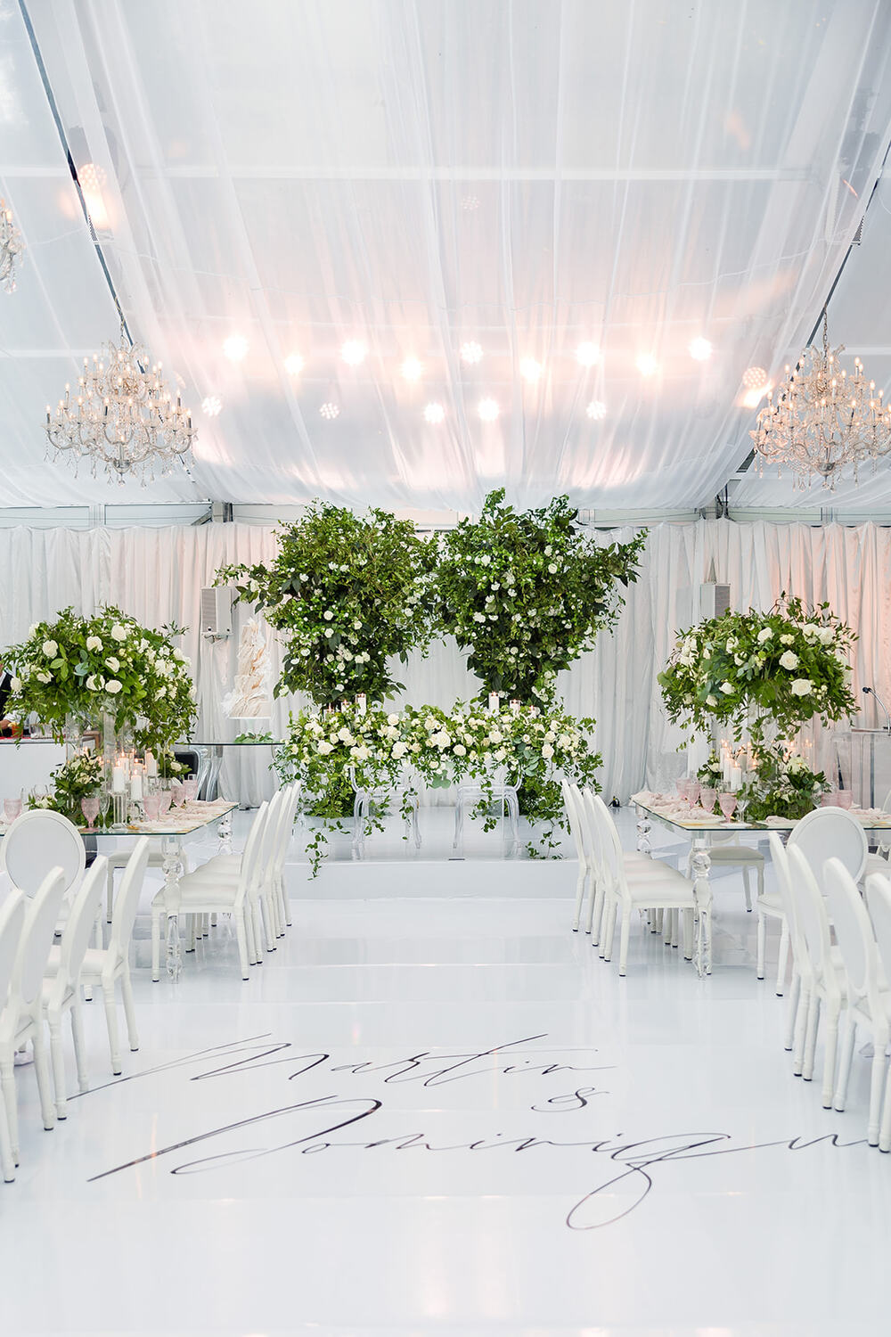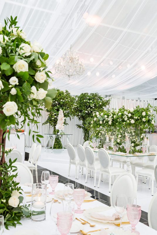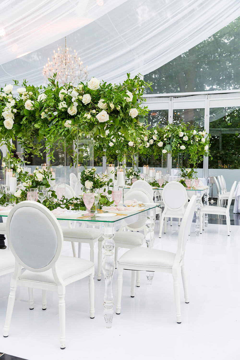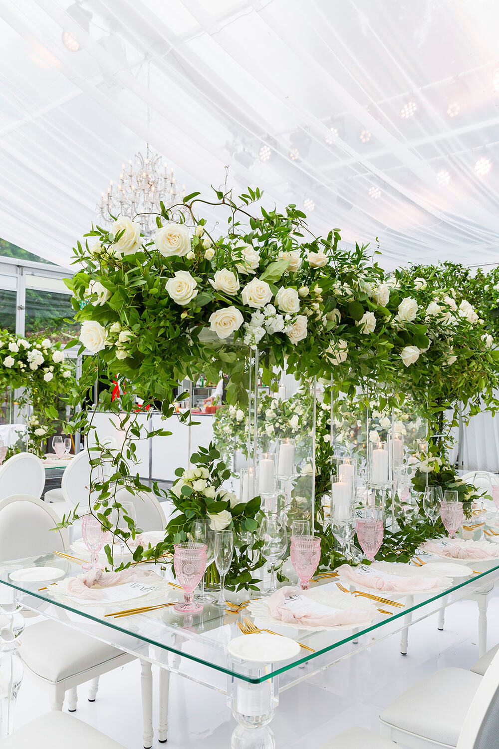 GreeneryTented WeddingWhite Wedding DecorWhite FloralsGarden InspirationChandeliersLush FloralsPink Accents
