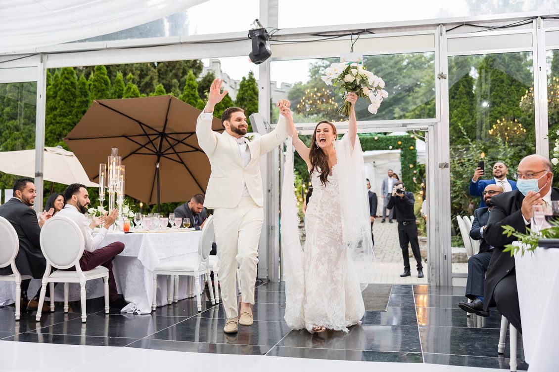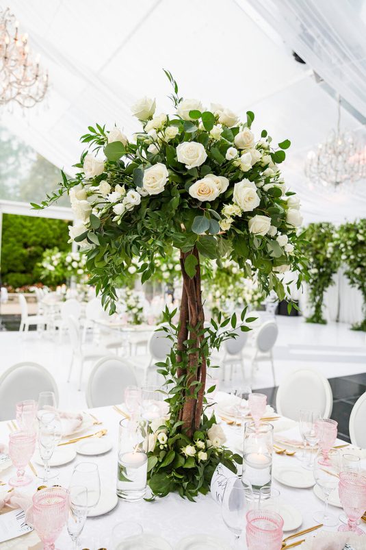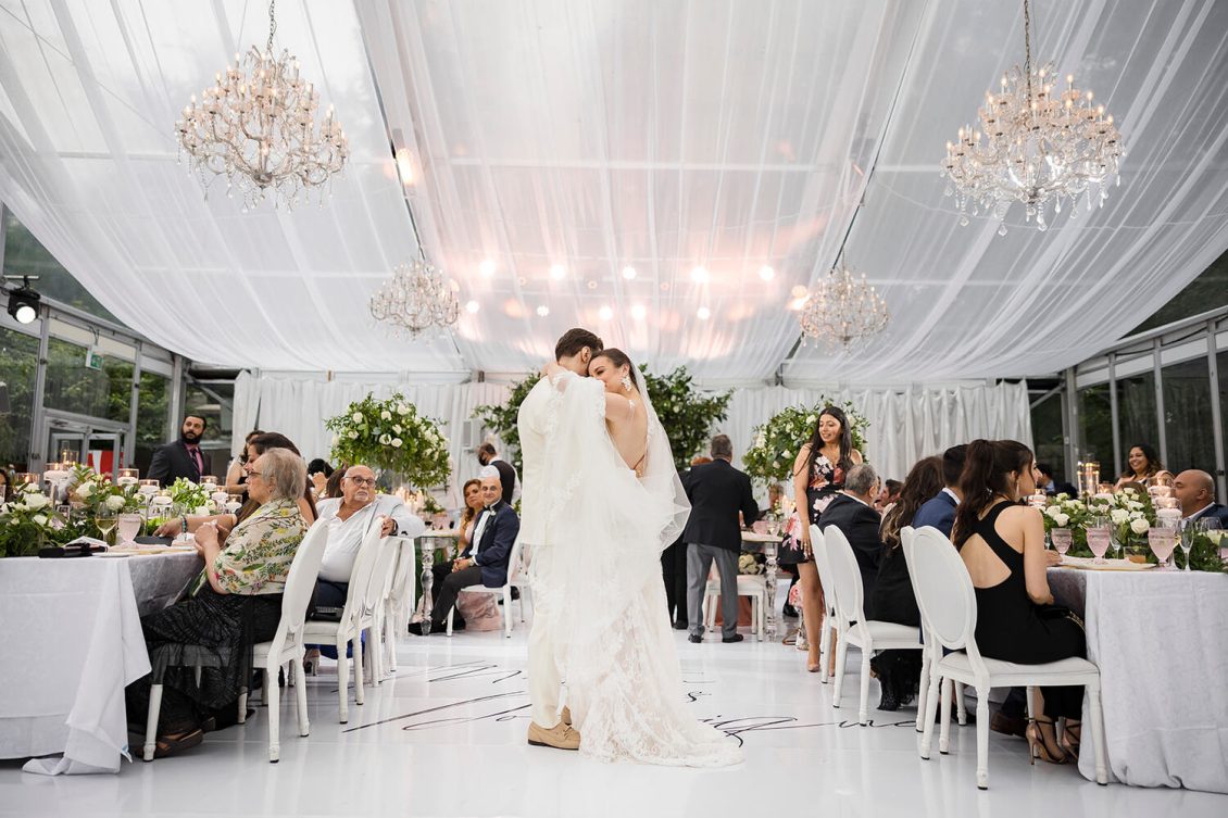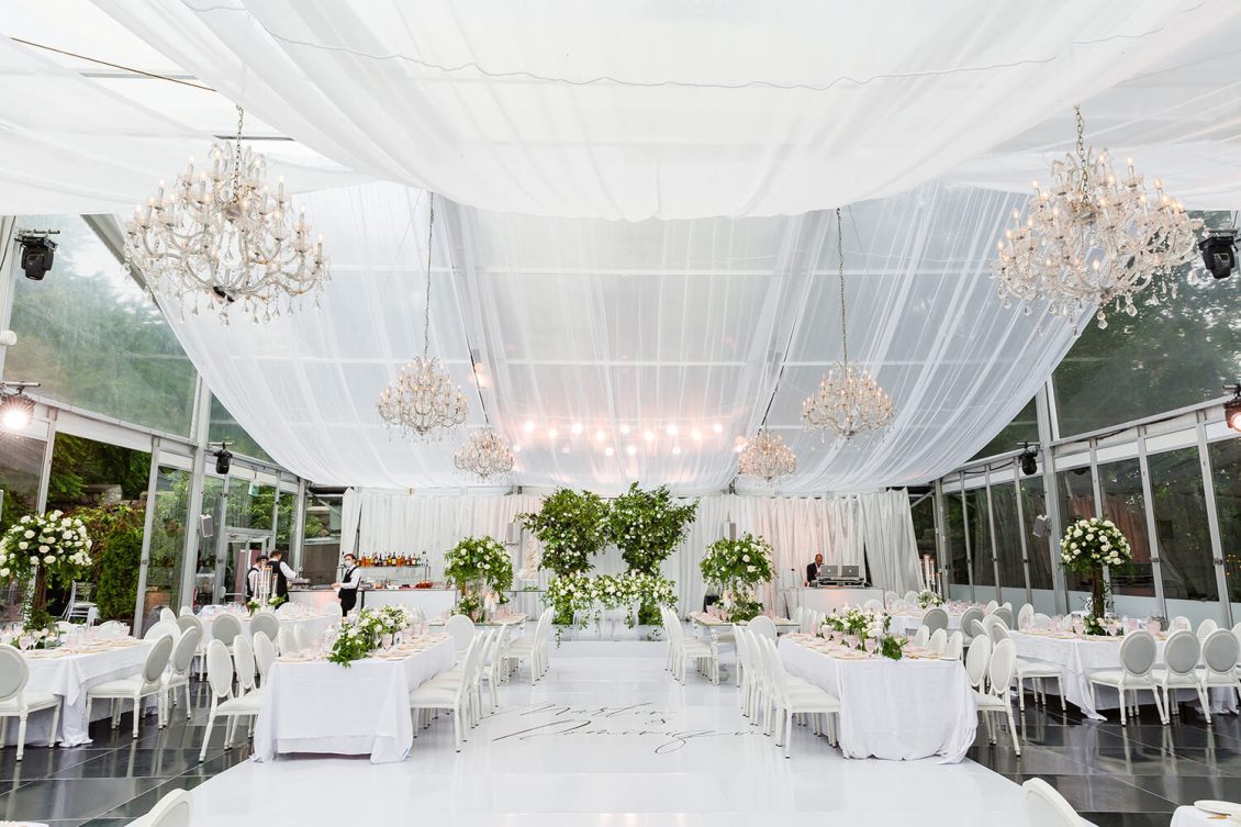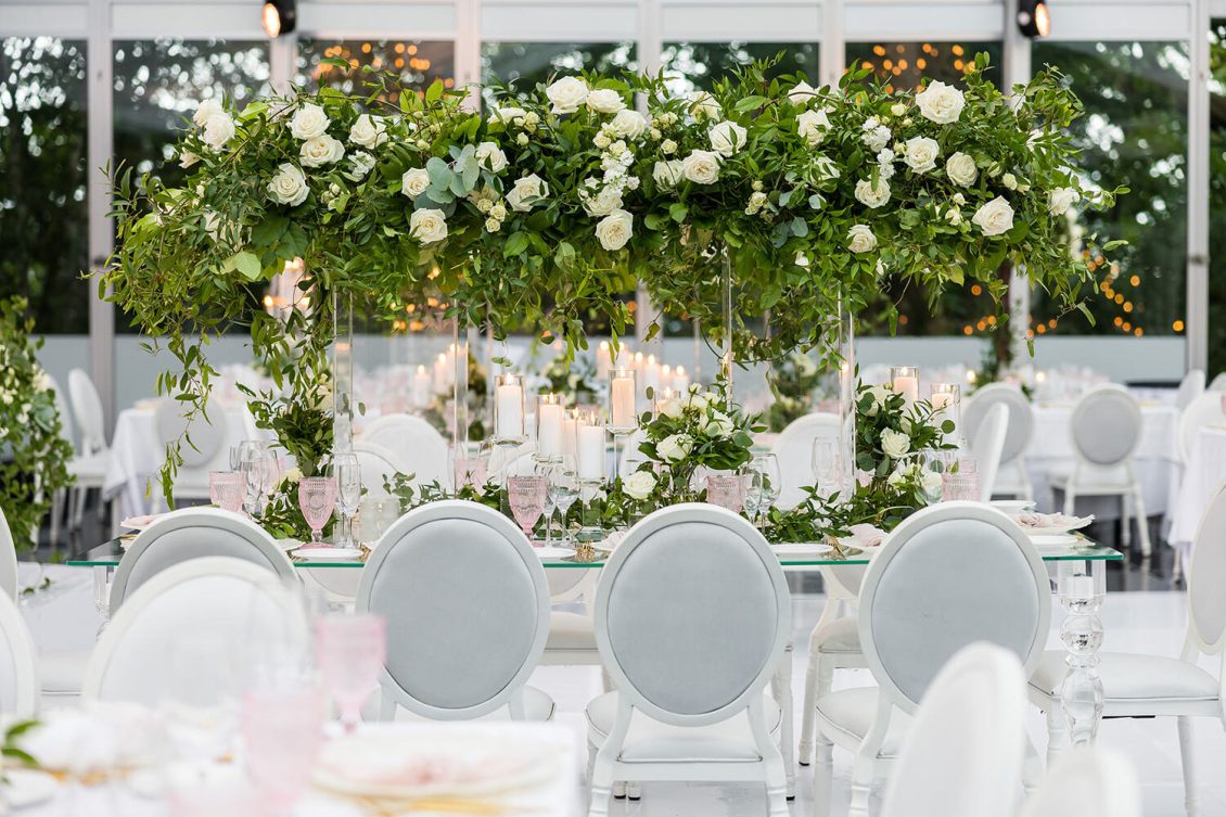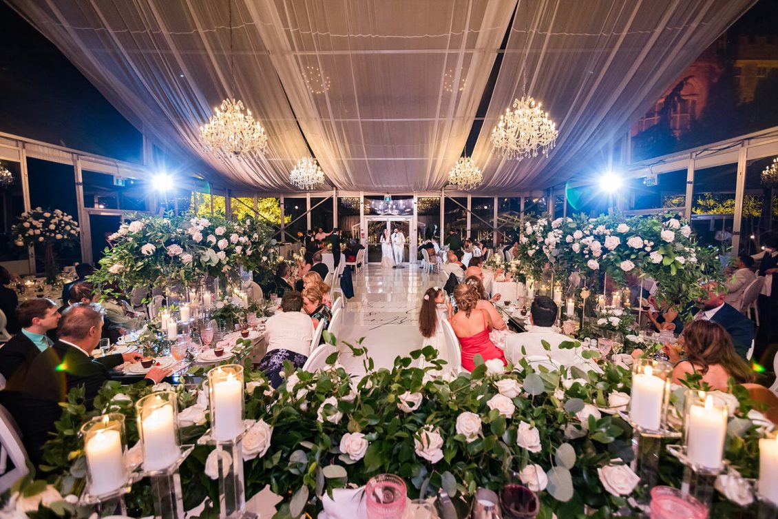 . Royal Orchid Florist created a fresh floral vibe using greenery inspired by the bride’s love of plants and nature. Lights were installed inside the glass pavilion and outside in the garden to give guests a beautiful view of Casa Loma at night.