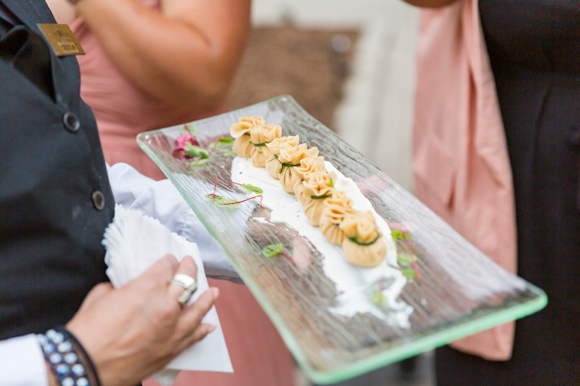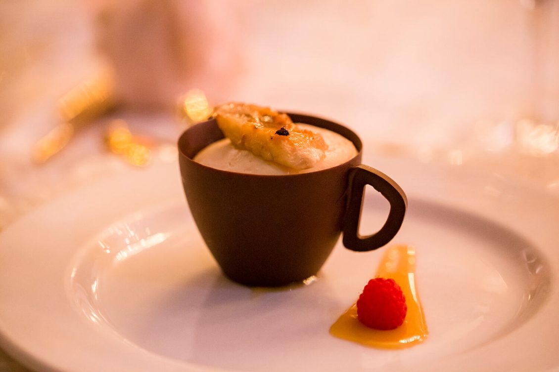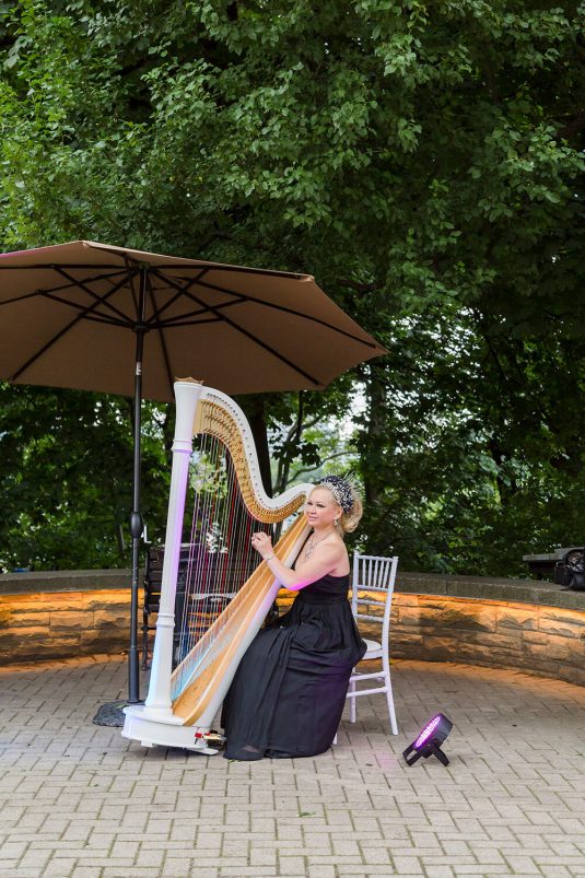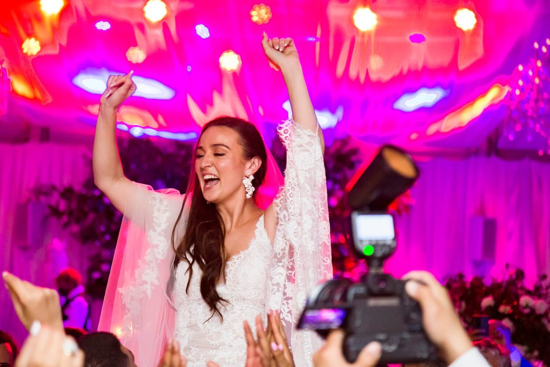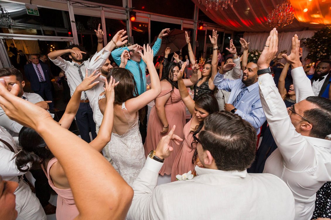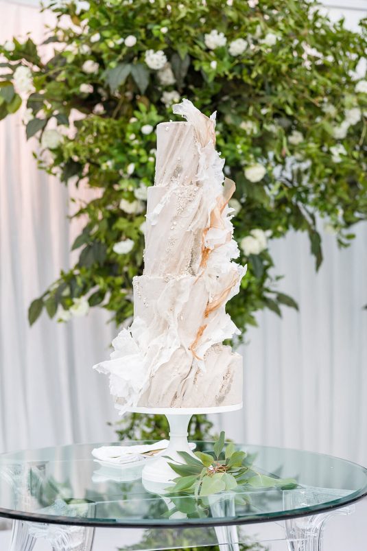 . Royal Orchid Florist created a fresh floral vibe using greenery inspired by the bride’s love of plants and nature. Lights were installed inside the glass pavilion and outside in the garden to give guests a beautiful view of Casa Loma at night.