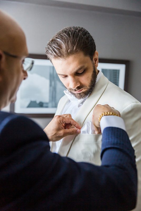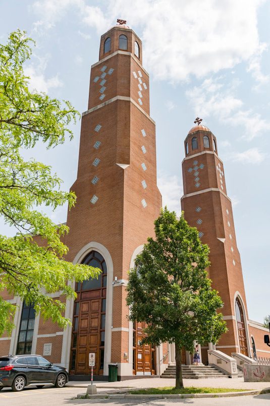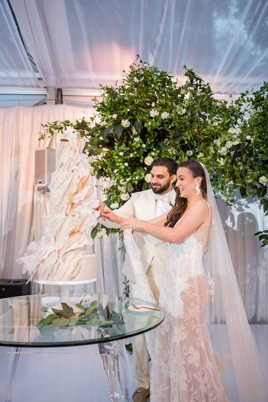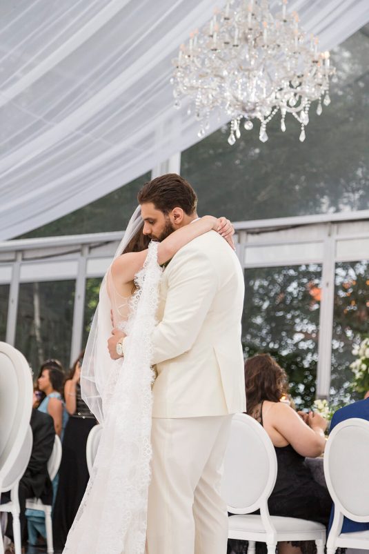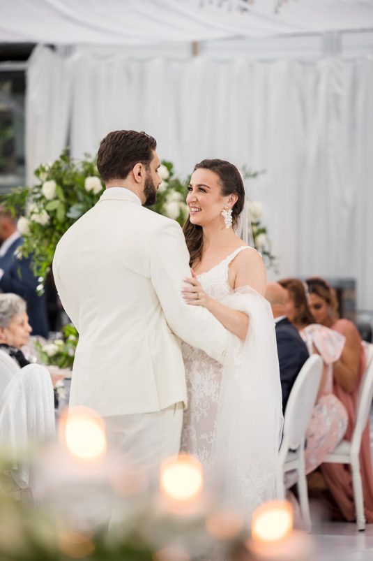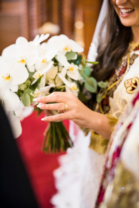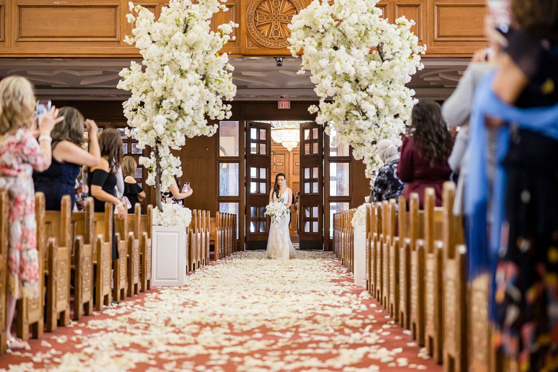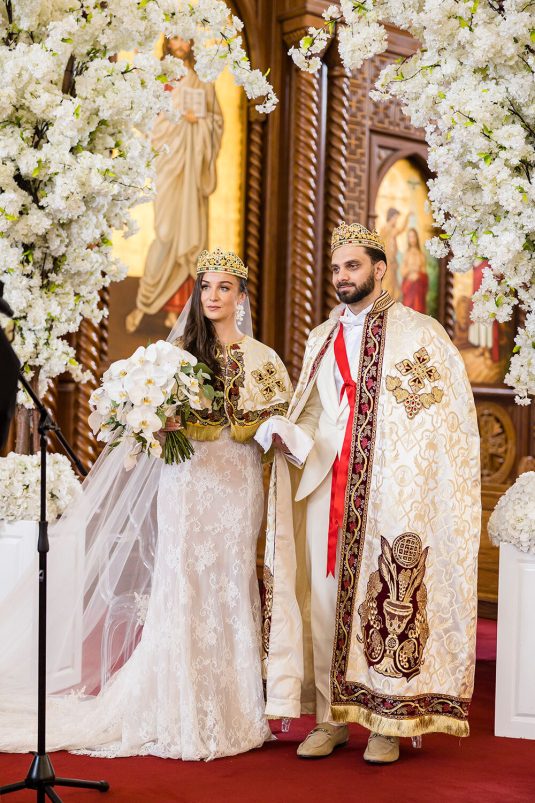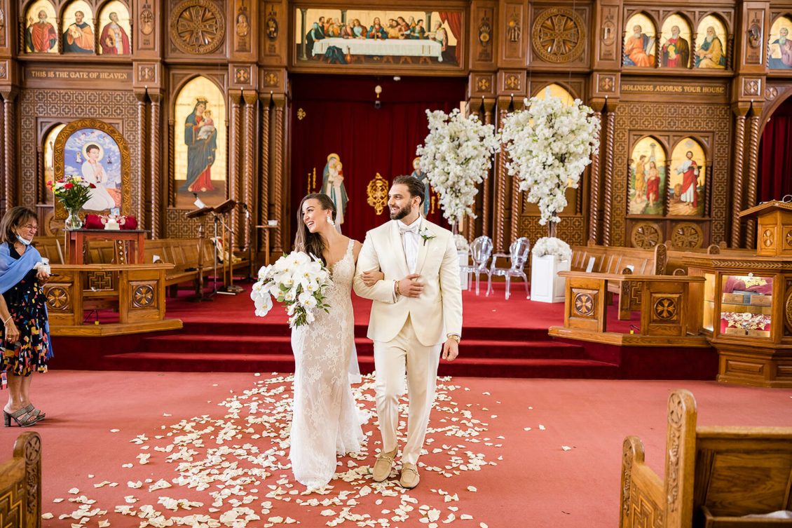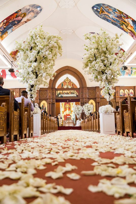 The ceremony took place at The Church of the Virgin Mary & St. Athanasius. “Dominique always dreamt of having an aisle full of white petals. We created her vision by using 700 white roses which made it look like a white runner flowing down the aisle. In the middle of the church we included two white cherry blossom trees at the altar behind Martin and Dominique,” says event planner Lina Gobrail. The priest took the time to explain the Coptic Orthodox ceremony in English (which isn’t normally done) to make it easier for Dominique’s side of the family to understand the symbolism and traditions.