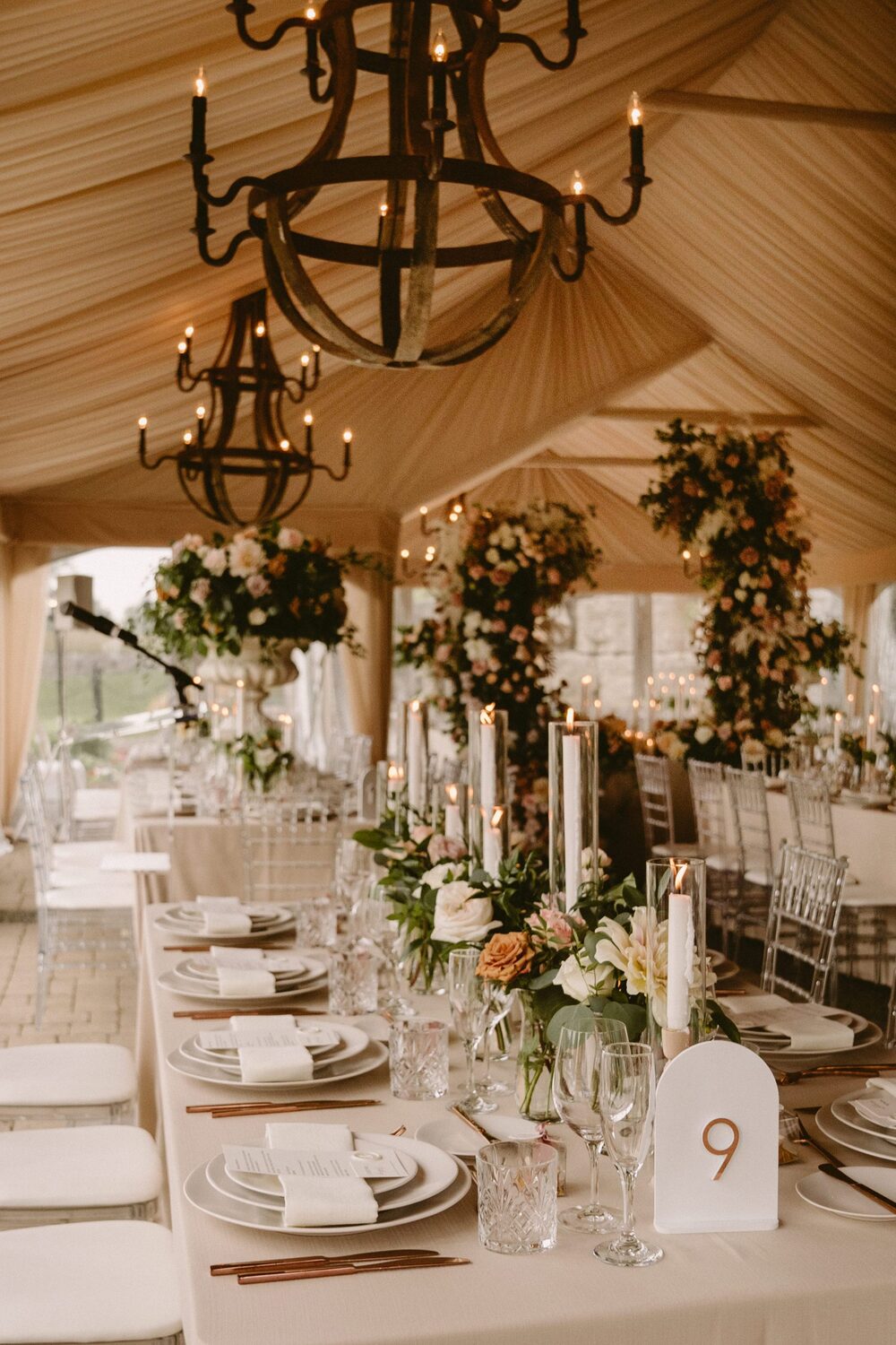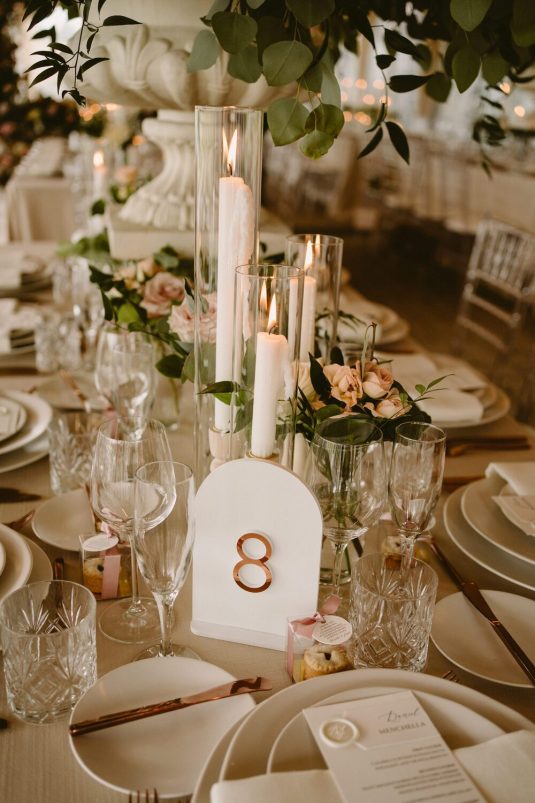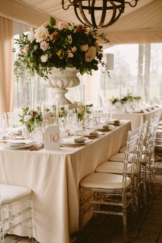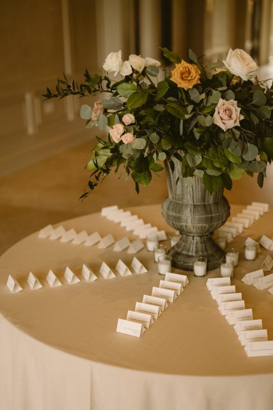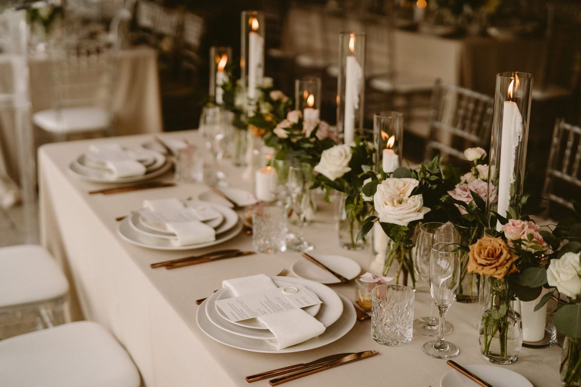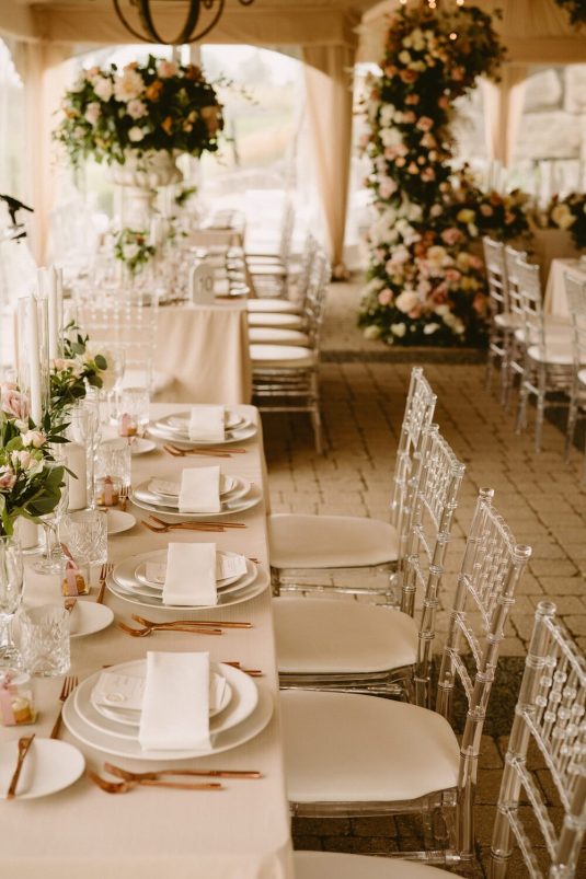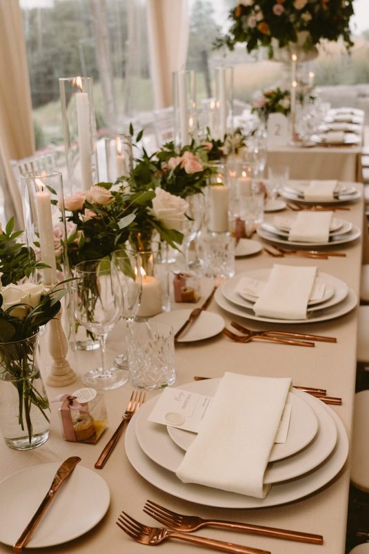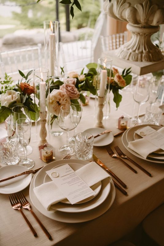 and WILD THEORY FLORAL & EVENT DESIGN to evoke the quiet elegance of European design. Part nature-inspired, part airy minimalism. This was achieved by using tone-on-tone neutrals; ceramic dinnerware paired with copper flatware and crystal cut glassware.
