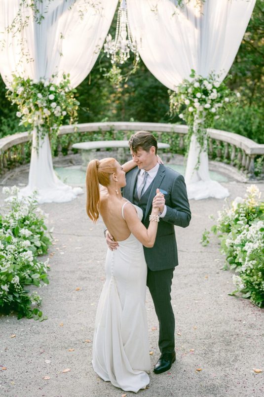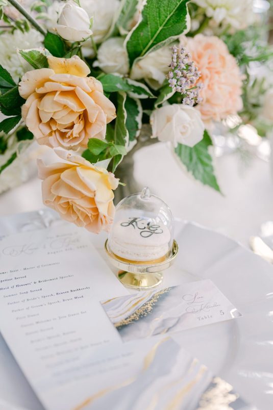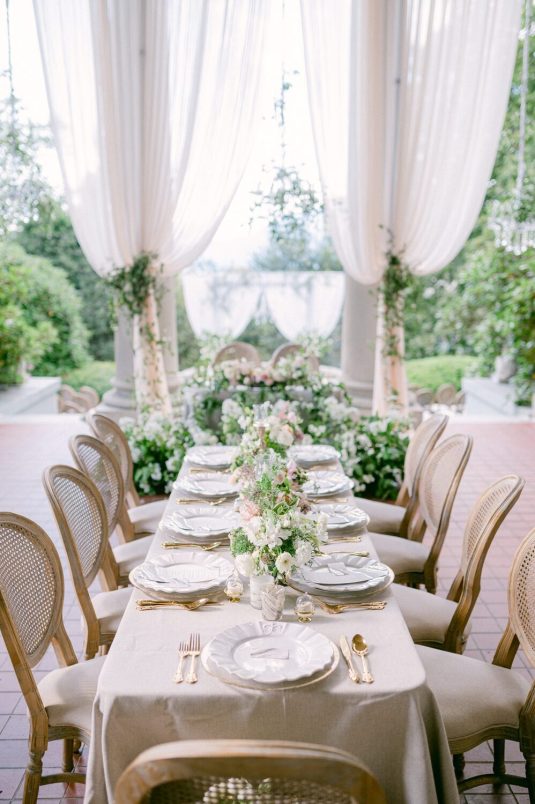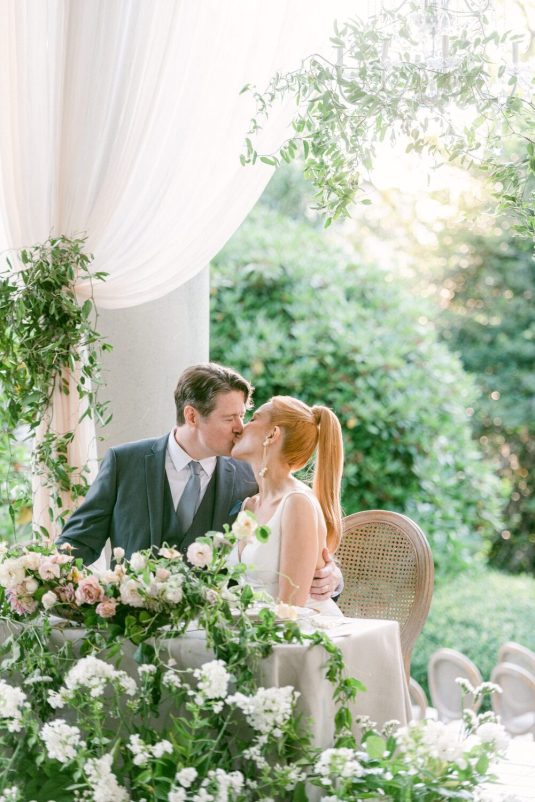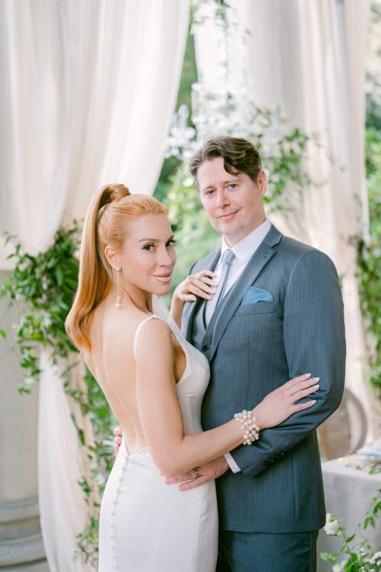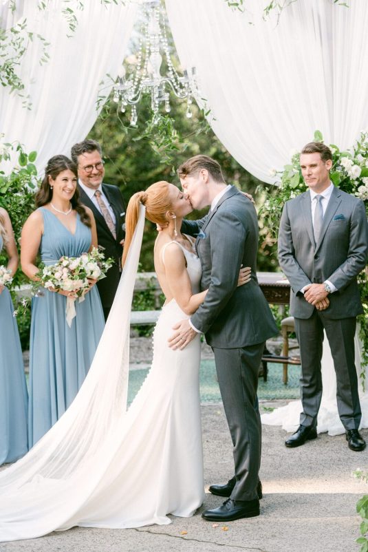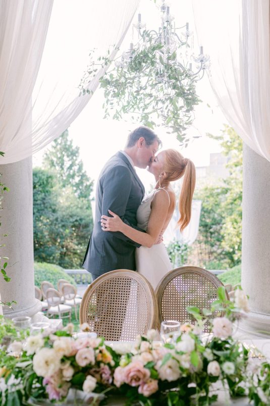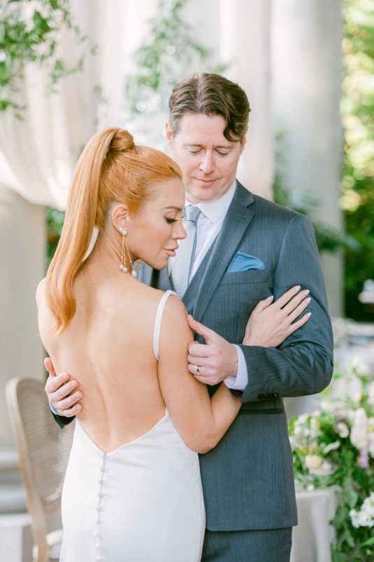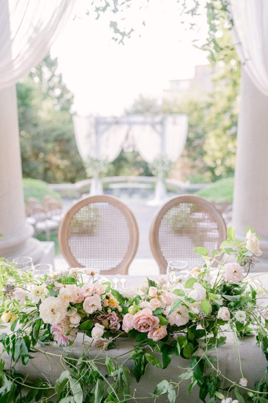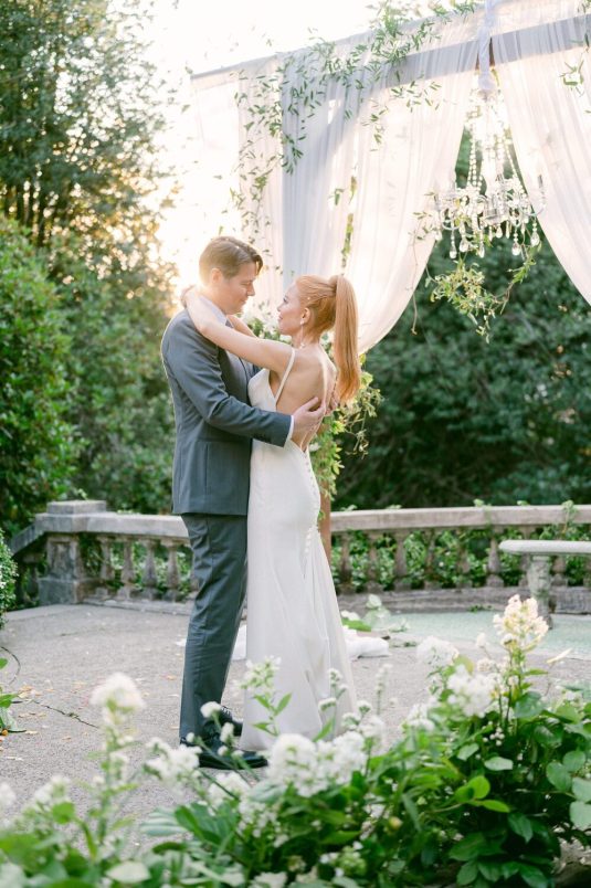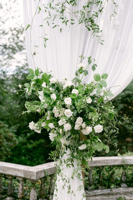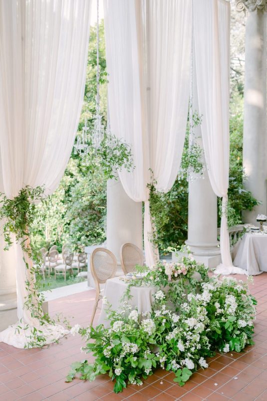 The ceremony took place on the terrace’s Juliet balcony, overlooking the garden. Myrtle et Olive created a ceremony arch resembling a window, with double white draping pulled back by two lush floral clusters on either side. A crystal chandelier hung in the center, completing the frame. Officiant Kevan Dobsin of Designer Ceremonies led the ceremony which the couple personalized with quotes from Shakespeare and George Eliot.