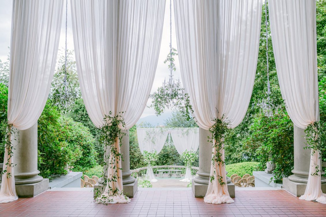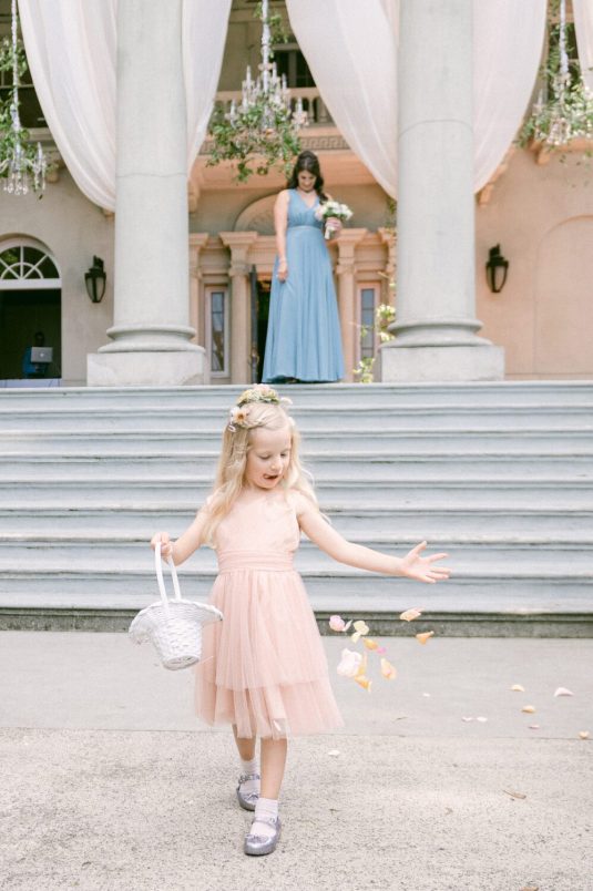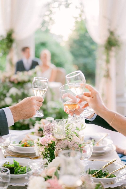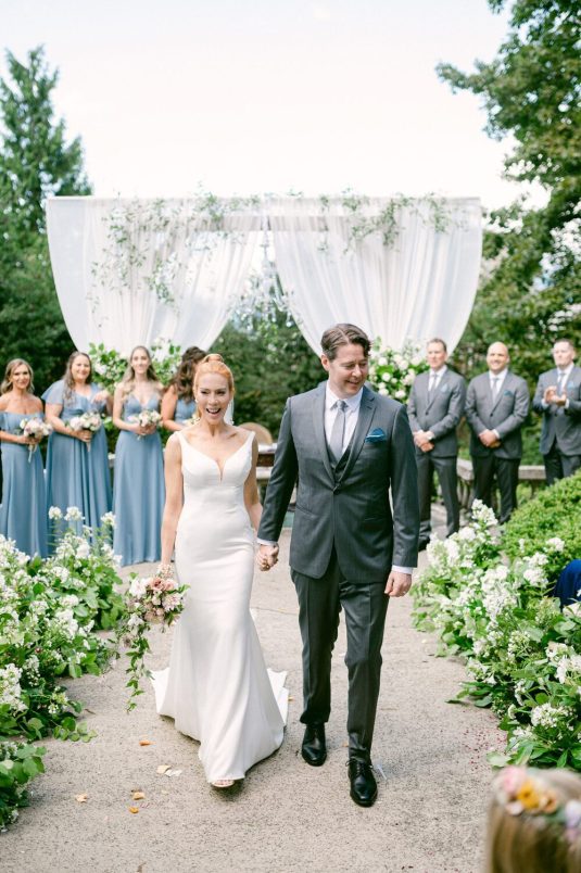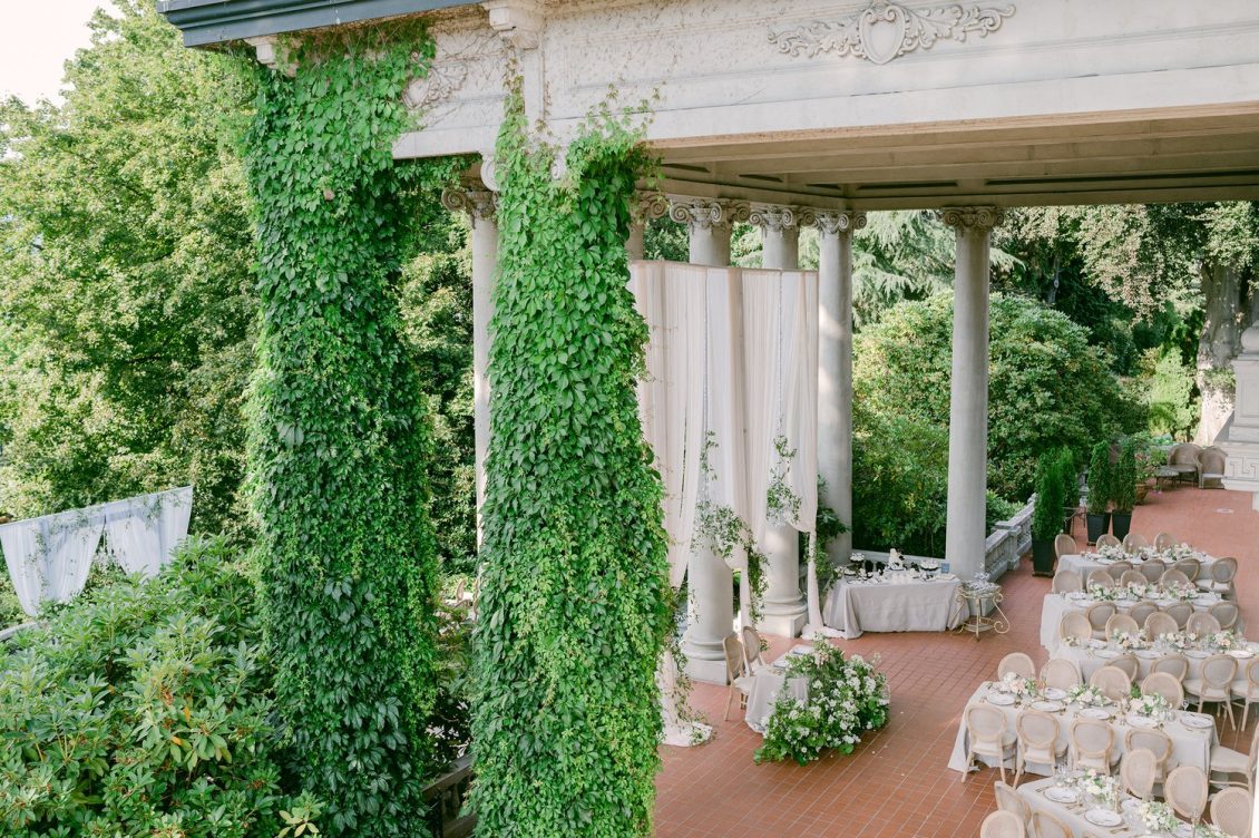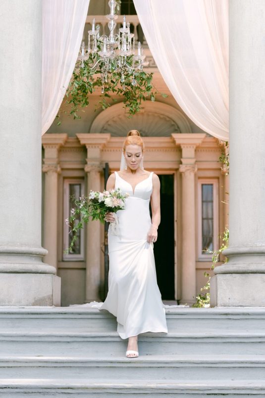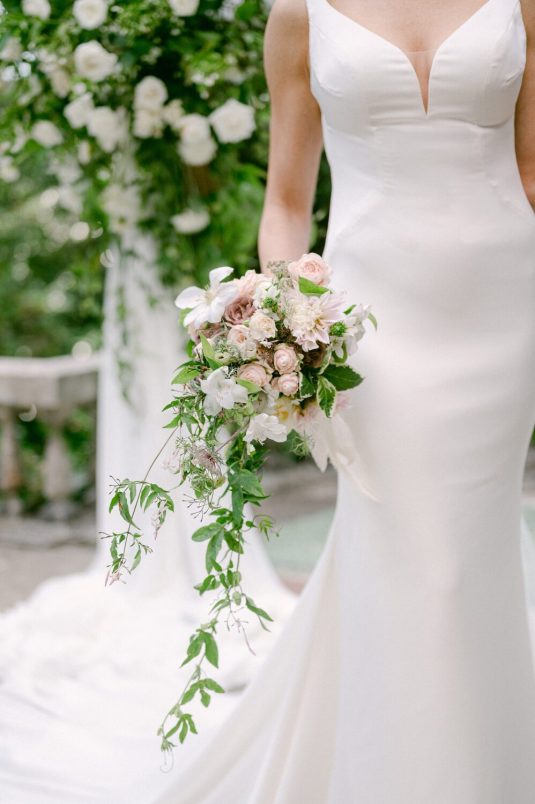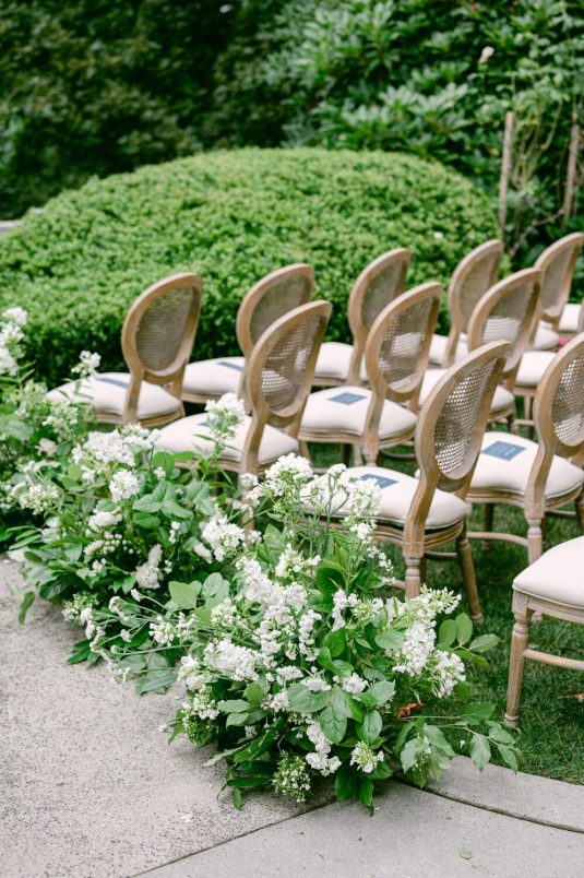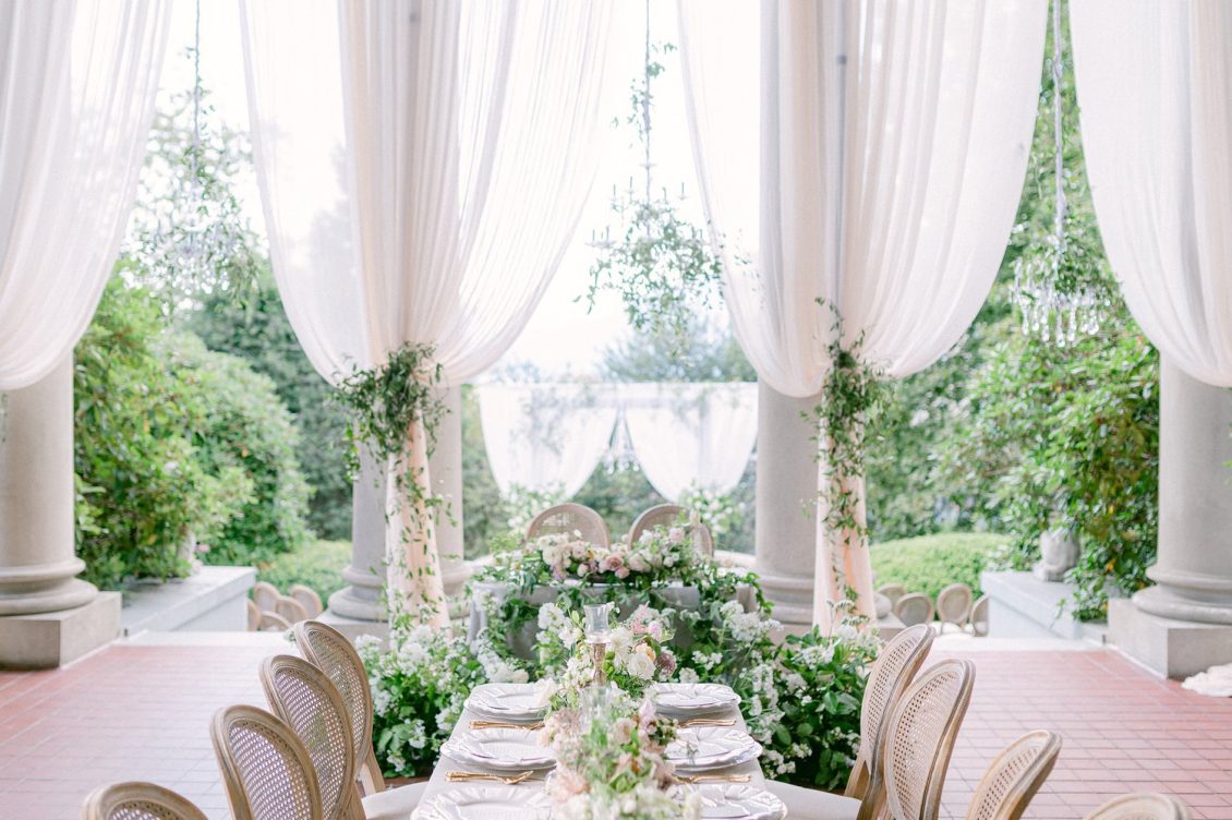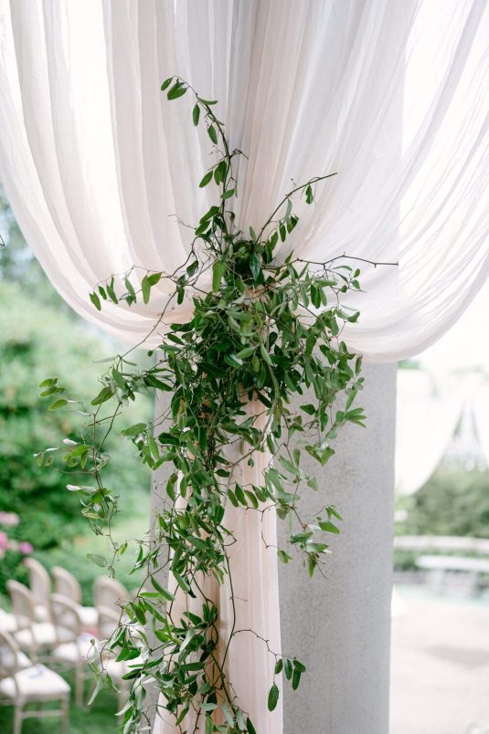 The ceremony took place on the terrace’s Juliet balcony, overlooking the garden. Myrtle et Olive created a ceremony arch resembling a window, with double white draping pulled back by two lush floral clusters on either side. A crystal chandelier hung in the center, completing the frame. Officiant Kevan Dobsin of Designer Ceremonies led the ceremony which the couple personalized with quotes from Shakespeare and George Eliot.
