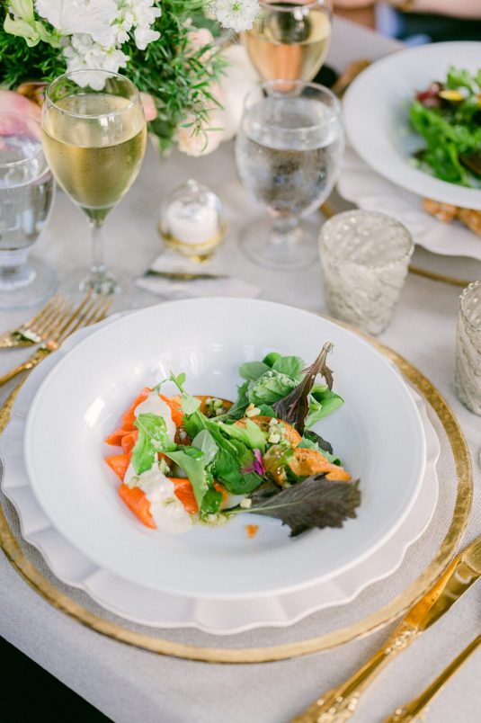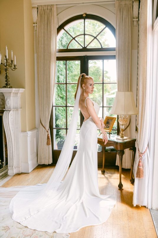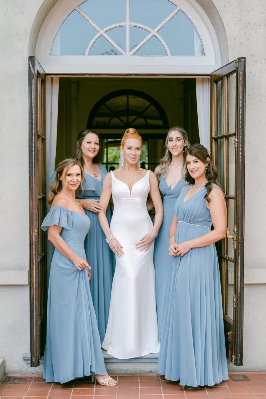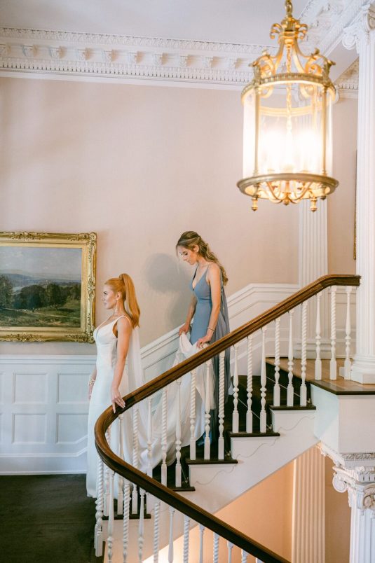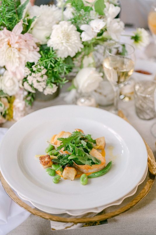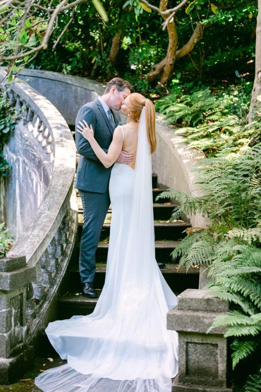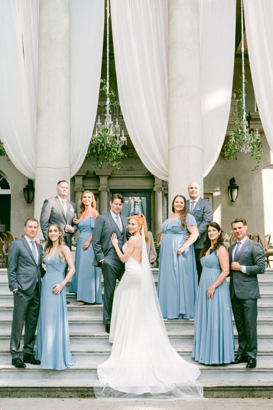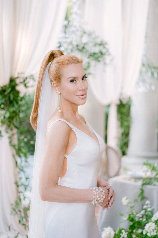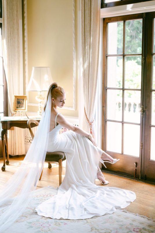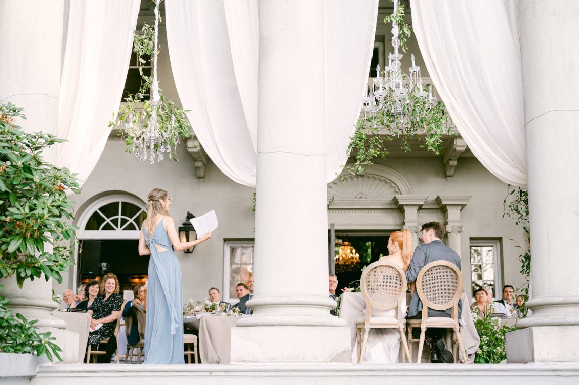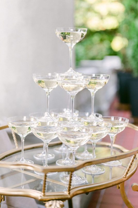 The ceremony took place on the terrace’s Juliet balcony, overlooking the garden. Myrtle et Olive created a ceremony arch resembling a window, with double white draping pulled back by two lush floral clusters on either side. A crystal chandelier hung in the center, completing the frame. Officiant Kevan Dobsin of Designer Ceremonies led the ceremony which the couple personalized with quotes from Shakespeare and George Eliot.