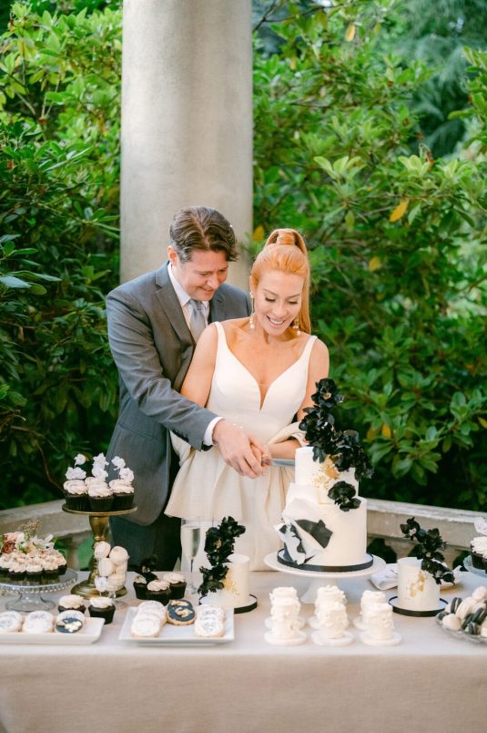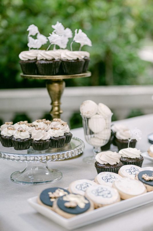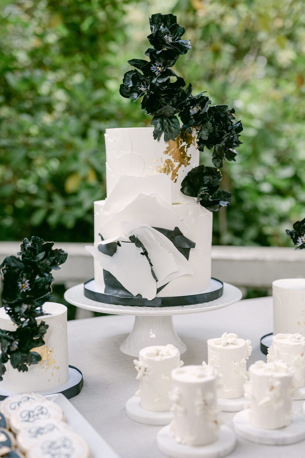Cake by Nicole designed a two tier wedding cake finished in white butter cream with cascading black sugar flowers and gold leaf detailing. She also provided the desserts which included calligraphed cookies and macarons, cupcakes, and champagne towers.