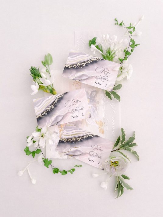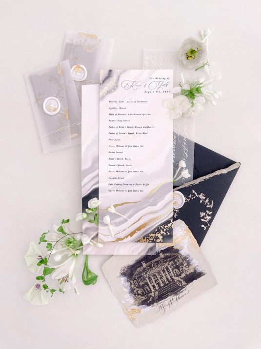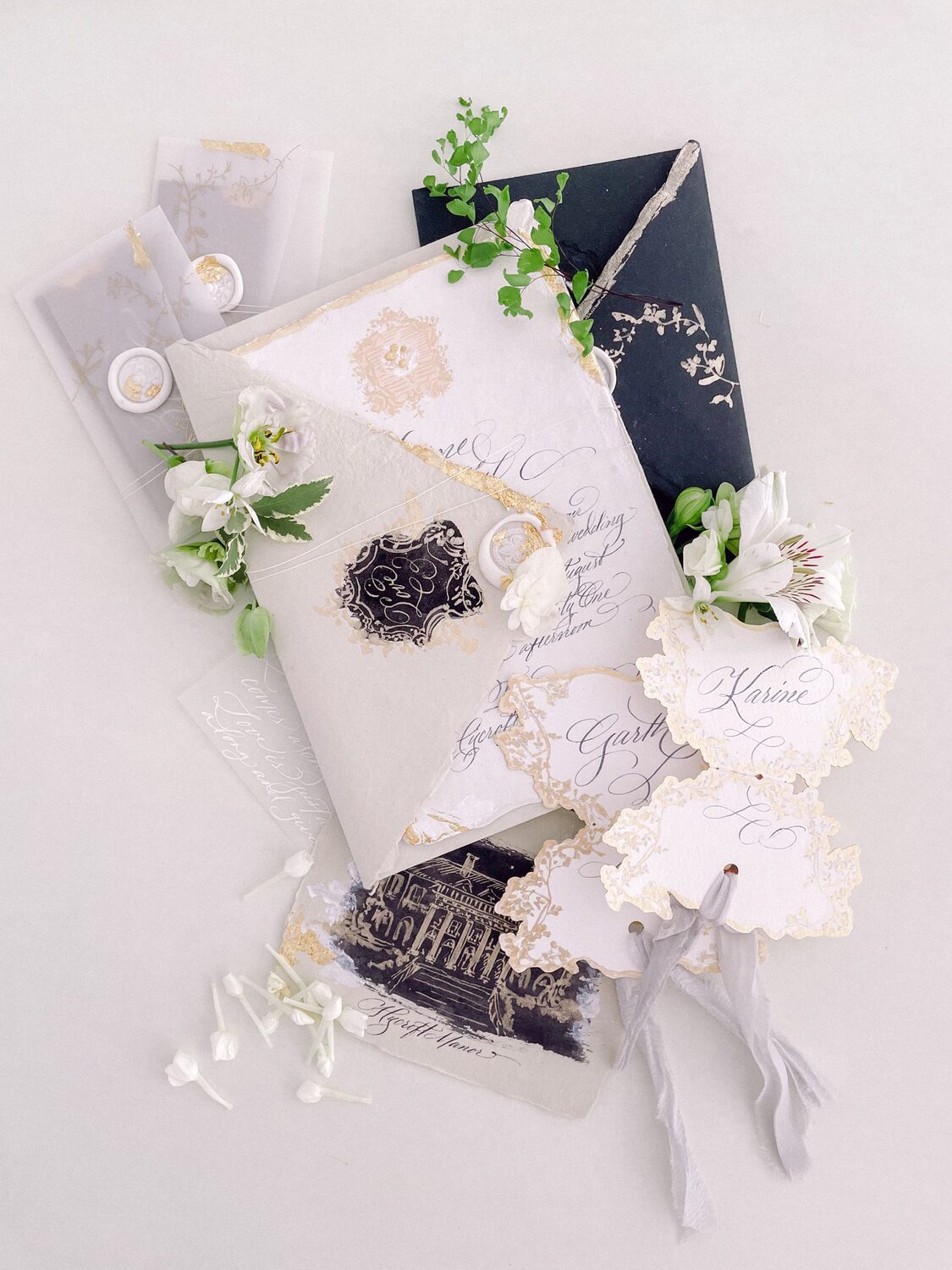 Veronica Halim created all of the stationery for the day, combining classic calligraphy with a contemporary touch of gold and black accents.
