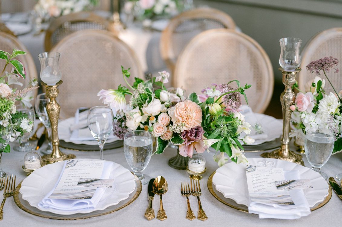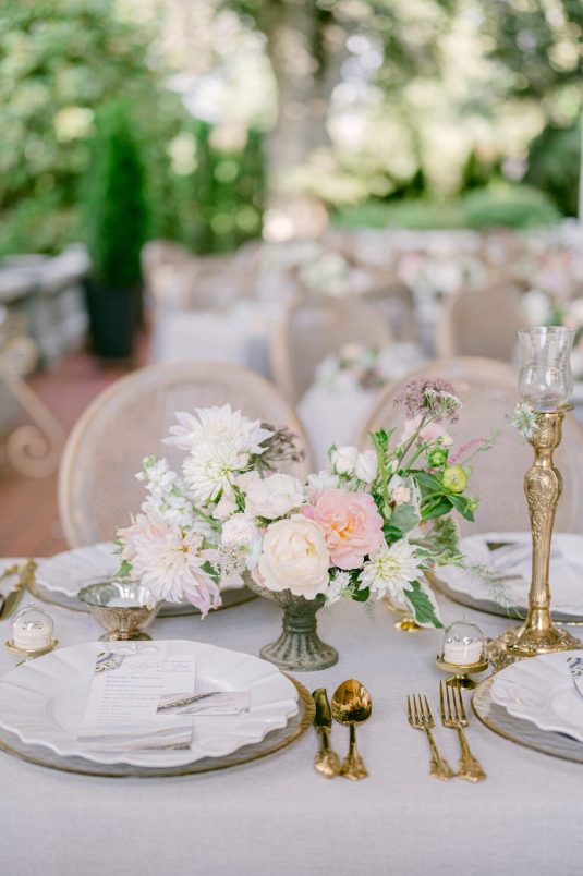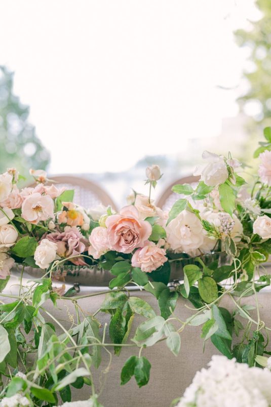 Myrtle et Olive added to the charm with loose centerpieces comprising roses, peonies, and dahlias in varying heights, and contrasting shades of light pastels and darker dusty hues. Each one sat in a low iron vase and was finished with the same loose vine and foliage used in the sweetheart table and ceremony design.