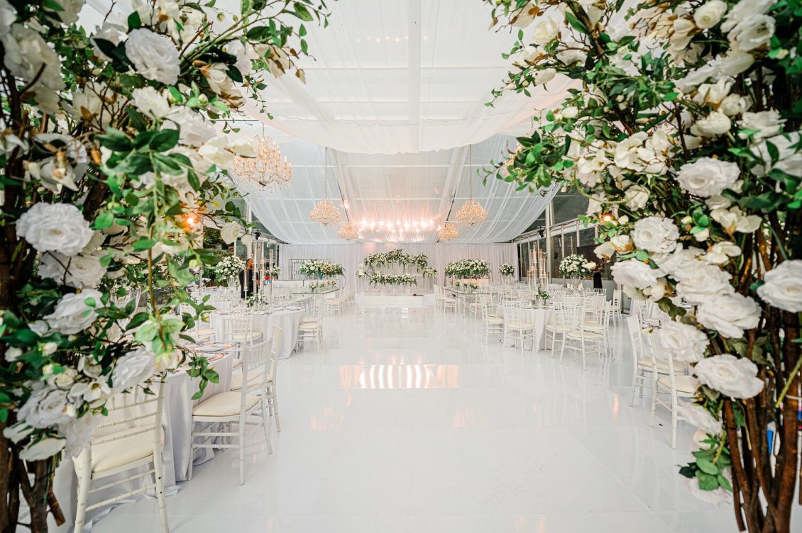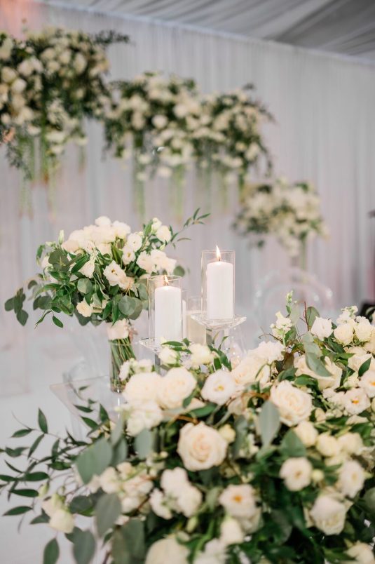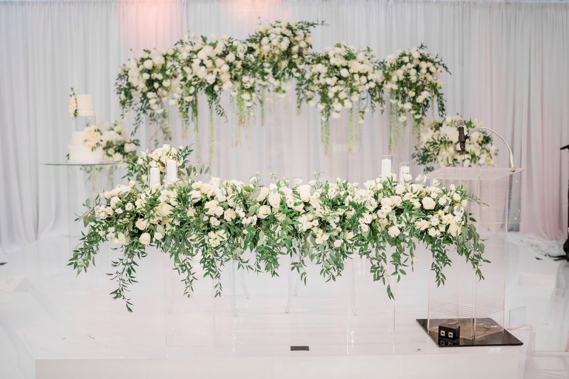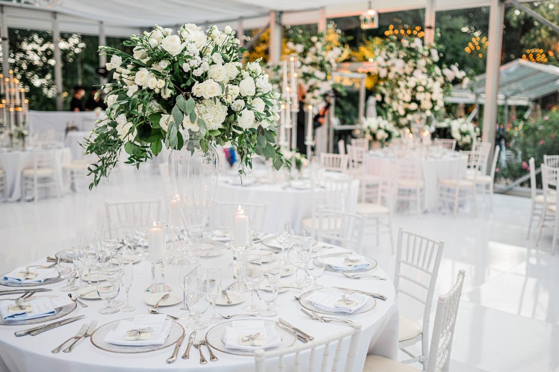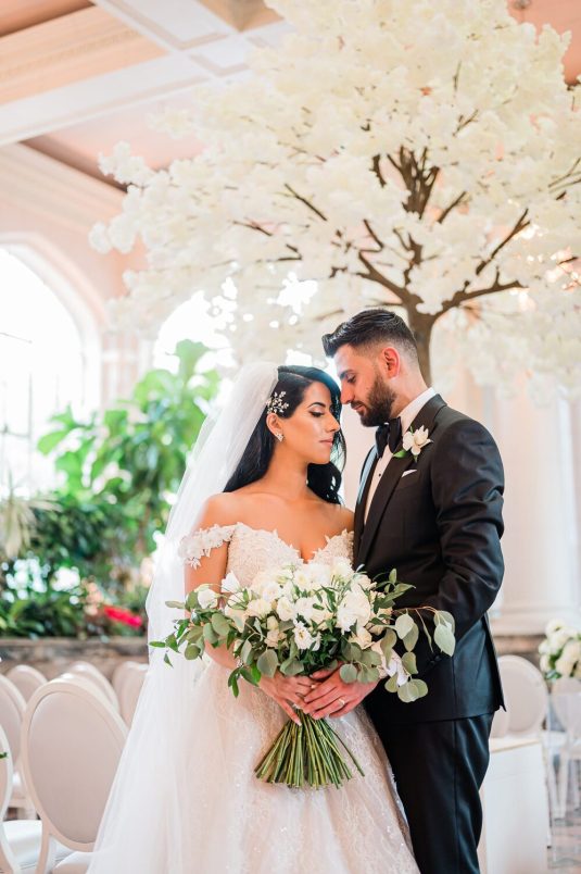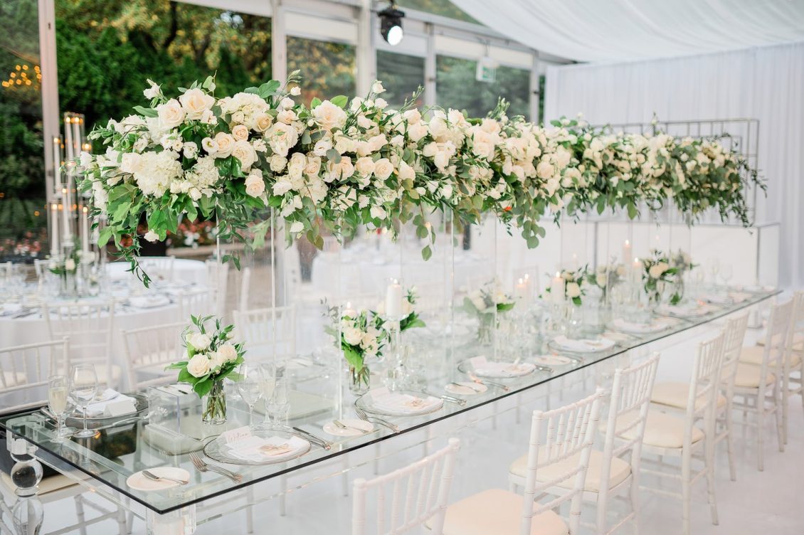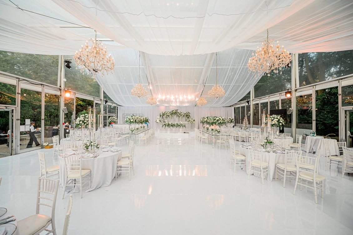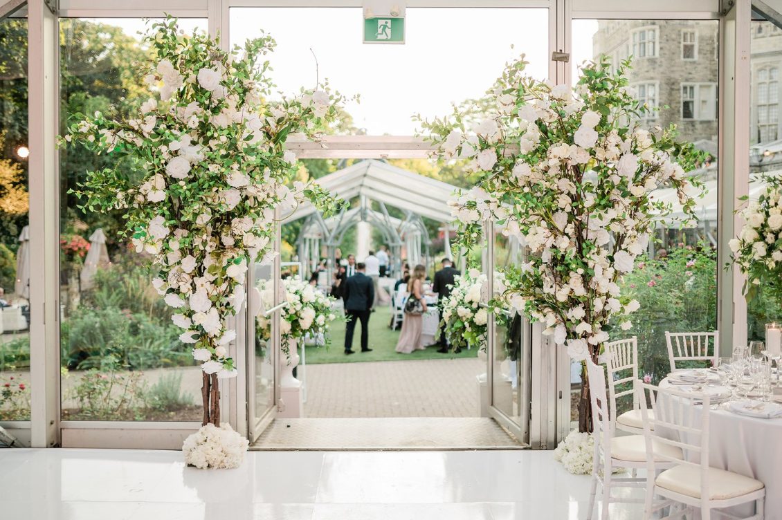 Julia and Robert’s blissful white wedding reception at Casa Loma’s Glass Pavilion was wreathed in white roses, overflowing greenery, and adorned with lush floral trees—creating the feeling of a modern yet ethereal garden. A true fairytale happily ever after!