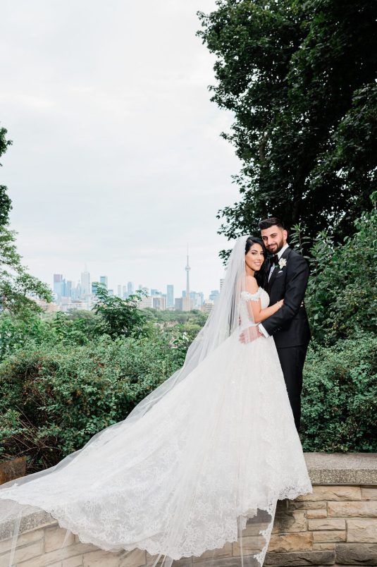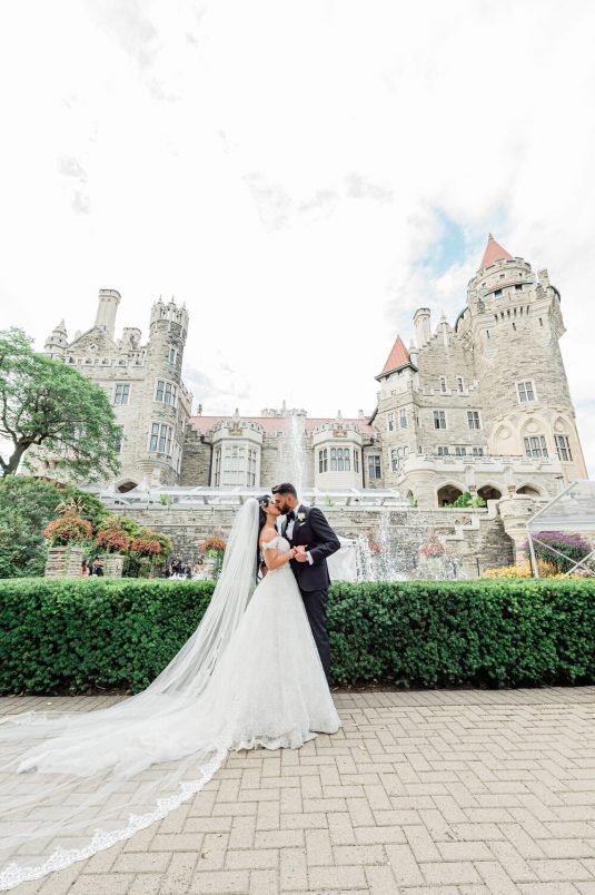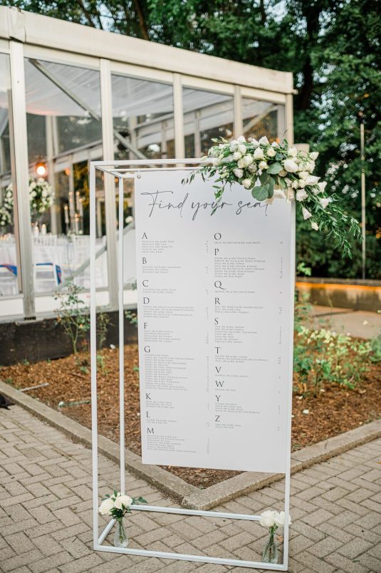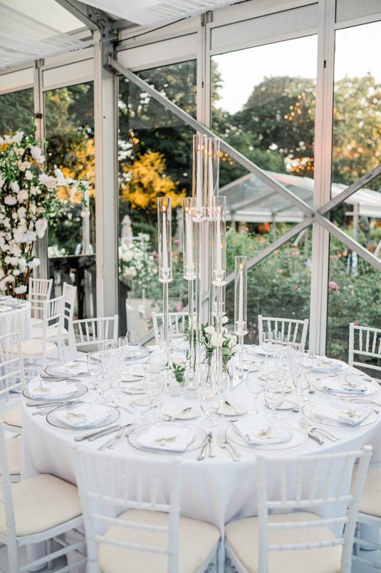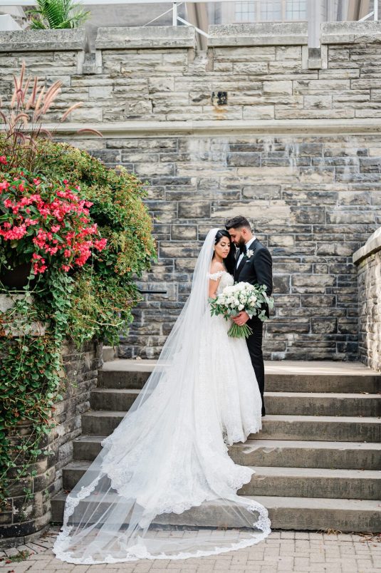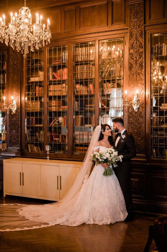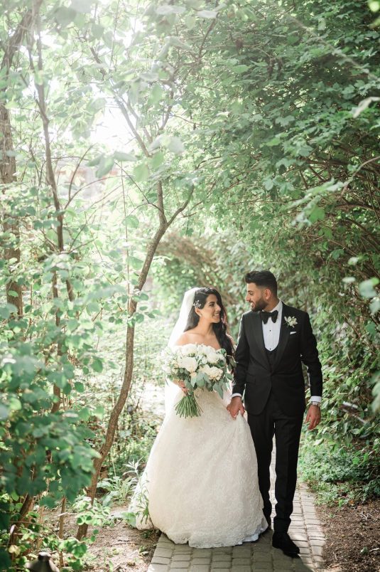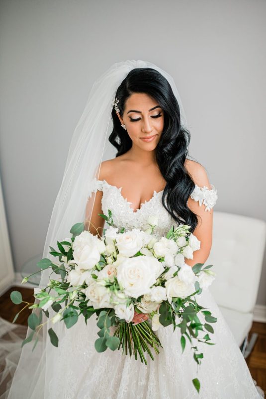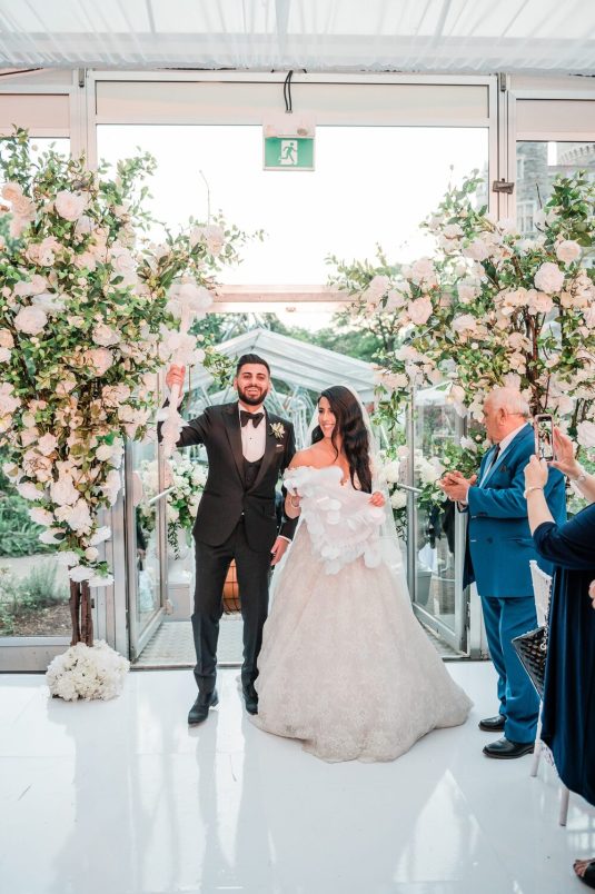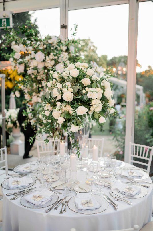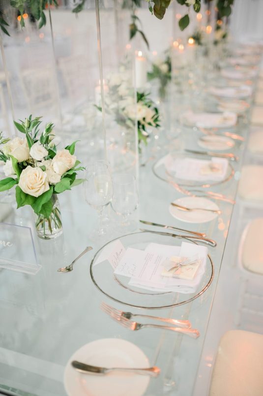 Julia and Robert’s blissful white wedding reception at Casa Loma’s Glass Pavilion was wreathed in white roses, overflowing greenery, and adorned with lush floral trees—creating the feeling of a modern yet ethereal garden. A true fairytale happily ever after!