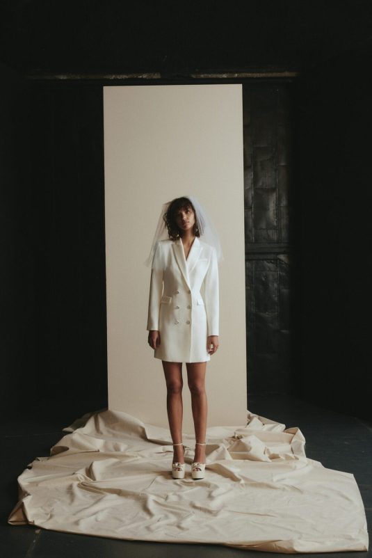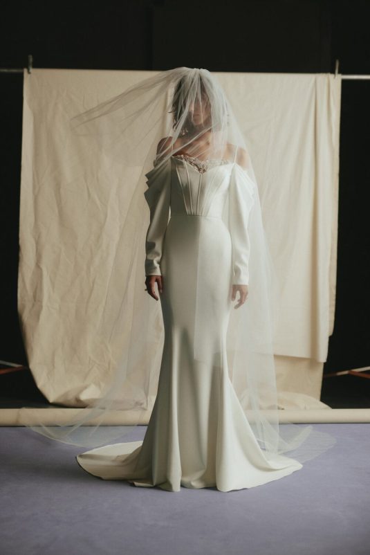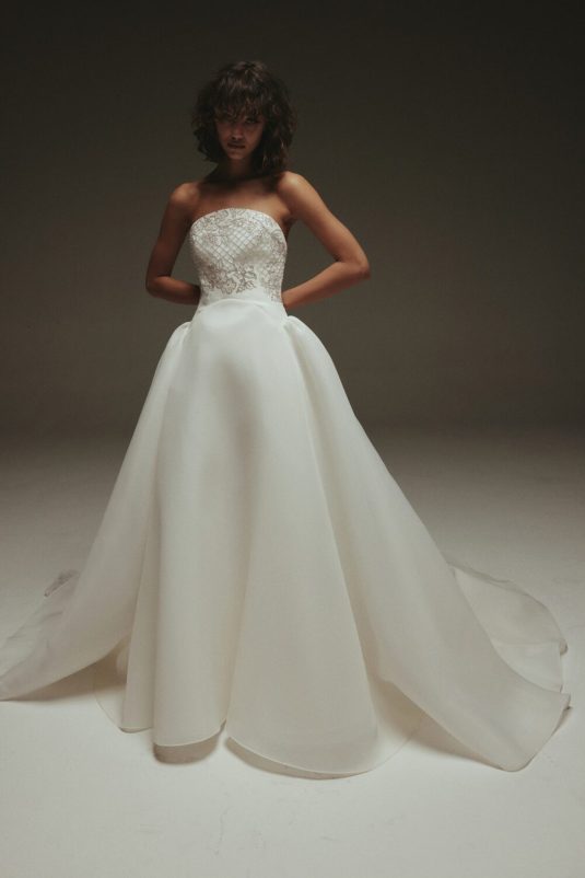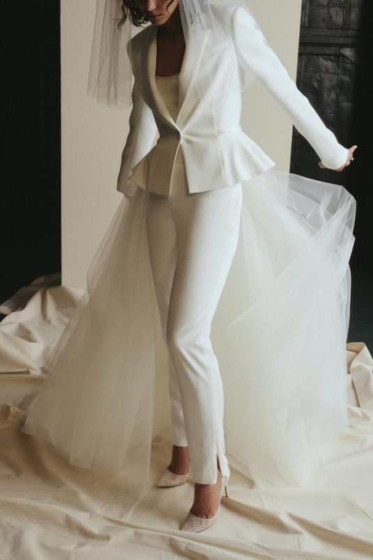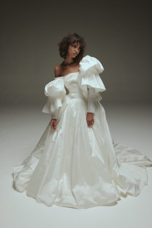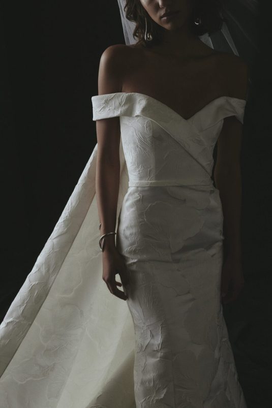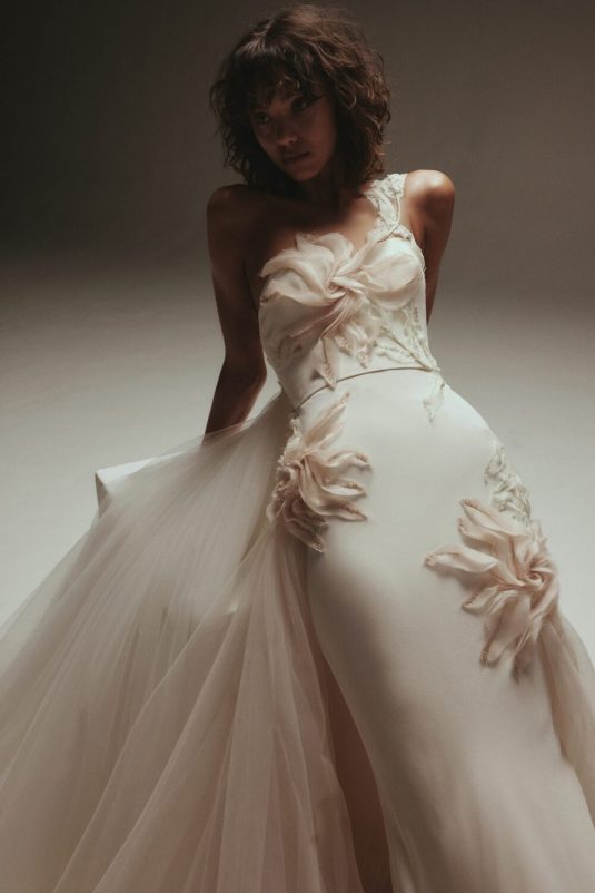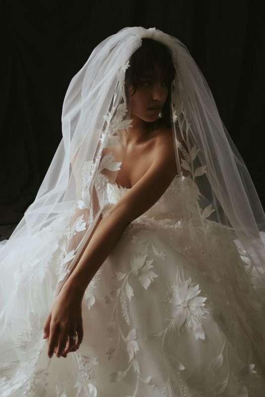 It’s New York Luxury Bridal Fashion Week and we’re starting the day with Amsale’s Spring 2023 collection! These stunning gowns draw inspiration from the romantic smoky atmosphere of old jazz clubs: a dark room with the star lit by a gleaming spotlight like a blossoming nocturnal flower. Florals such as the moonflower and Queen of the Night spread across the tailored pieces while fabrics drape as if swathed in moonlight.