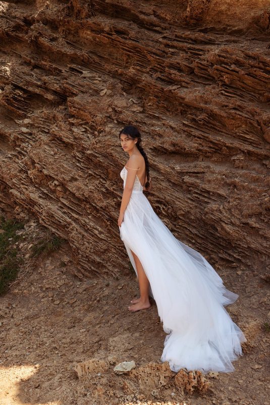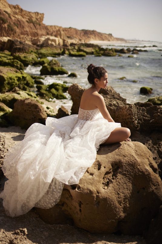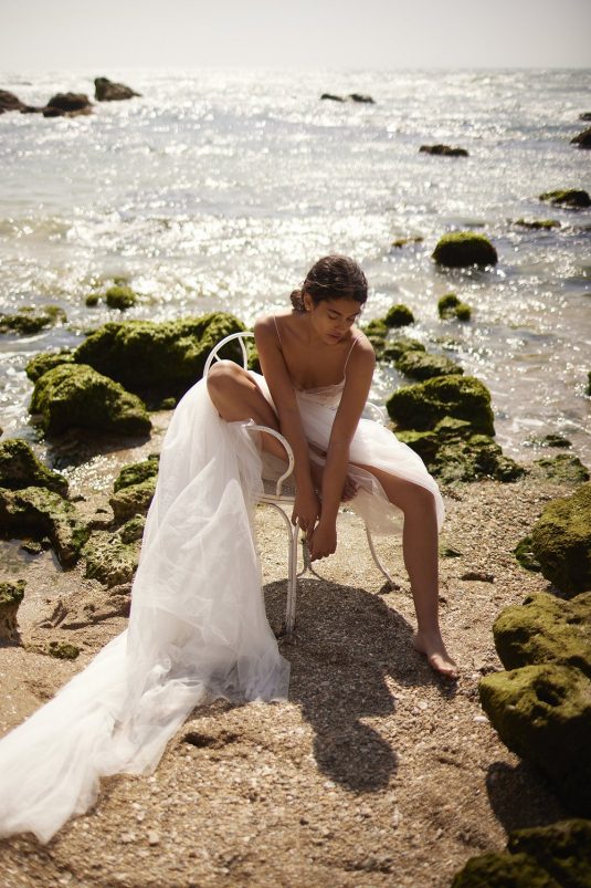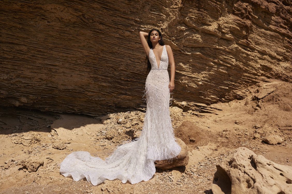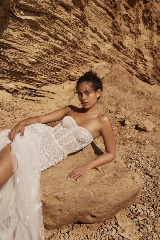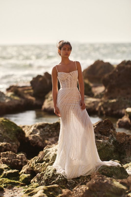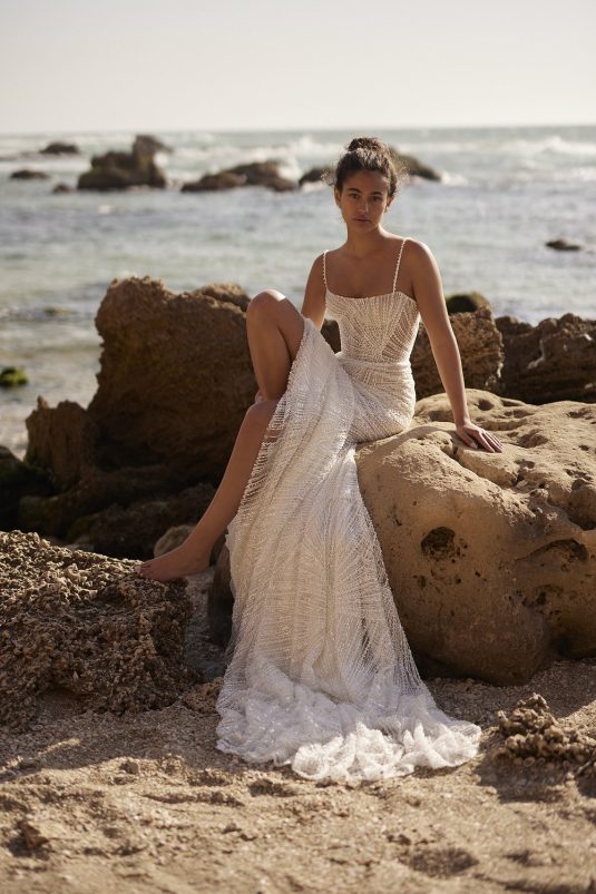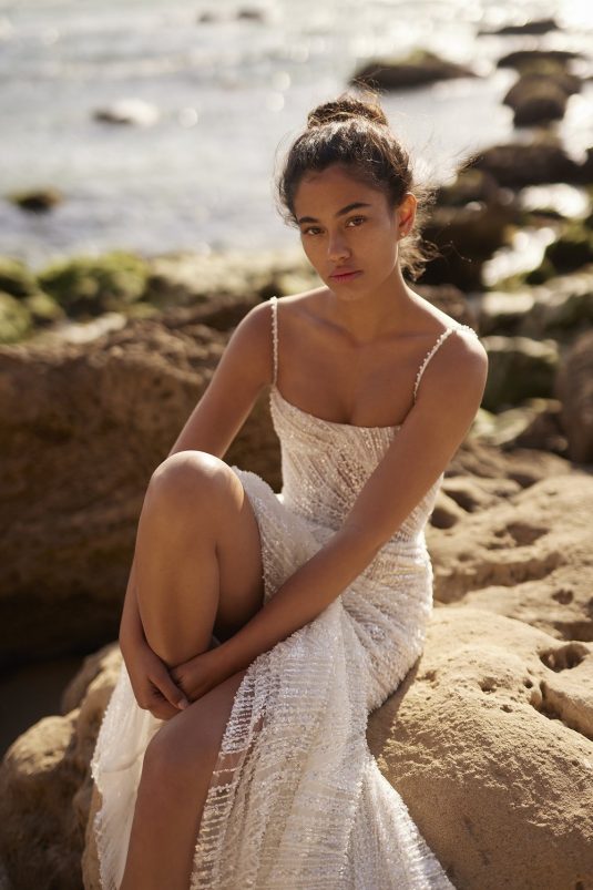 A powerful water goddess serenely walking beside a shimmering sea is the image evoked with Dana Harel’s new spring collection, “Acqua.” With corseted dresses and mermaid gowns adorned with pearls, beads, and Swarovski crystals, this dreamy collection is a celebration of life, creativity, and freedom.