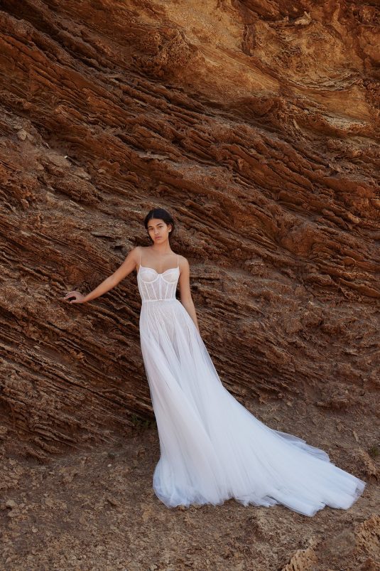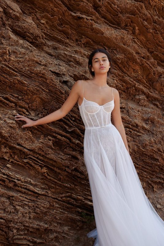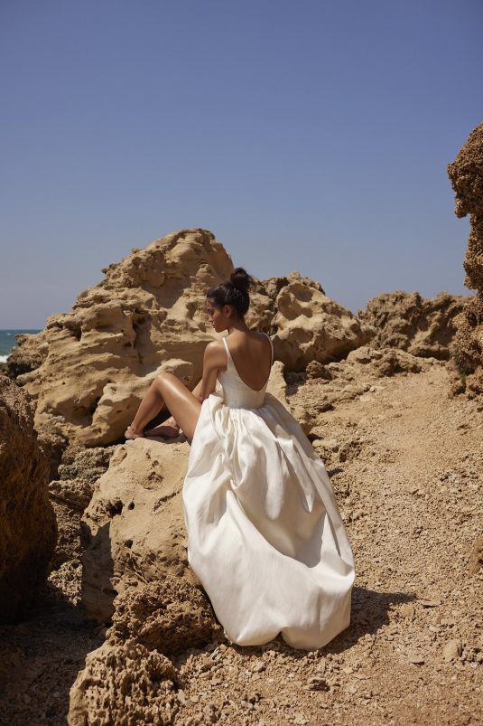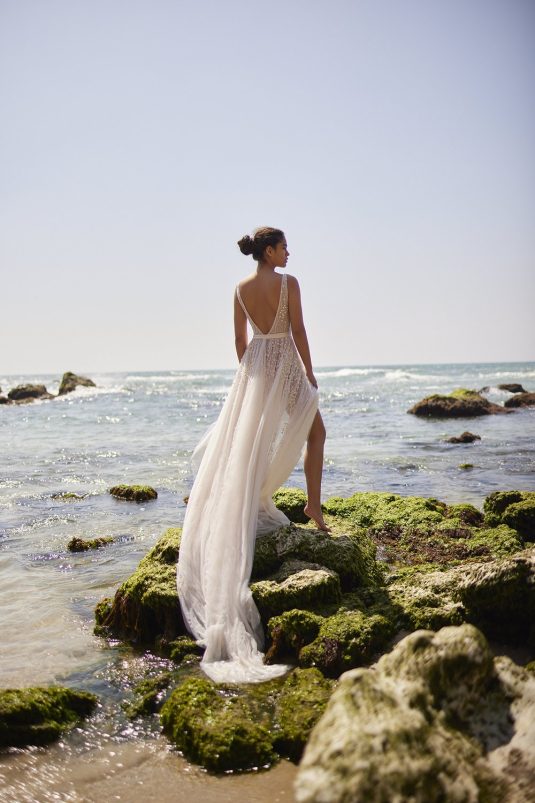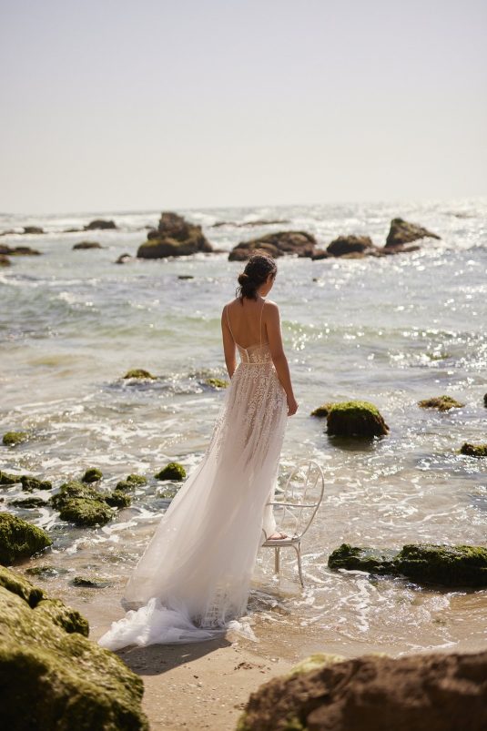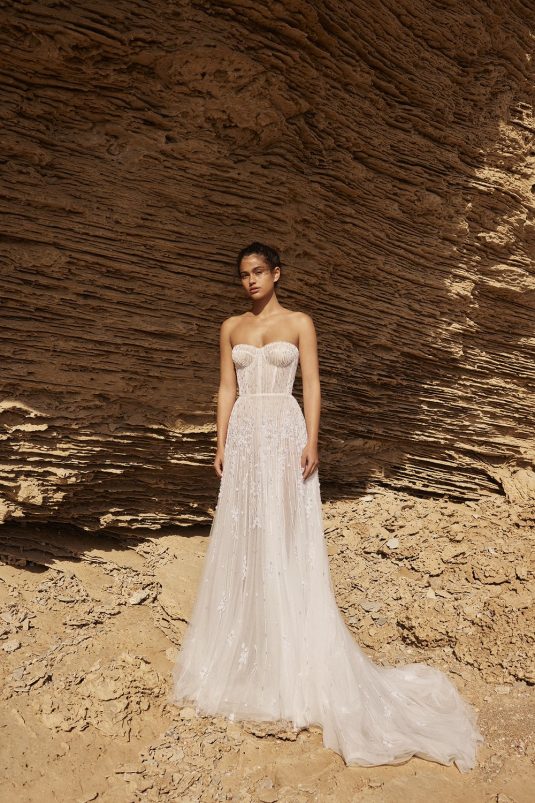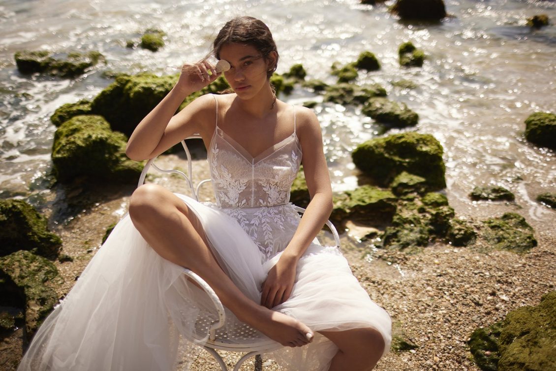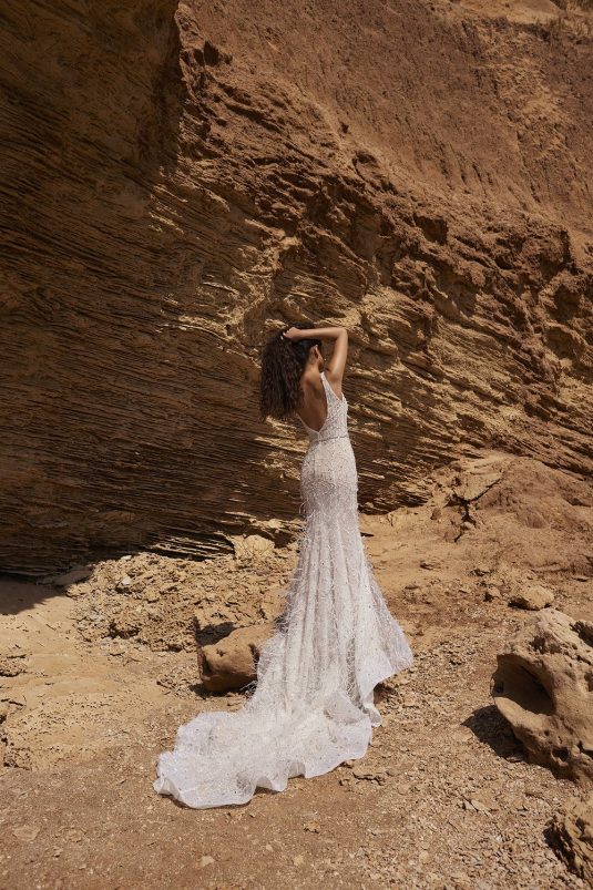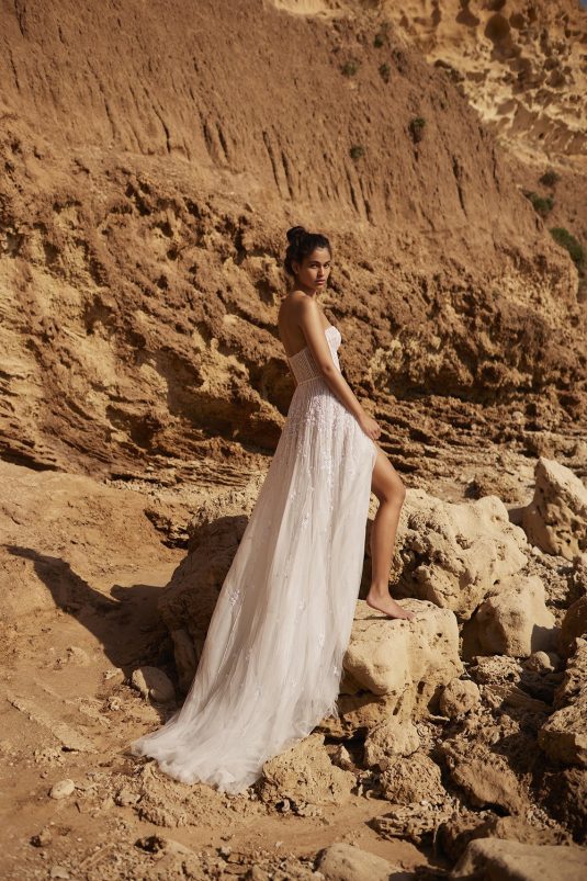 A powerful water goddess serenely walking beside a shimmering sea is the image evoked with Dana Harel’s new spring collection, “Acqua.” With corseted dresses and mermaid gowns adorned with pearls, beads, and Swarovski crystals, this dreamy collection is a celebration of life, creativity, and freedom.