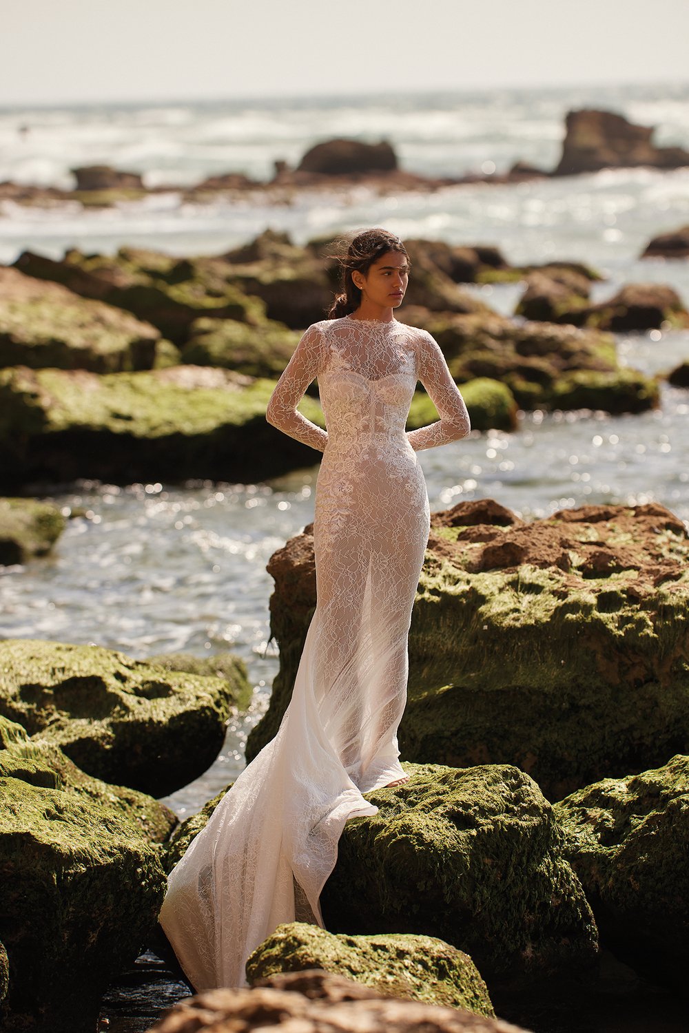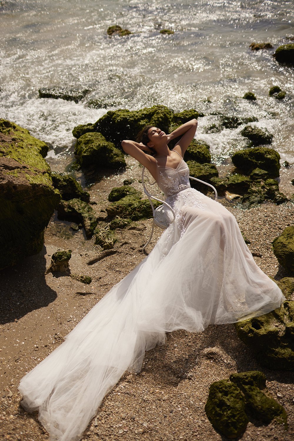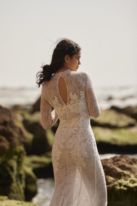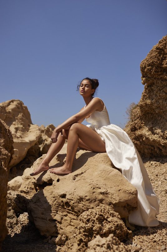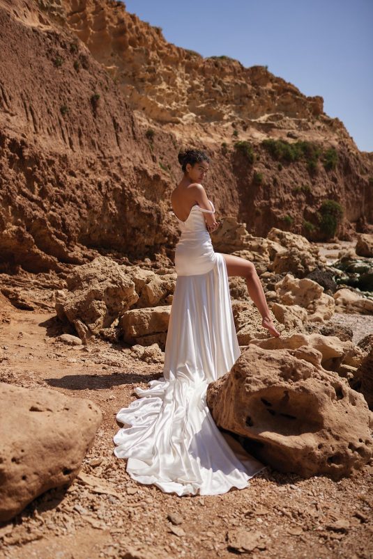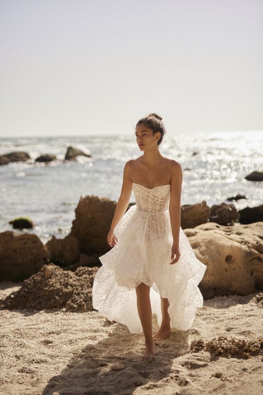 A powerful water goddess serenely walking beside a shimmering sea is the image evoked with Dana Harel’s new spring collection, “Acqua.” With corseted dresses and mermaid gowns adorned with pearls, beads, and Swarovski crystals, this dreamy collection is a celebration of life, creativity, and freedom.