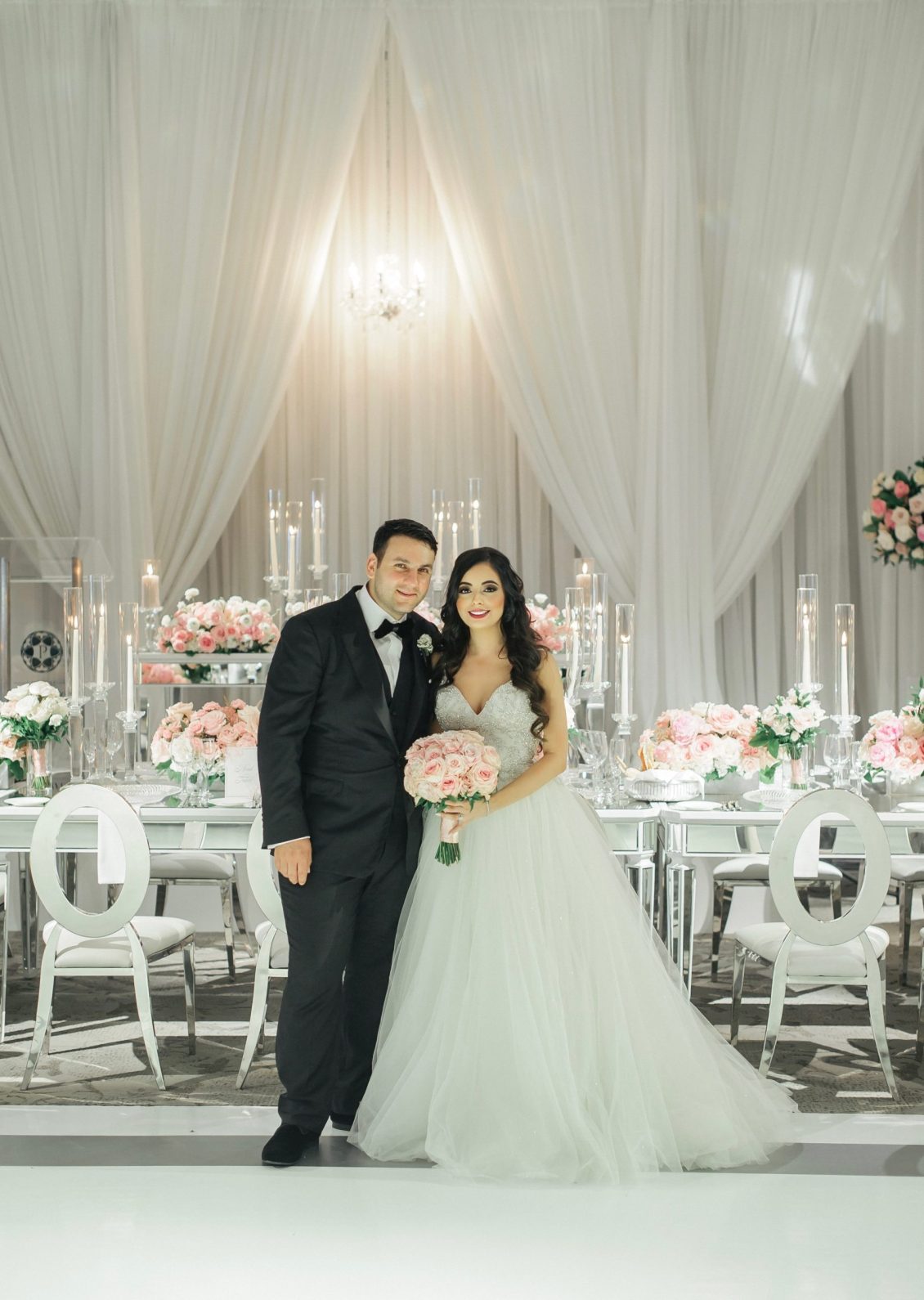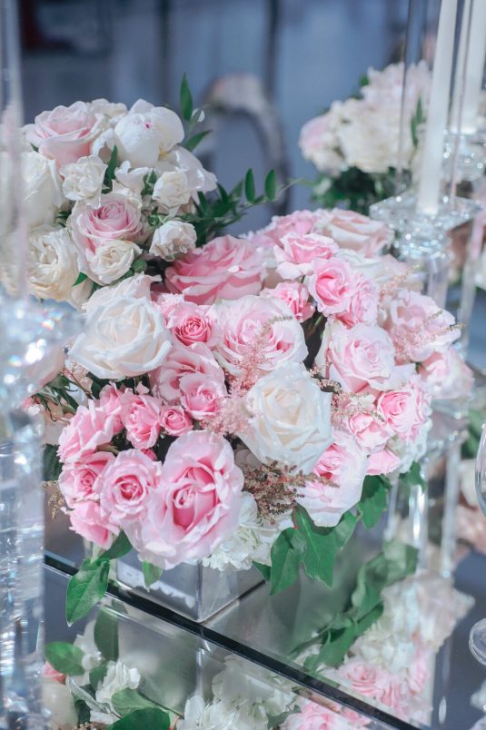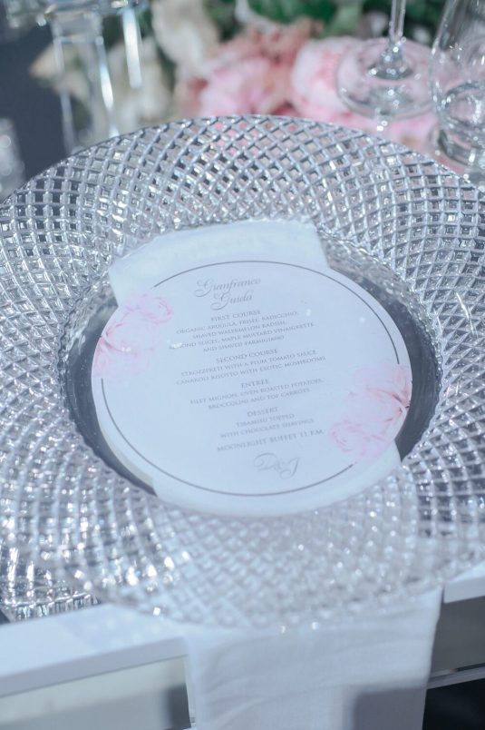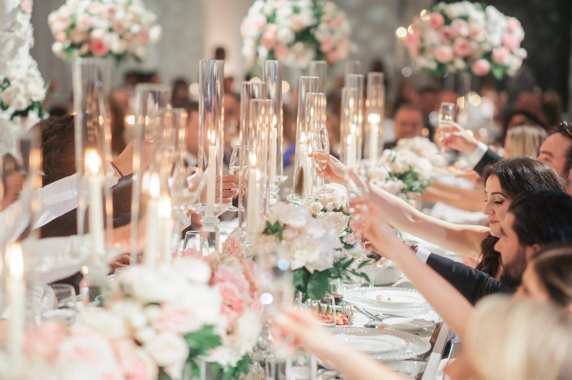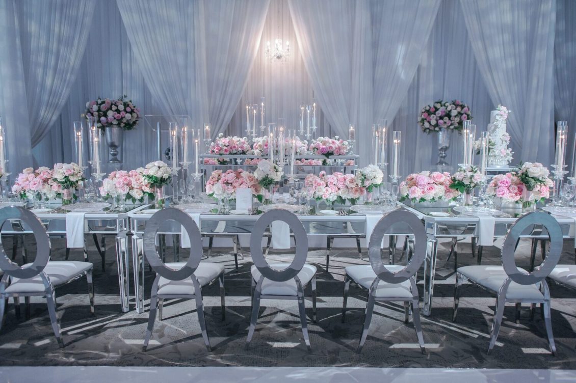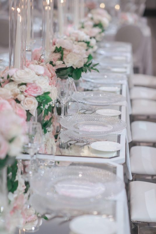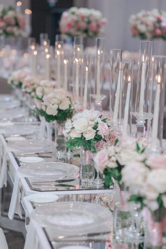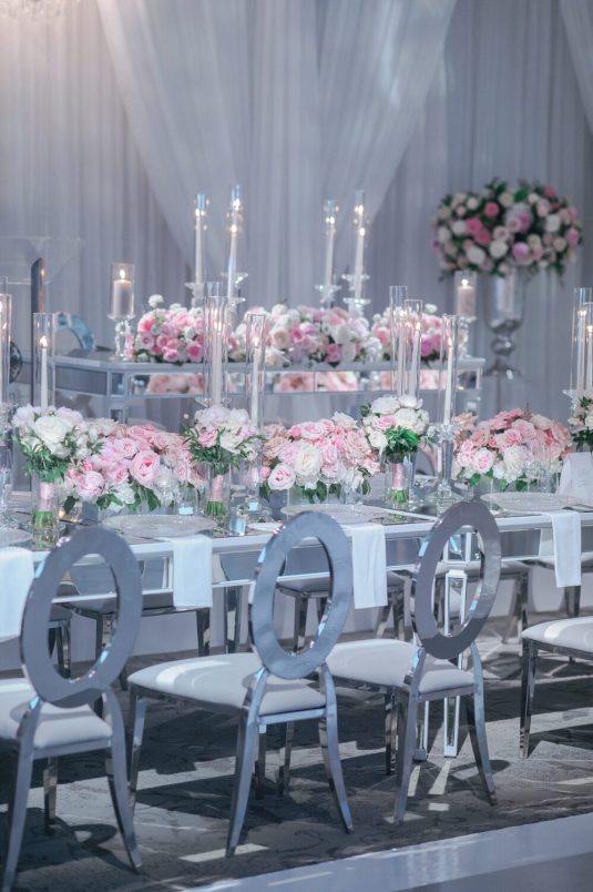 Everything was sparkling and magical at Diana and James’s modern yet classic reception. Beautiful soft pink and ivory florals adorned tabletops alongside crystal glass candelabras and silver accents making the space shine with a true fairytale elegance! Scroll down to enjoy all the glittering details!