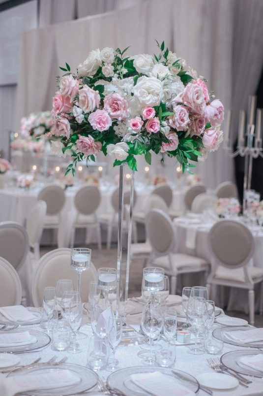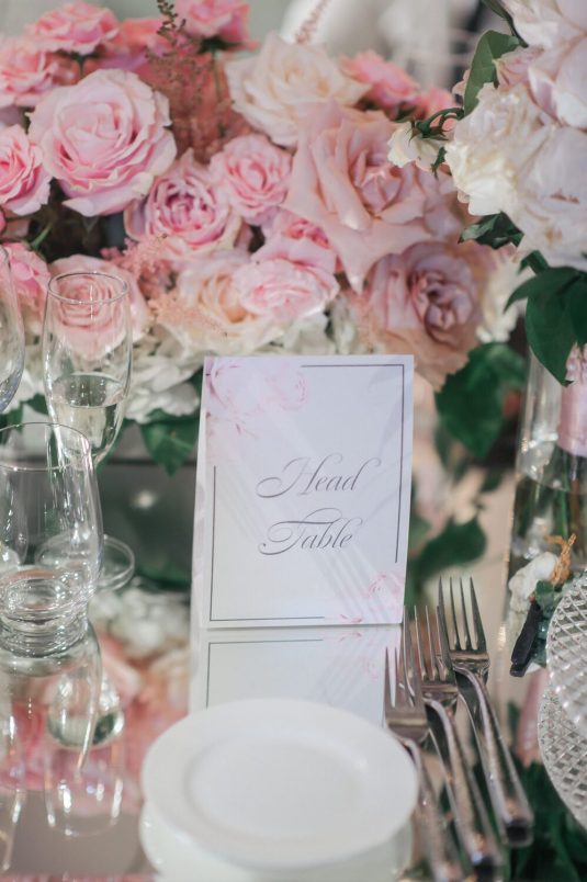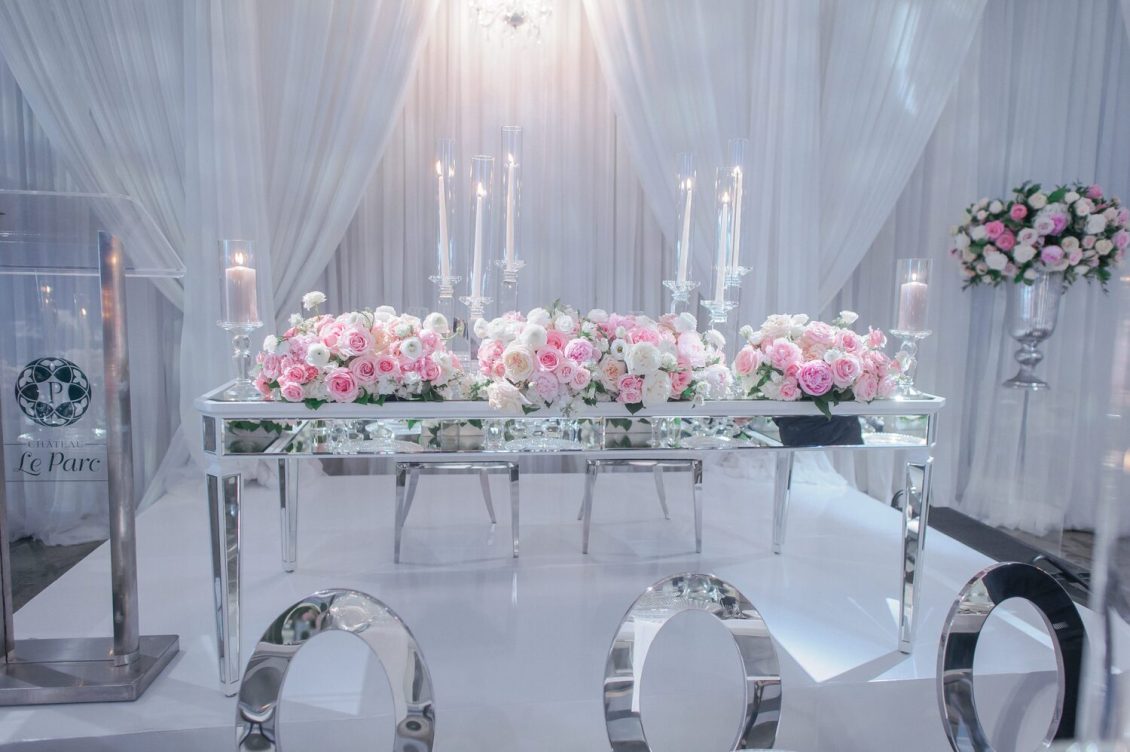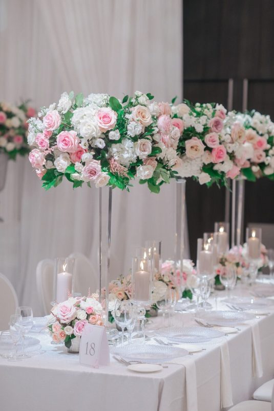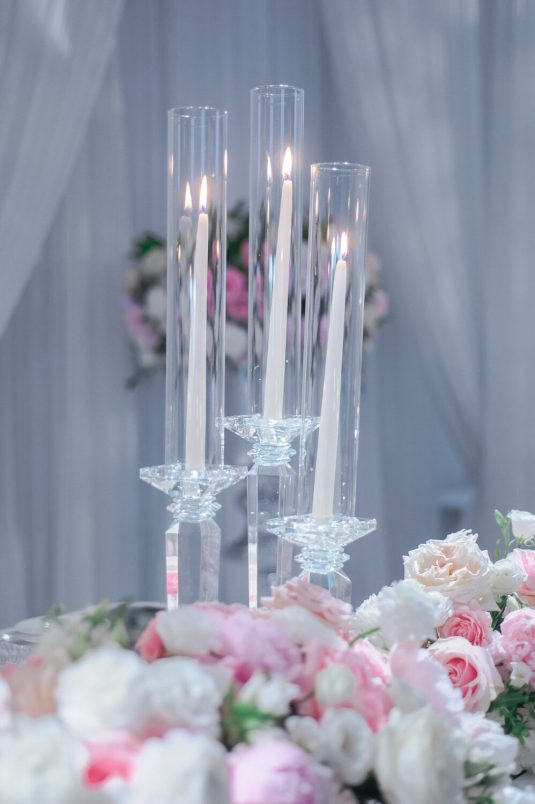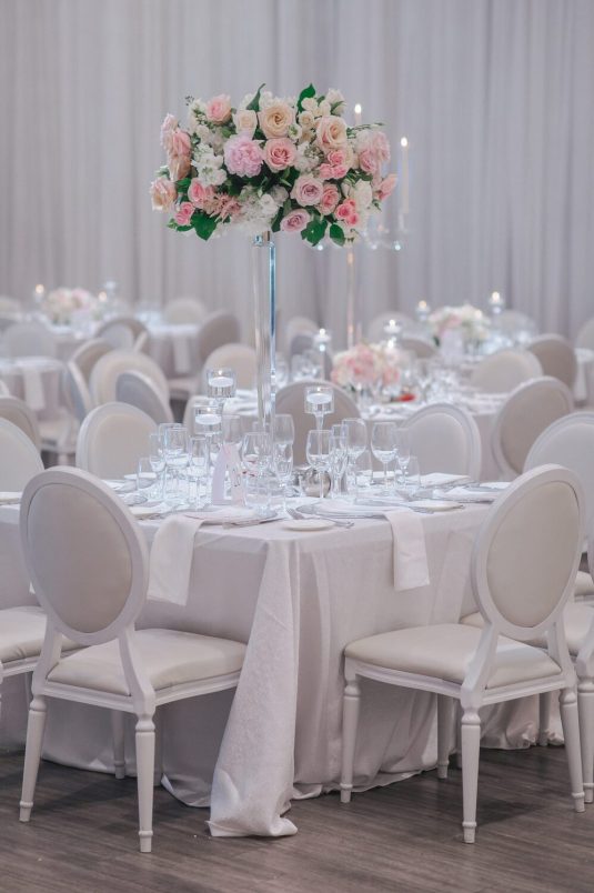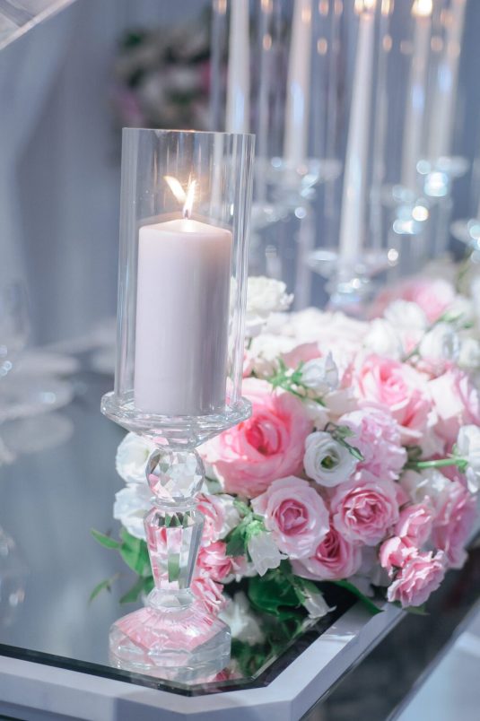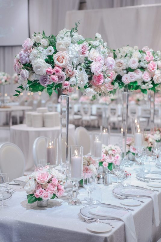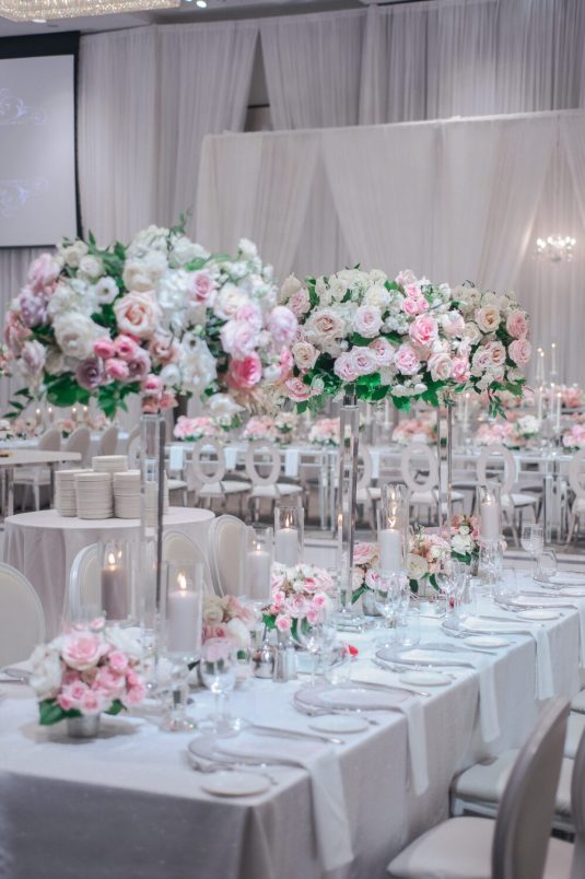 Everything was sparkling and magical at Diana and James’s modern yet classic reception. Beautiful soft pink and ivory florals adorned tabletops alongside crystal glass candelabras and silver accents making the space shine with a true fairytale elegance! Scroll down to enjoy all the glittering details!