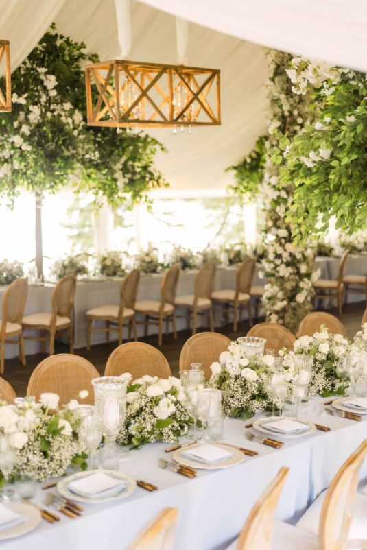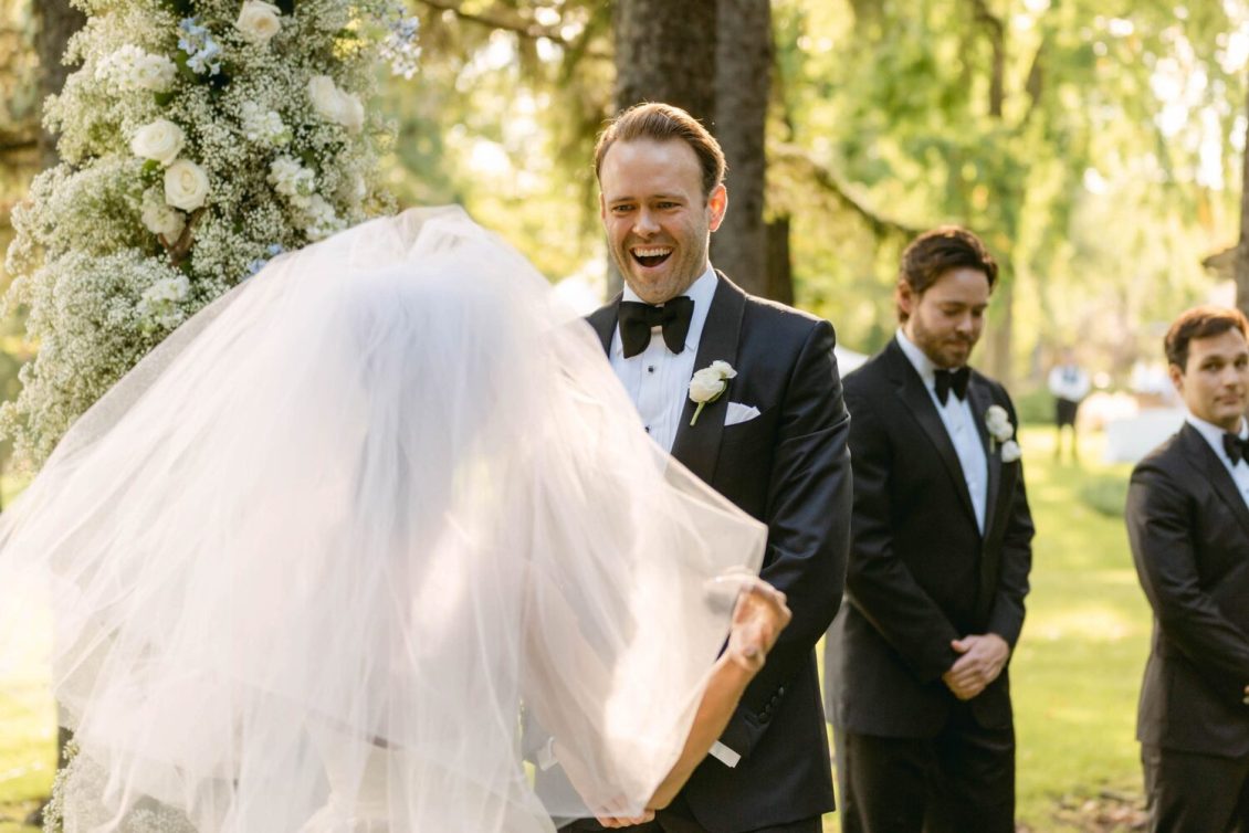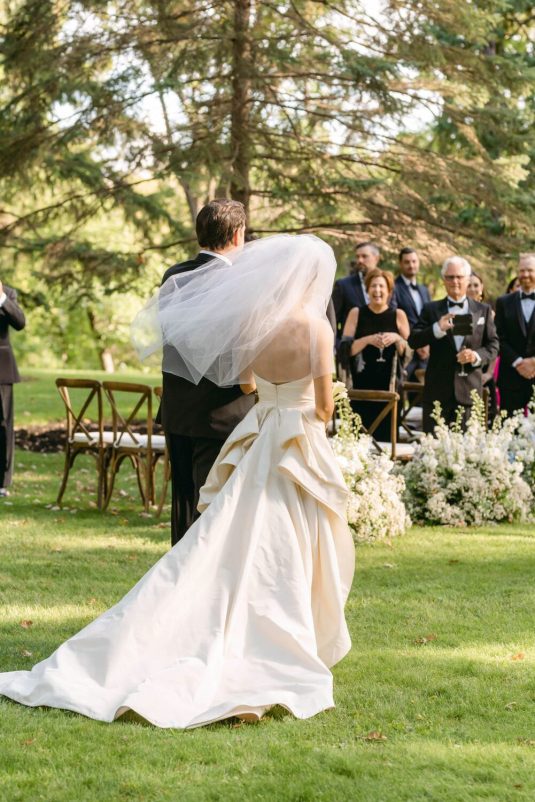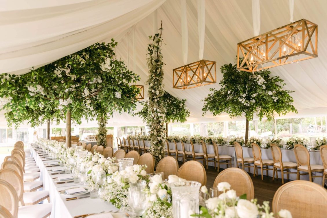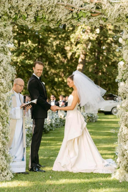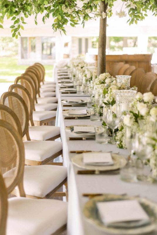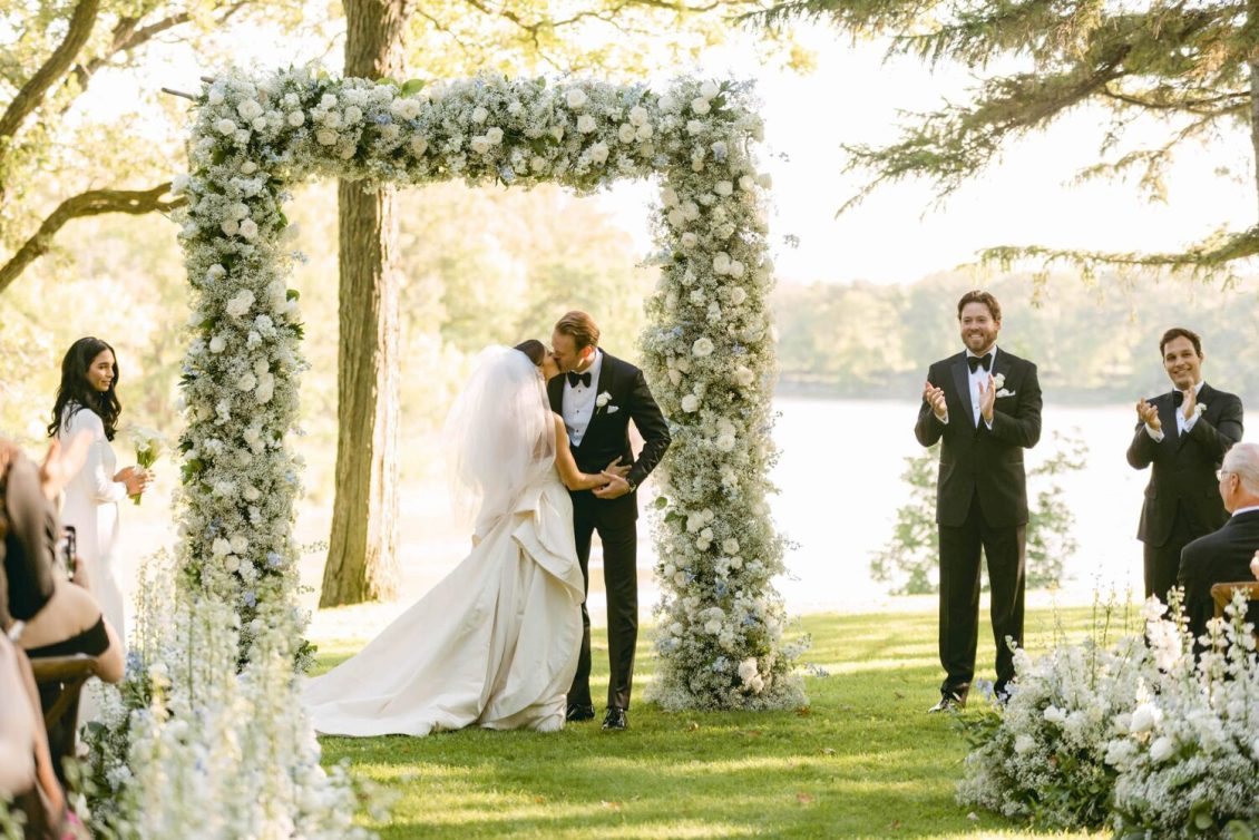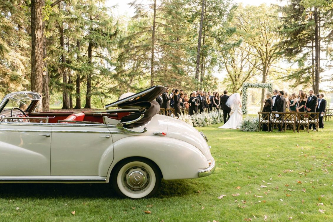 The couple exchanged their vows underneath an oversized floral arch overlooking the water. The plein-air woodland setting was also enhanced with a dramatic thirty-foot-long aisle. Natalie arrived in style to the ceremony with her father in a vintage family car. Vintage was a theme woven throughout the day in subtle ways including the bride’s vintage Oscar de la Renta wedding gown.