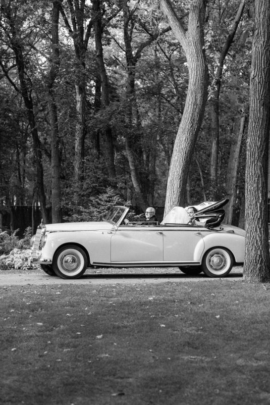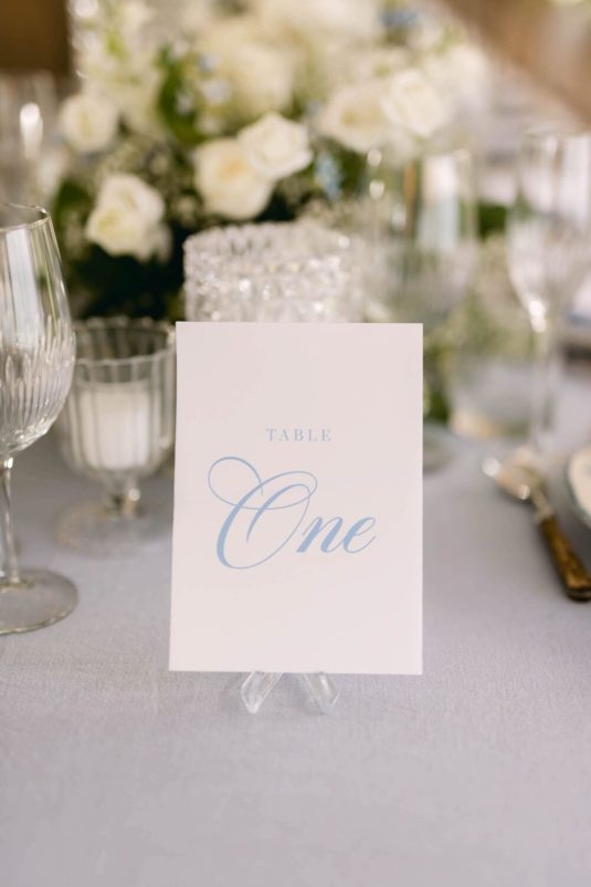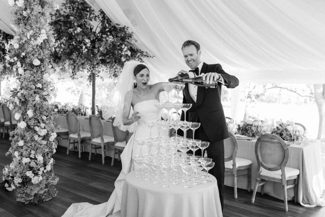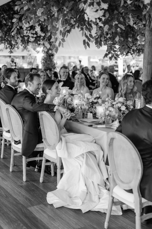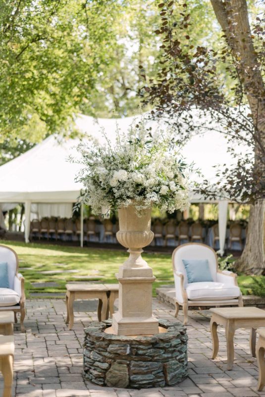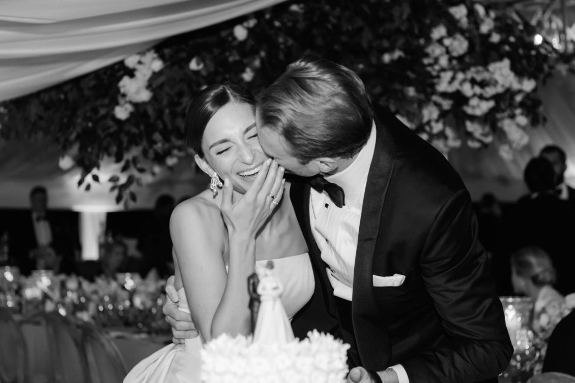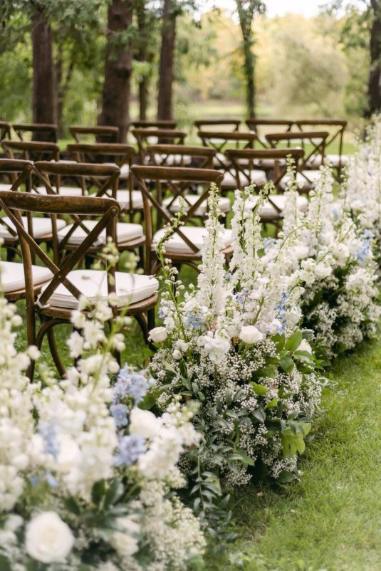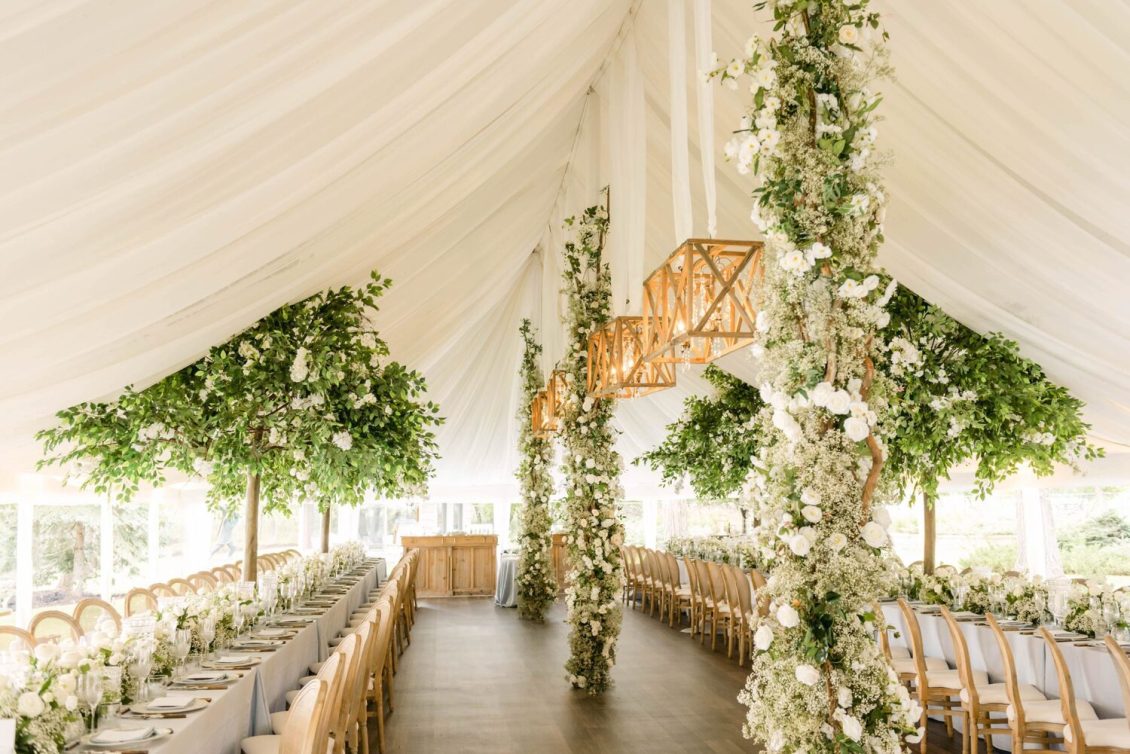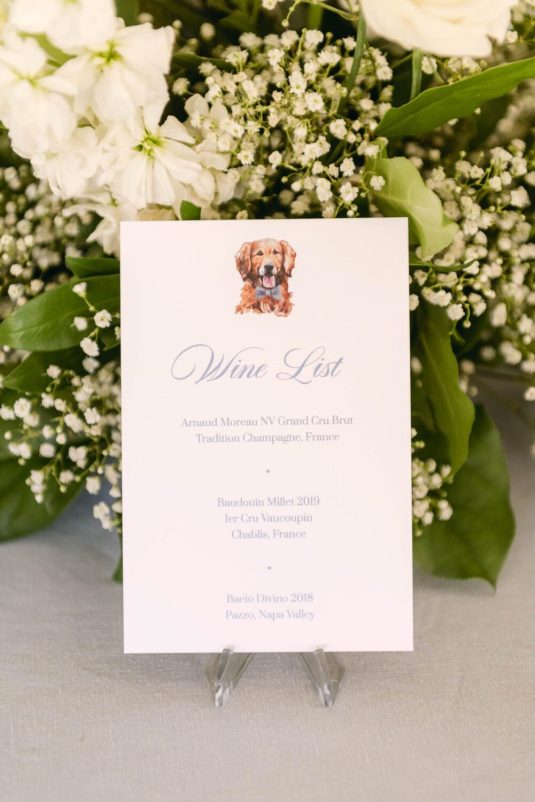 The couple exchanged their vows underneath an oversized floral arch overlooking the water. The plein-air woodland setting was also enhanced with a dramatic thirty-foot-long aisle. Natalie arrived in style to the ceremony with her father in a vintage family car. Vintage was a theme woven throughout the day in subtle ways including the bride’s vintage Oscar de la Renta wedding gown.