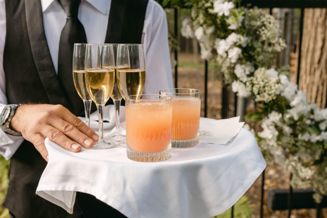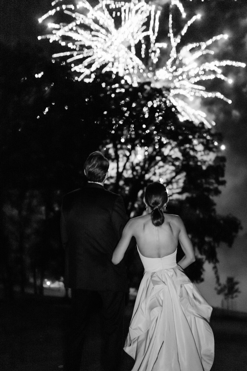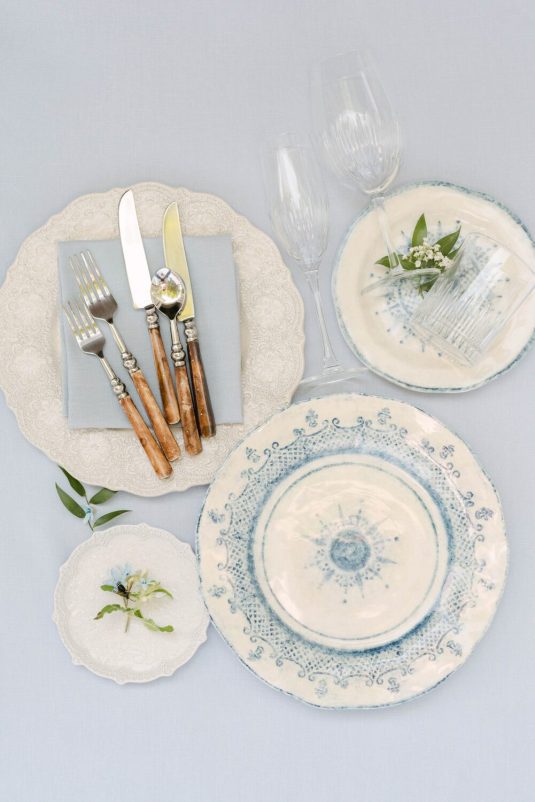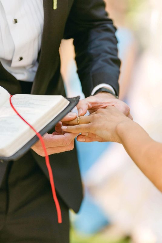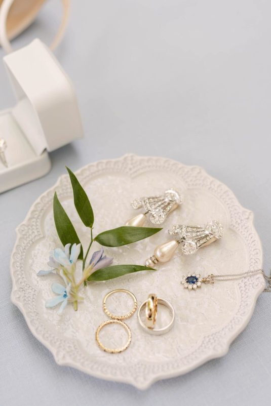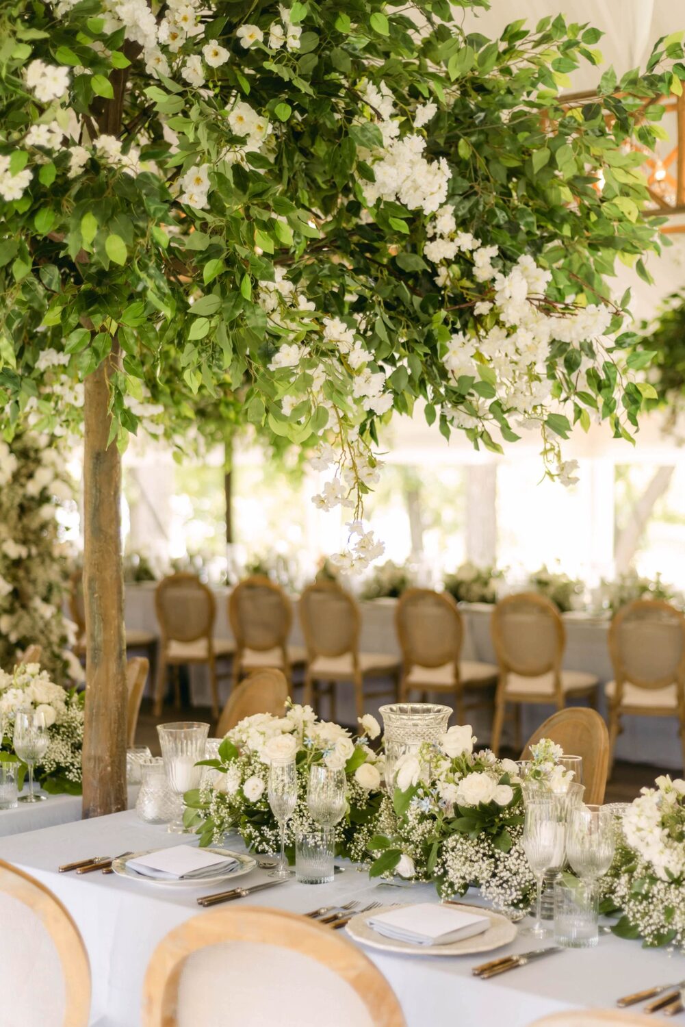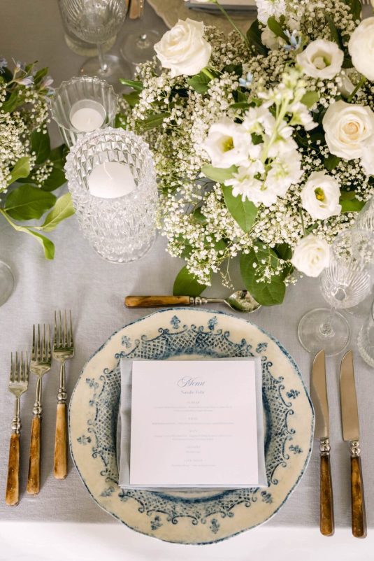 The couple exchanged their vows underneath an oversized floral arch overlooking the water. The plein-air woodland setting was also enhanced with a dramatic thirty-foot-long aisle. Natalie arrived in style to the ceremony with her father in a vintage family car. Vintage was a theme woven throughout the day in subtle ways including the bride’s vintage Oscar de la Renta wedding gown.