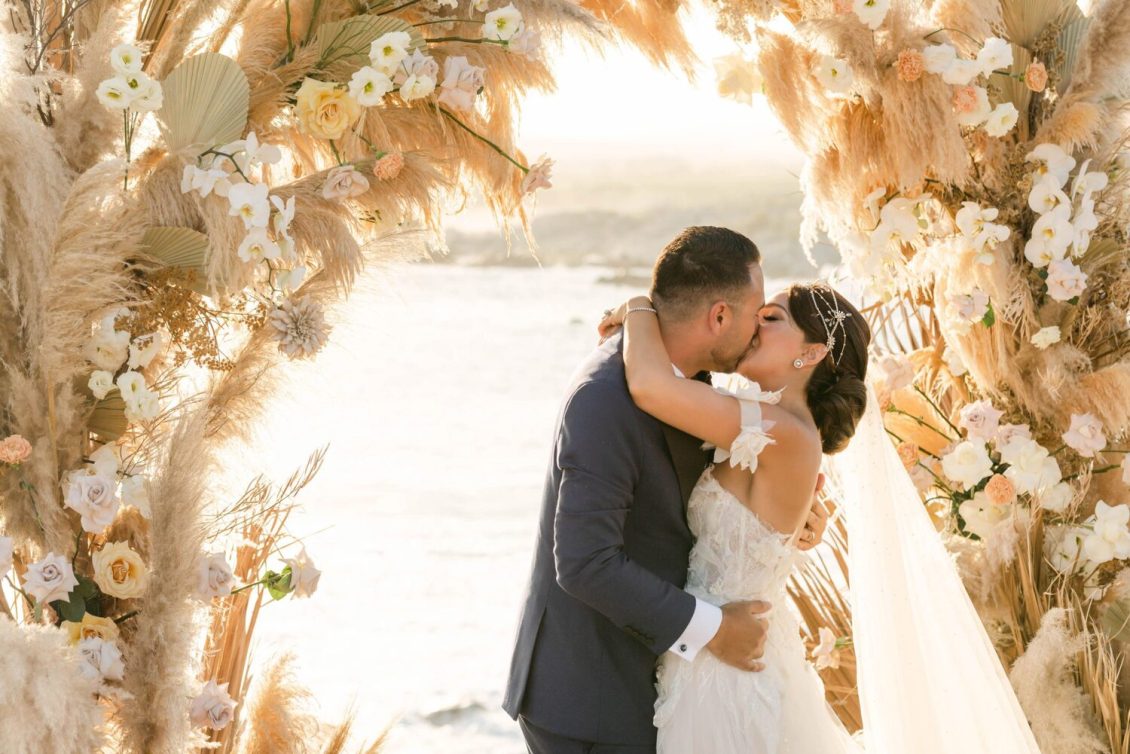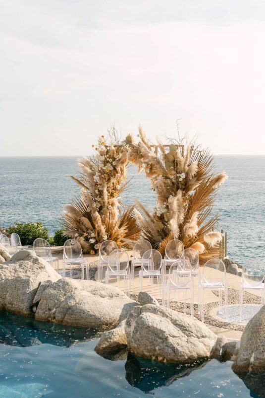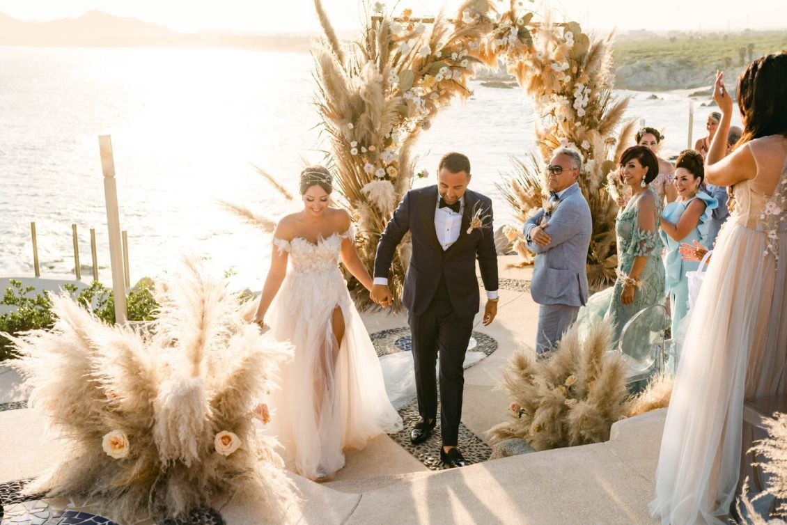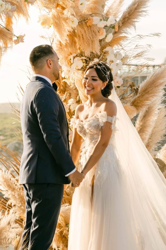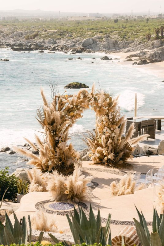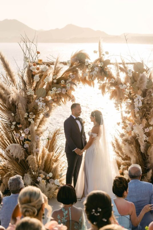 Manelli and Ross held their boho-chic wedding in September of 2019 in Los Cabos, overlooking gorgeous views of the bay. The pièce de résistance of the ceremony was a free-form floral arch full of natural elements like pampas grass with a touch of drama. “We wanted to make everyone feel [like] they just walked into a magical setting where the flowers and ocean met the sky,” shares Manelli. Scroll to see!