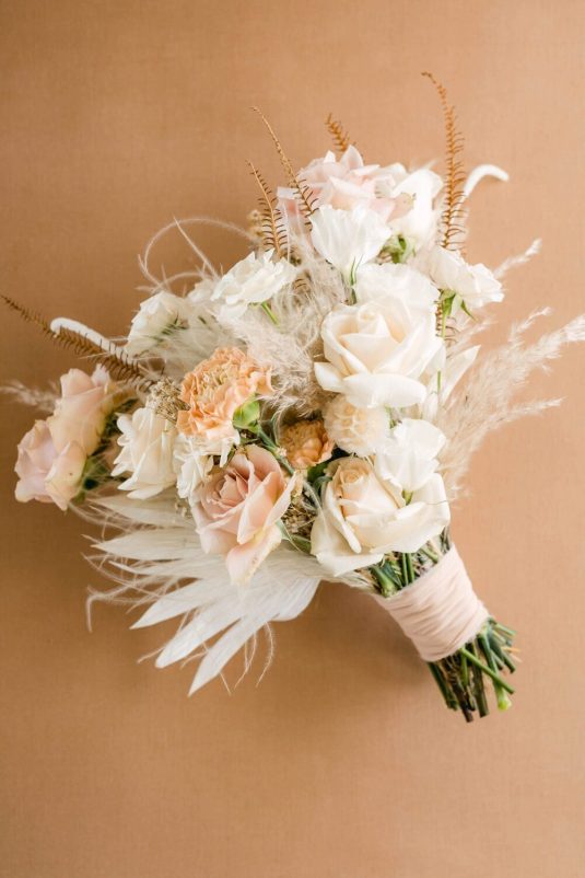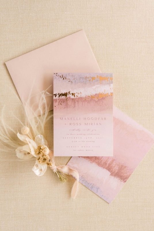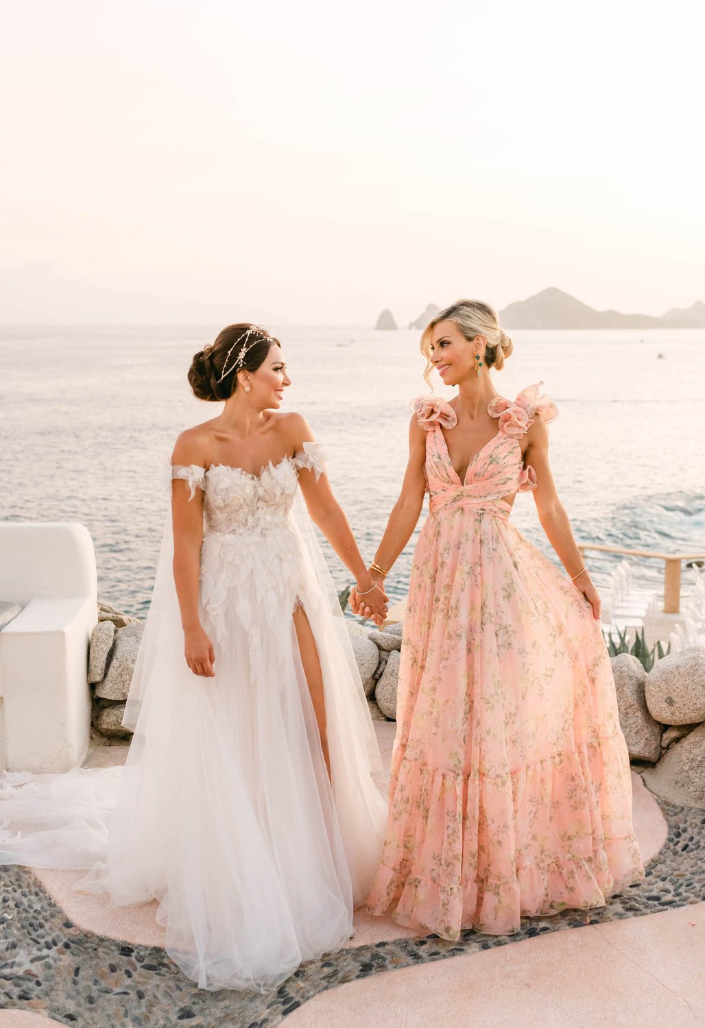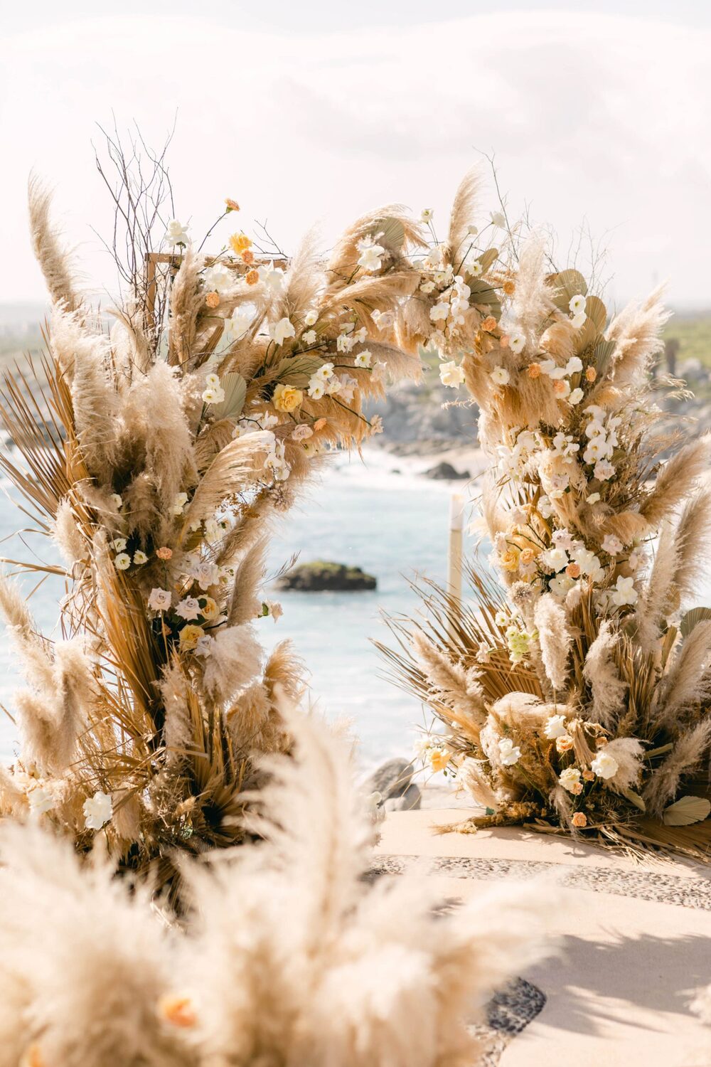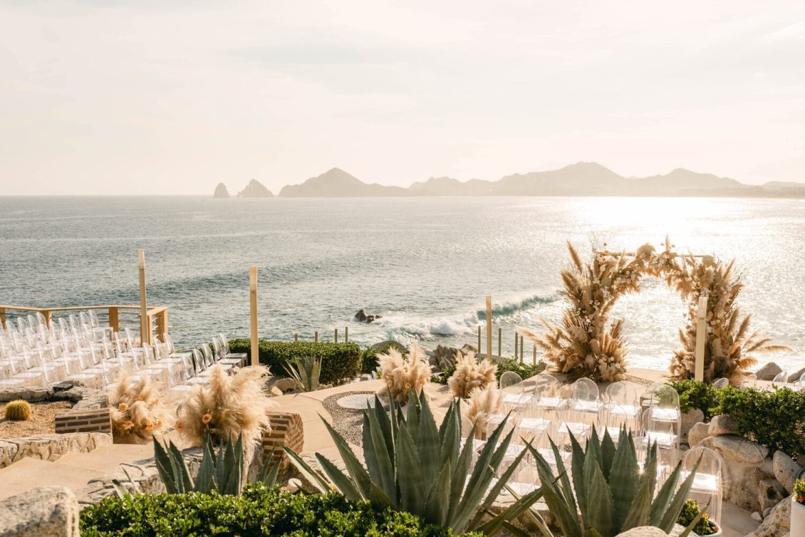 Manelli and Ross held their boho-chic wedding in September of 2019 in Los Cabos, overlooking gorgeous views of the bay. The pièce de résistance of the ceremony was a free-form floral arch full of natural elements like pampas grass with a touch of drama. “We wanted to make everyone feel [like] they just walked into a magical setting where the flowers and ocean met the sky,” shares Manelli. Scroll to see!