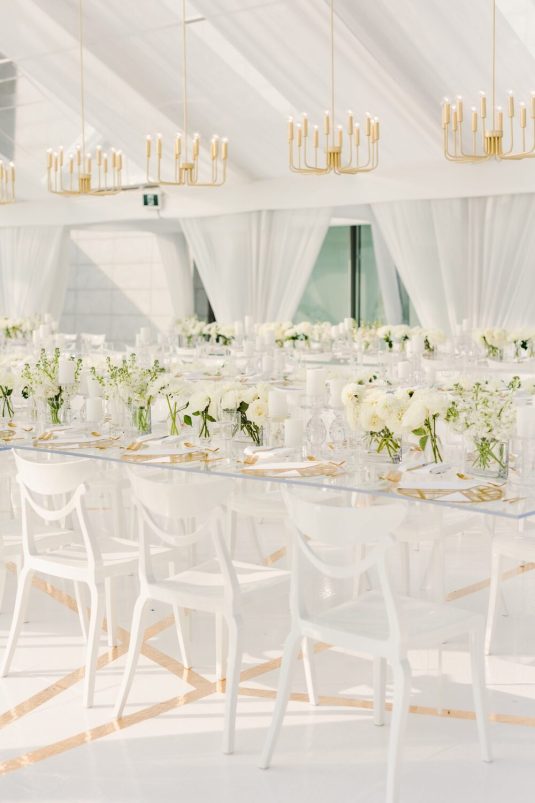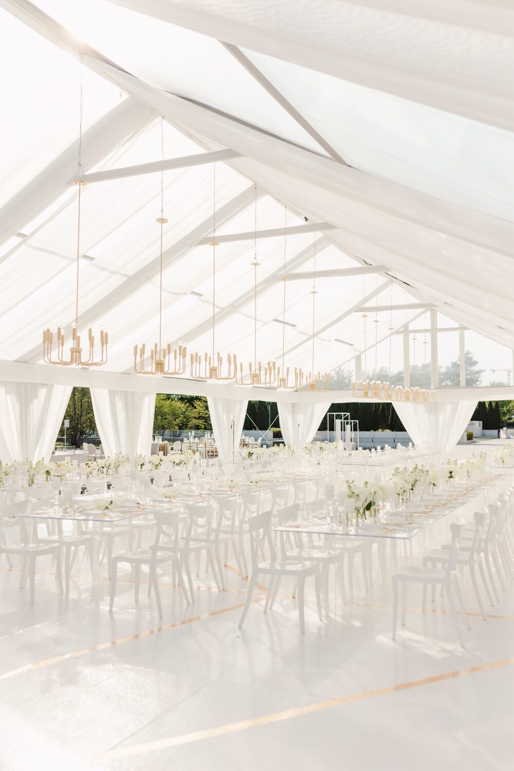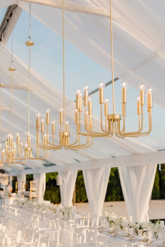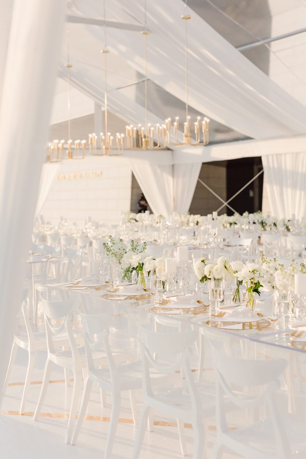 The all-white reception took place in an airy, light-filled, clear-top tent provided by Premier Event Tent Rentals. Inside, the modern design featured three long rows of tables with alternating floral arrangements by Stemz, who also provided the gold chandeliers. Guests could enjoy the unobstructed views directly over the reflecting pool.