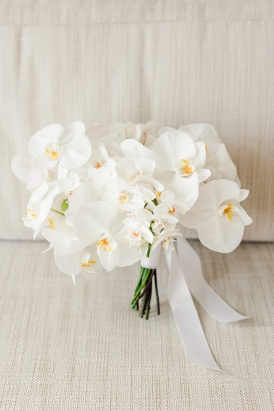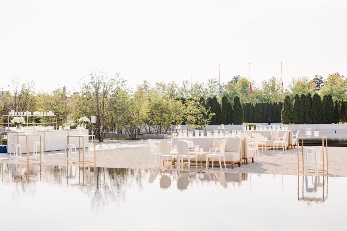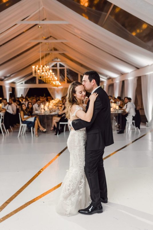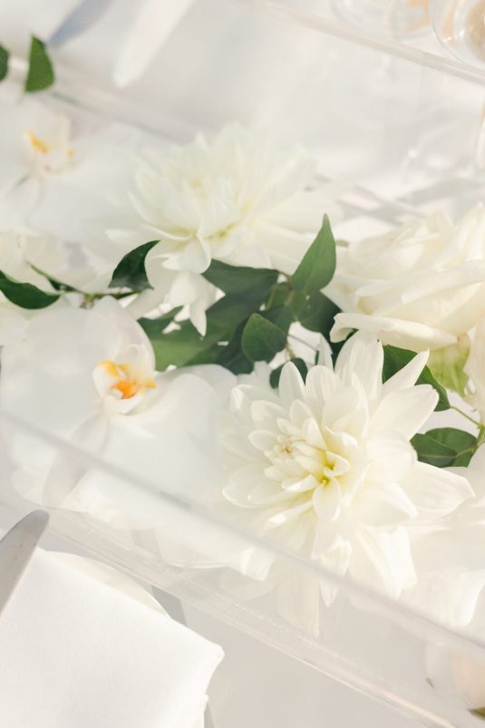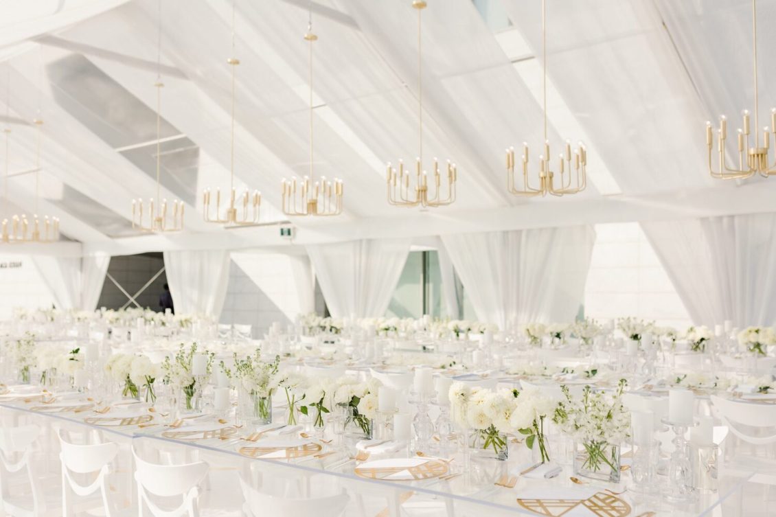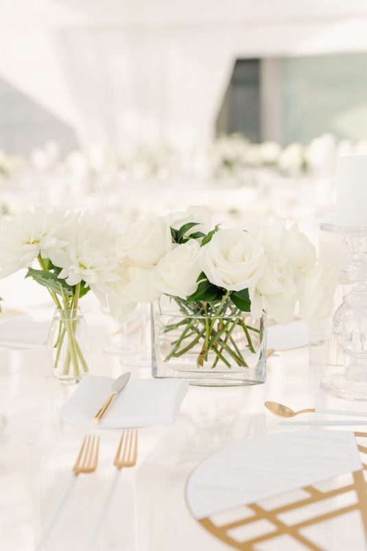 The all-white reception took place in an airy, light-filled, clear-top tent provided by Premier Event Tent Rentals. Inside, the modern design featured three long rows of tables with alternating floral arrangements by Stemz, who also provided the gold chandeliers. Guests could enjoy the unobstructed views directly over the reflecting pool.