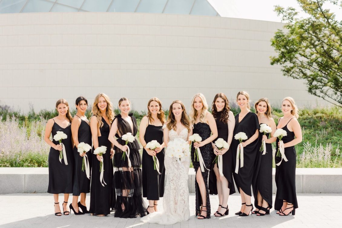 The bridesmaids wore black dresses of their own choosing which resulted in a fun variety of lengths and looks.