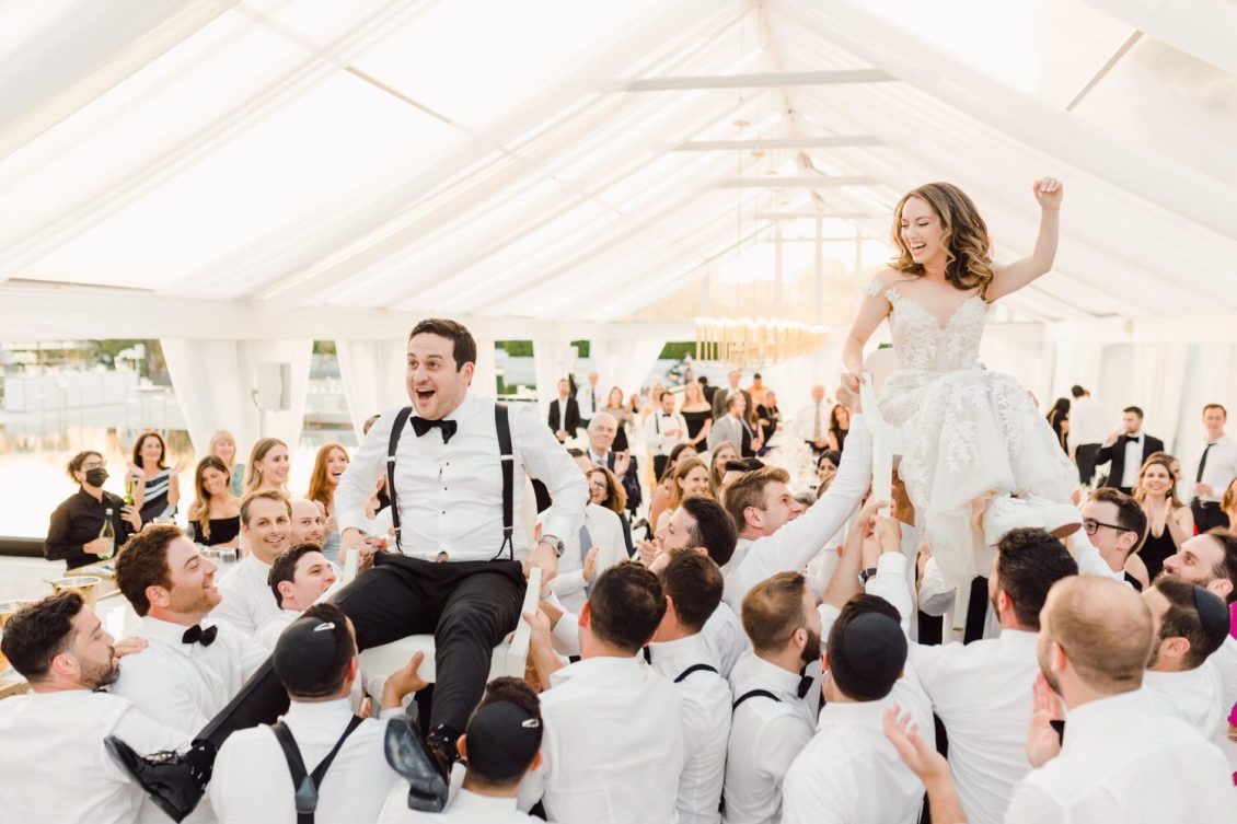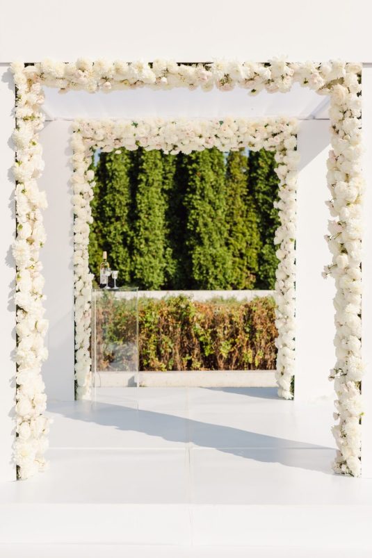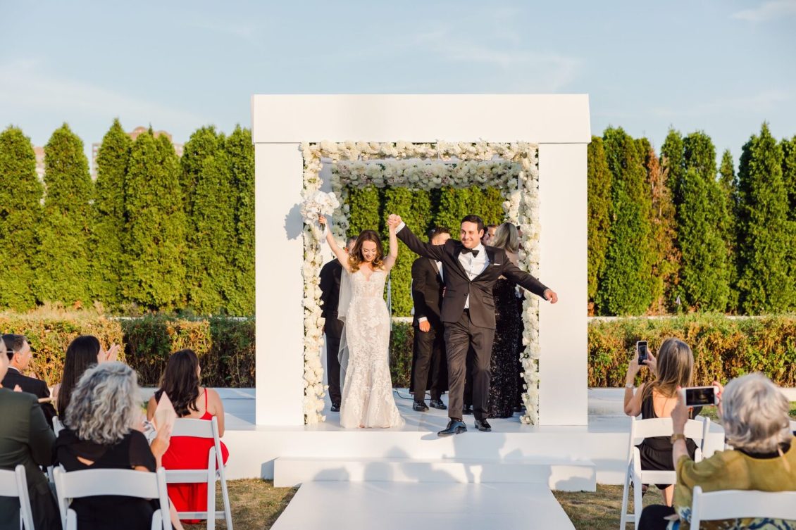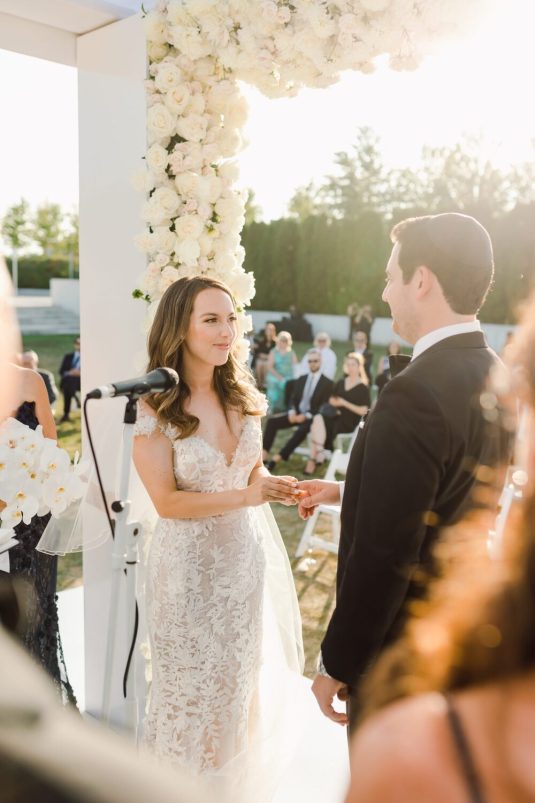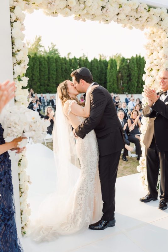 A 100-foot-long white aisle runner allowed the wedding party to make a grand entrance. “We and our family loved walking down the long aisle!” remembers the bride. The traditional chuppah was designed with an inverted floral treatment by Stemz.