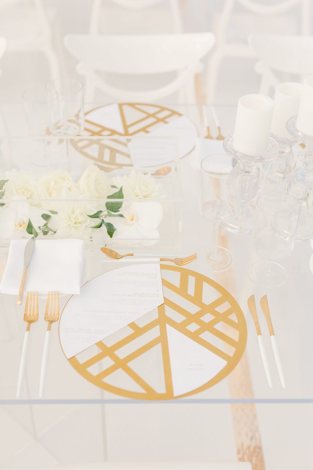 “For the day of stationery, we leaned into the modern aesthetic of the wedding,” notes event planner Melissa Baum. Die-cut menus and name cards were designed to fit perfectly into the gold geometric placemats.