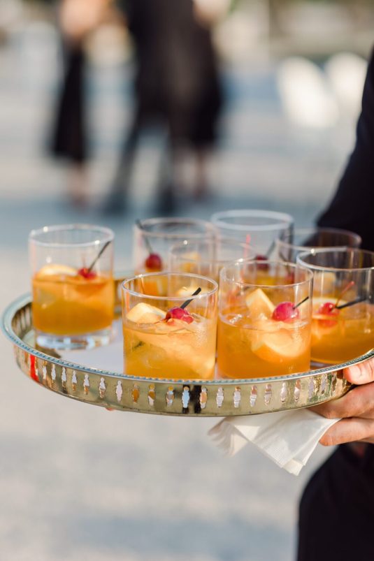 Stacey and Jordan loved the atmosphere of the outdoor cocktail lounge that was set up by the infinity pools. Combined with the bright blue sky of the sunny day, the space felt like an oasis. “With the lounge area setup, candles, and the sunset it felt like we were outside the city and away,” notes the bride.