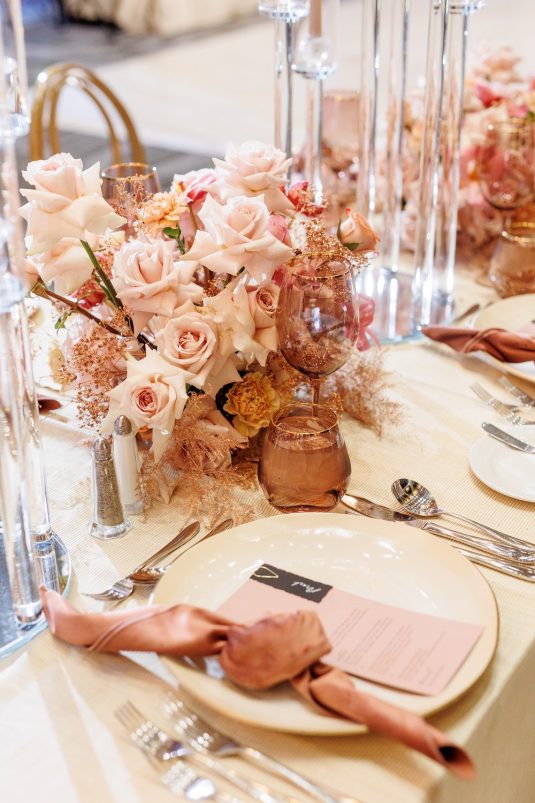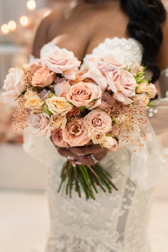 The couple’s wedding ceremony took place on August 13, 2021, but due to Covid restrictions, the reception took place almost a year later on May 6, 2022. Event planning services were provided by Aisha Munier, a childhood neighbour of Jameelah’s and an event planner at Petals & Pearls. “Aisha was hired for partial planning, but she was with me every step of the way. Covid caused us to reschedule three times. But, she stuck it out for two whole years,” notes Jameelah.