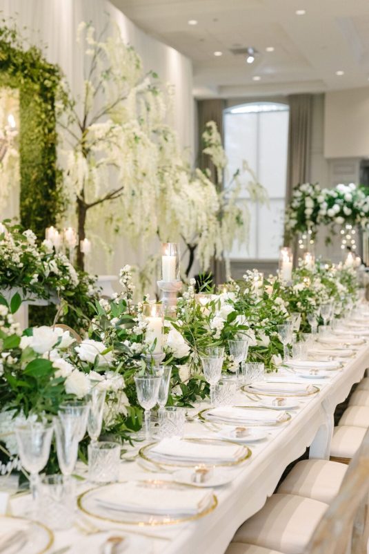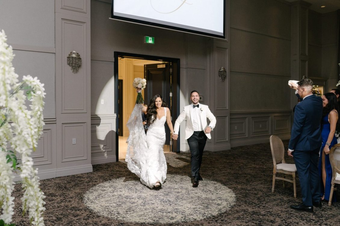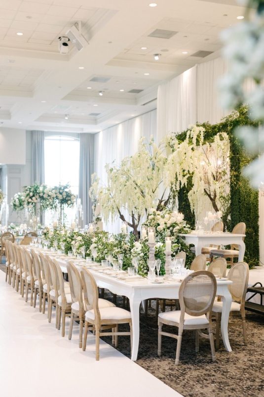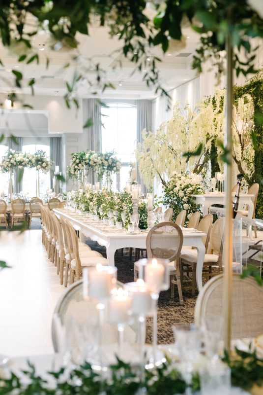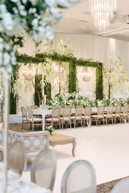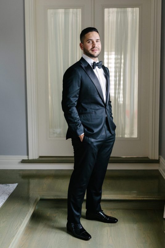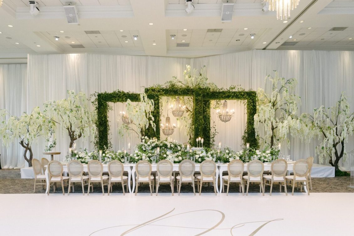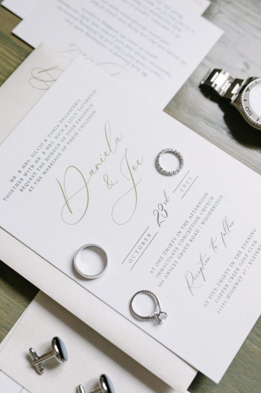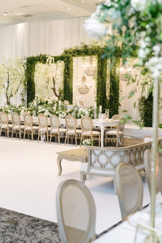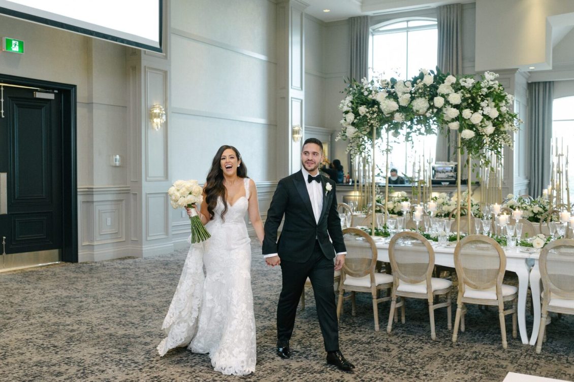 Photography @mangostudios, Full-Service Planning and Design Assistance @simplysiennas, Floral Design @blossomboutiquebb, Draping, Decor and Event Design @eventuredesign, Ceremony located at Immaculate Conception Parish, Officiated by Father Eugene, Reception Venue @coppercreekeventspace, Invitations @elenaslittleshoppe, Day-Of Stationery by Sentiments, Bridal Gown @inesdisanto, Bridal Shoe Designer @maisonvalentino, Bridal Shoe Retailer @nordstrom, Hair Accessory and Jewellery @tarafavajewellery, Formalwear @garrisonbespoke, Watch @rolex, Rings designed by Frank Lijoi, Ring Retailer @finchcentrejewellers, Bridesmaid Gowns @pearlbridalhouse.to, Bridesmaid Earrings @swarovski, Groomsmen’s Formalwear @perluitoronto, Beauty @biancambeauty, Furniture Rentals @detailzfurniturerentals, Linens @att_linenrental, Tableware @maisondesienna, Wedding Cake @sweet_regards, AV and DJ @platinumentertainmentsolution, Dance Floor @creativedancefloors, Entertainment @wellington.music, Cinematography @julianwerks