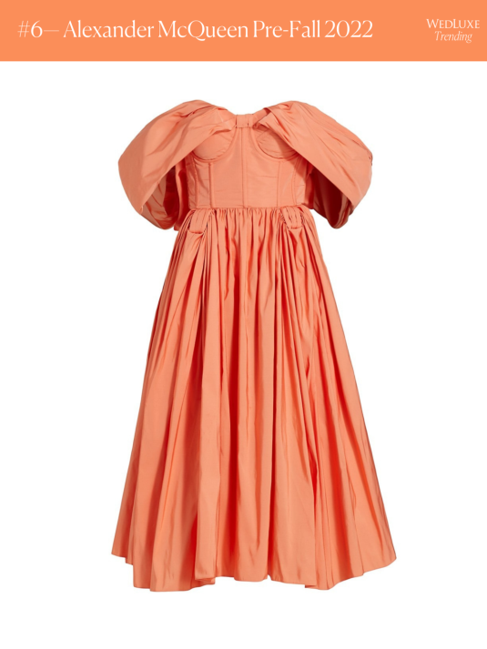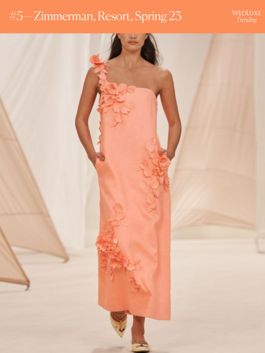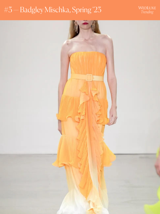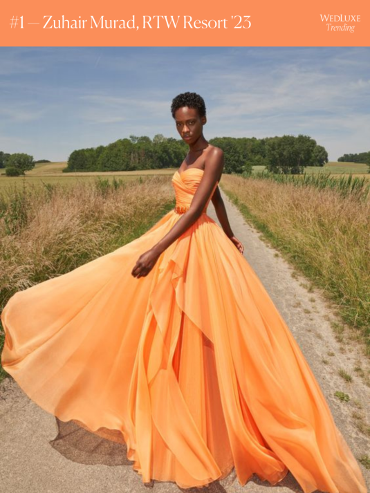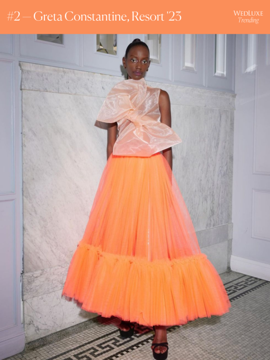 The essence of orange (but not quite orange!) is the taste du jour as apricot and tangerine continue to be a core trend. WGSN Trend Forecasters and sister company Coloro color system JUST announced that The Color of Year for 2024 will be APRICOT CRUSH! Pantone also predicted “Tangelo” was a shade to watch for Spring 2023. Whether your creative jumping-off point is one of the many GORGEOUS looks from the Spring 2023 runway, an orange creamsicle, or an apricot-hued wallpaper, I am really looking forward to a summer of weddings inspired by this trend! – Angela Desveaux, WedLuxe Editor in Chief