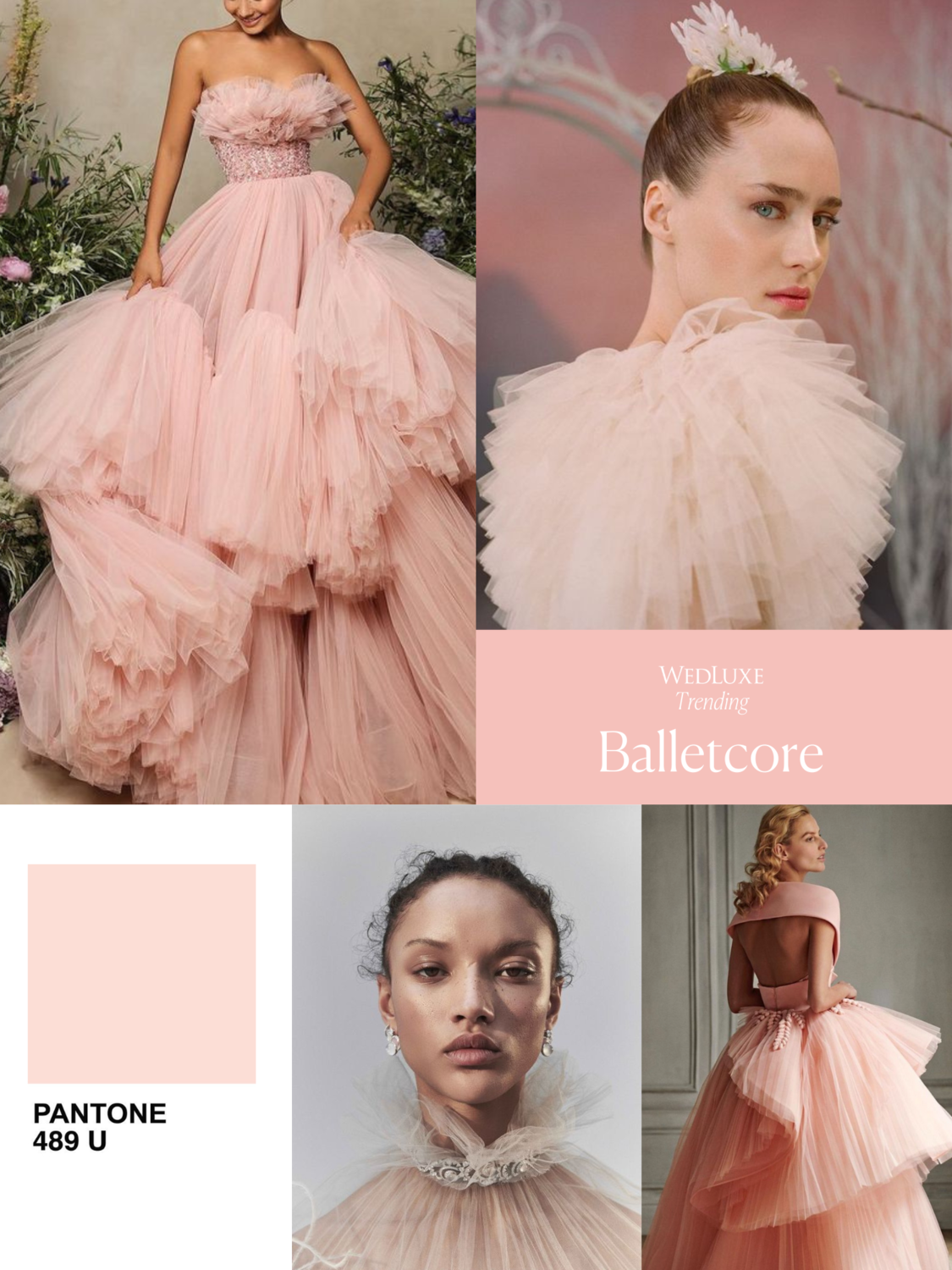 Just when you thought we’d already mentioned every shade of PINK, we bring you the BALLETCORE mood board. This lighter, muted side of pink is all about delicate tulle, silk trends, and refinement. For full inspo, check out Rodarté’s entire FW22 collection that pirouetted right into this theme. “We were thinking about things that were a part of Rodarté and in our DNA,” said Laura in an interview with Vogue. “We wanted to play with [ballerina] silhouettes and a soft pastel color palette.” (Ballet inspired the two designers earlier in their careers when they designed costumes for the movie Black Swan.)