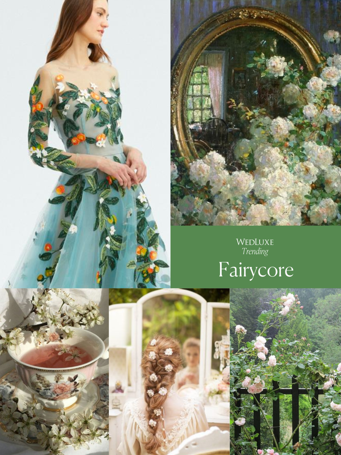 Fairycore has a mystical woodland vibe. In TV terms this vibe is sort of along the lines of a wedding from Lord of the Rings… We’ve seen this trend ranging from ethereal pastel hues to edgier tones like the ones we saw at this year’s Met Gala. We saw the moodier, edgier side of Fairycore when Kendall, Bella Hadid, and Olivia (aka the ultimate #girlsquad) embraced their Tolkein-esque Fairy Queens at last year’s Met Gala.