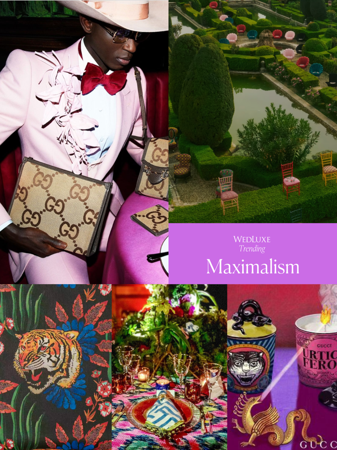 Maximalism is coming in hot for 2023, and NOBODY does Maximalism like Gucci! The brand has ALWAYS been known for championing the audacious, but under the leadership of Alessandro Michele, we’re witnessing an all-encompassing literal, “House of Gucci” driving interior design trends in addition to fashion. Symbolism and allegory are at the forefront of everything Michele is doing across Gucci home, stationery, tabletop, and wallpaper collections. (For instance, we LOVE how the new Gucci Décor collection was presented in an imaginative topiary garden!) We can’t wait to see the post-Covid generation of weddings go ‘to the max’ with elaborate excess of pattern on pattern, allegorical motifs, and raucous, vibrant, eclectic colors.