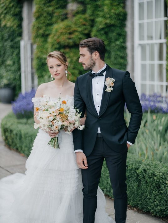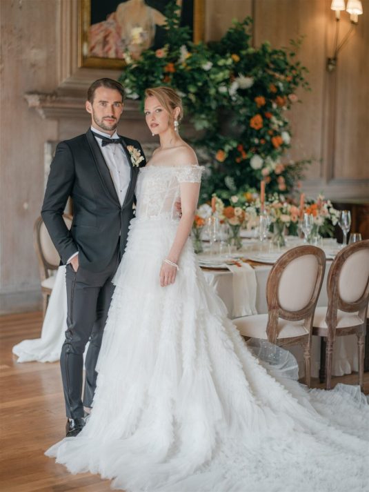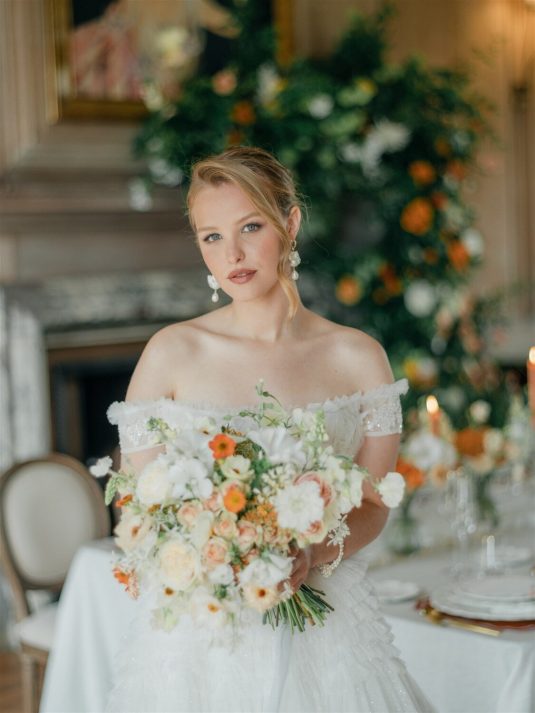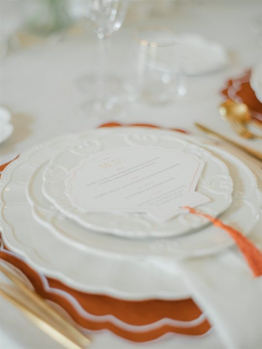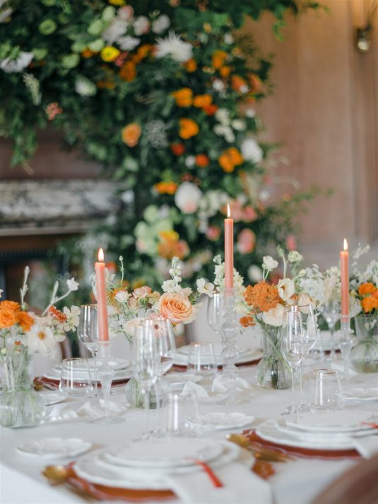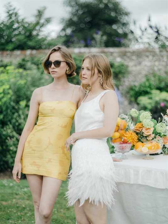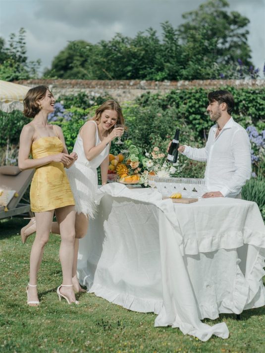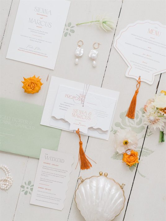 This chic styled shoot showcases playful orange and yellow hues inspired by the coast and inspiration for weekend-long wedding celebrations. “Weekend weddings are here to stay and offer the perfect opportunity to make the most of precious time together with all a couple’s loved ones and curate a perfectly balanced itinerary that combines unique eating and drinking experiences, entertainment, and stunning design,” shares event planner Emily Stutchbury.