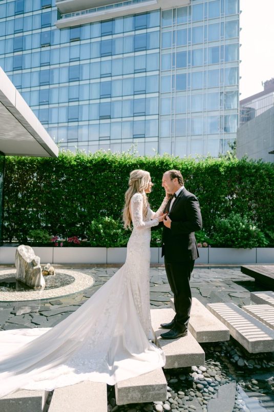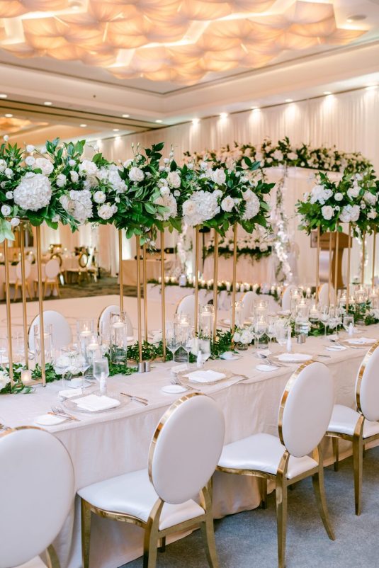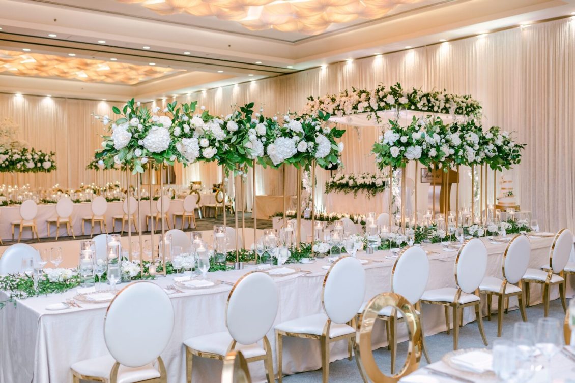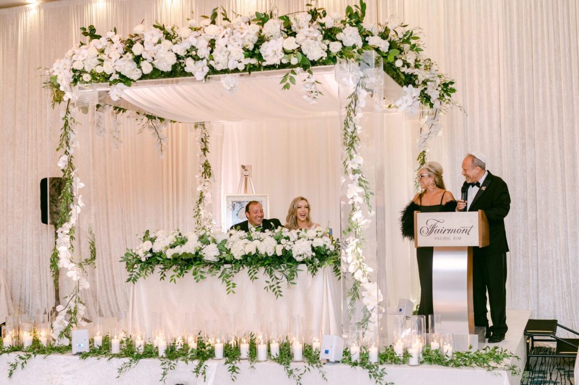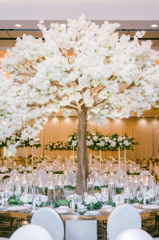 The wedding took place at the Fairmont Pacific Rim and had a luxe garden design with white cherry blossom trees and gold accents.