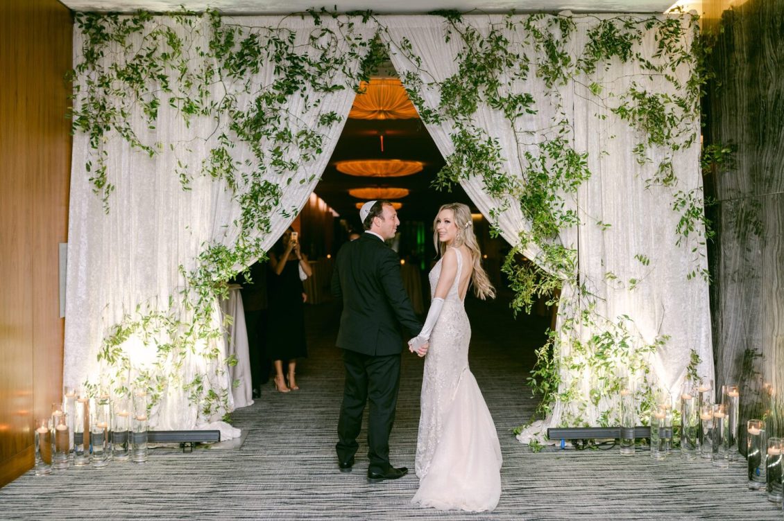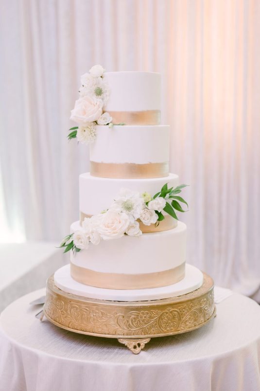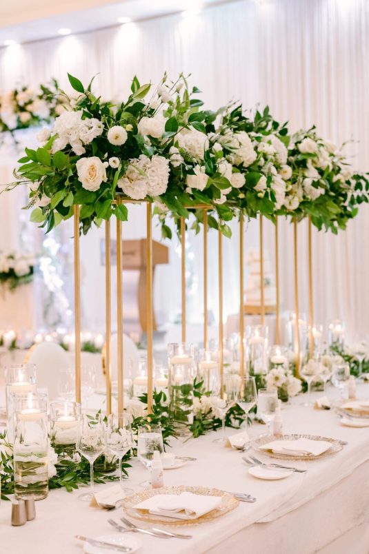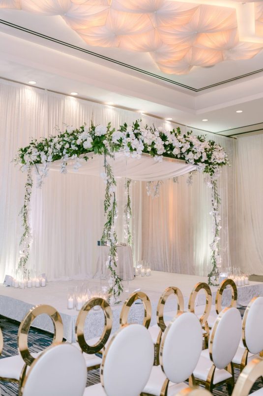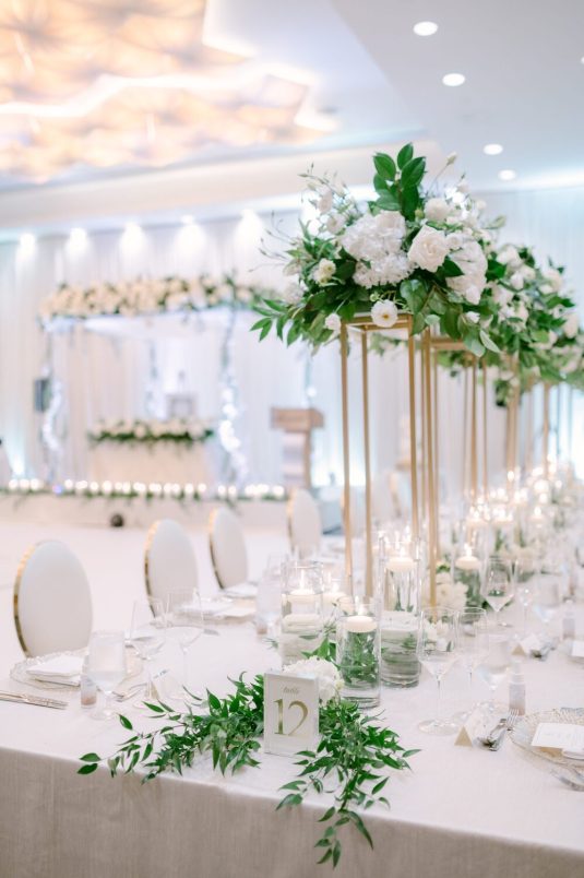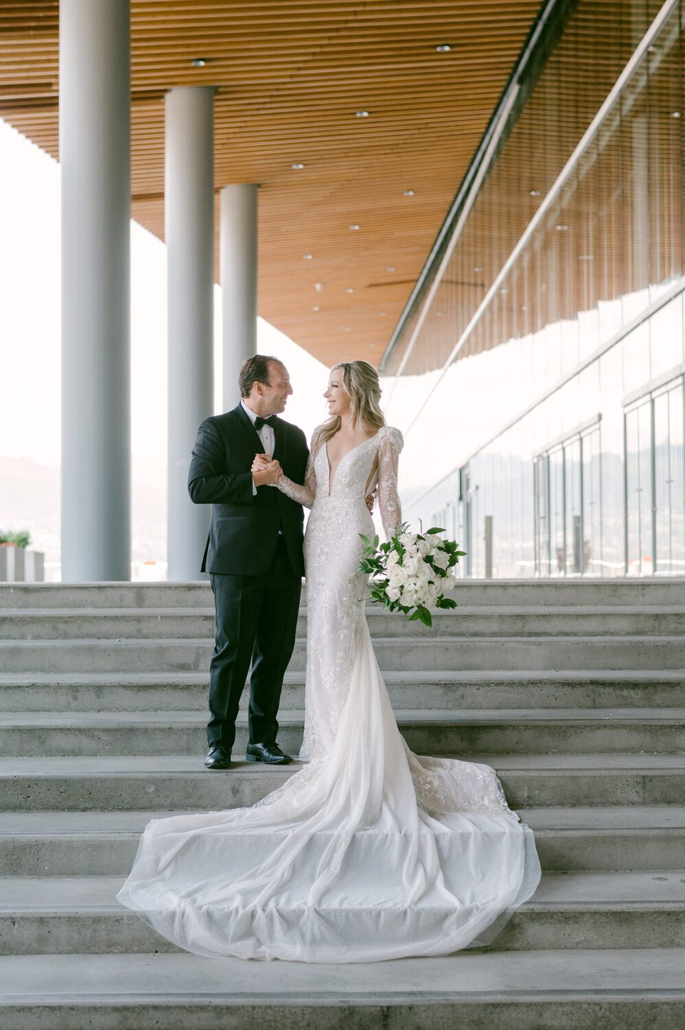 The wedding took place at the Fairmont Pacific Rim and had a luxe garden design with white cherry blossom trees and gold accents.