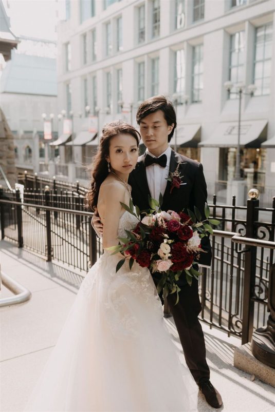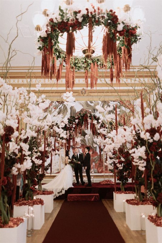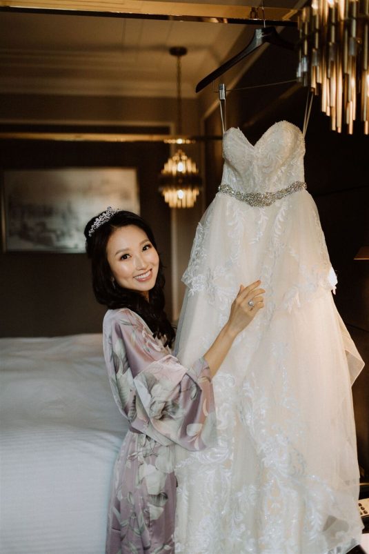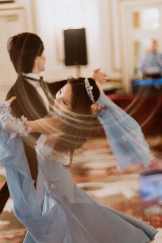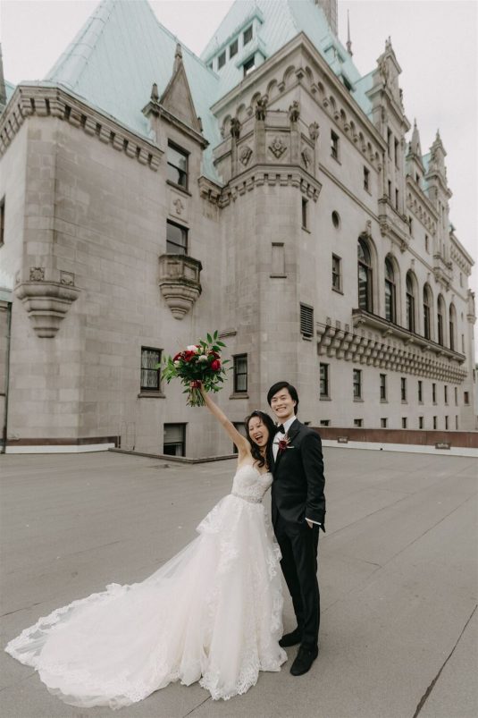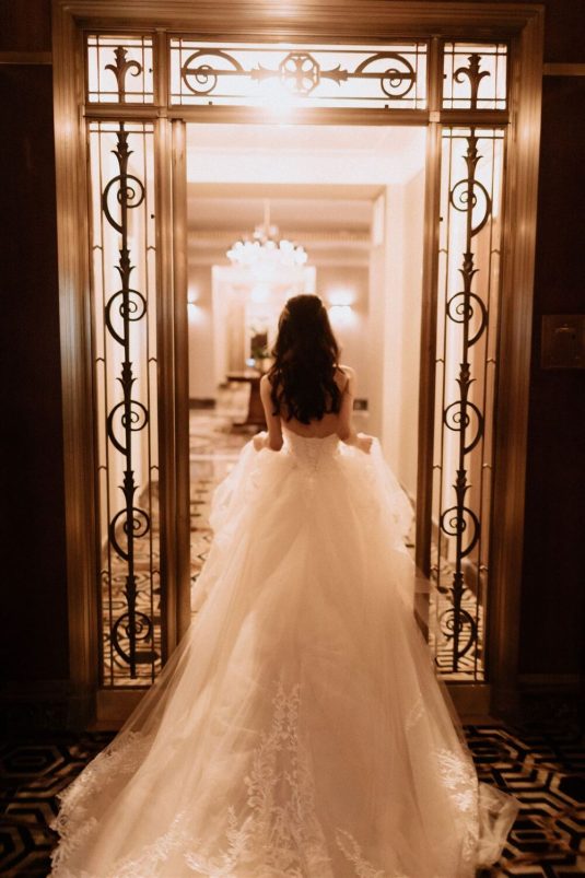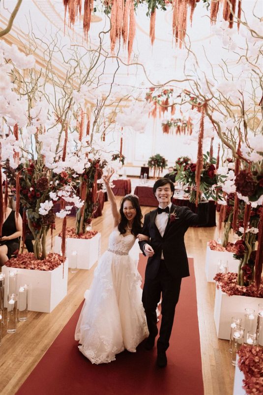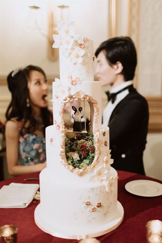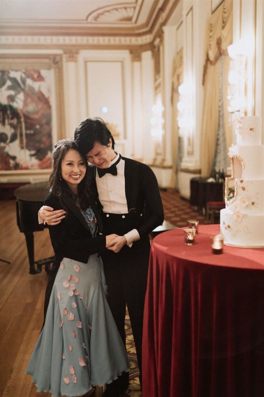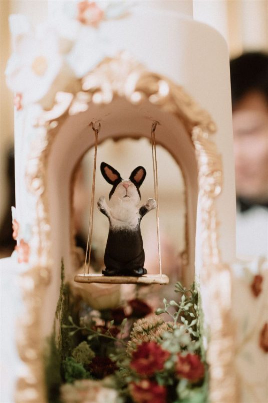 The bride and groom first met when they were partnered together in a Brown University ballroom dance class, and as they fell in love with dance, they also fell in love with each other and have danced competitively together since then. The Viennese Opera Ball-themed wedding took place at the The Fairmont Hotel Vancouver . Both the bride and groom love animals, so, with special permission from the venue, they welcomed adoptable rescue rabbits and therapy dogs at the reception, and as a tribute to their first pet rabbit Rosie, the wedding cake featured a miniature rabbit on a working swing!