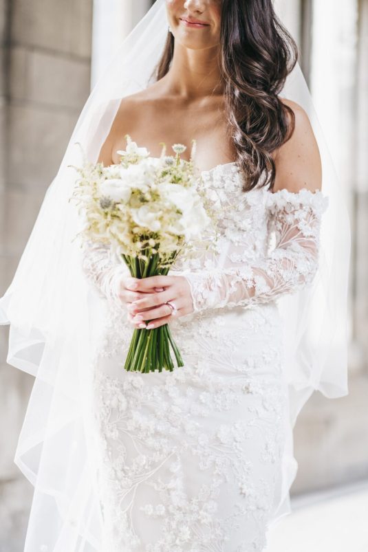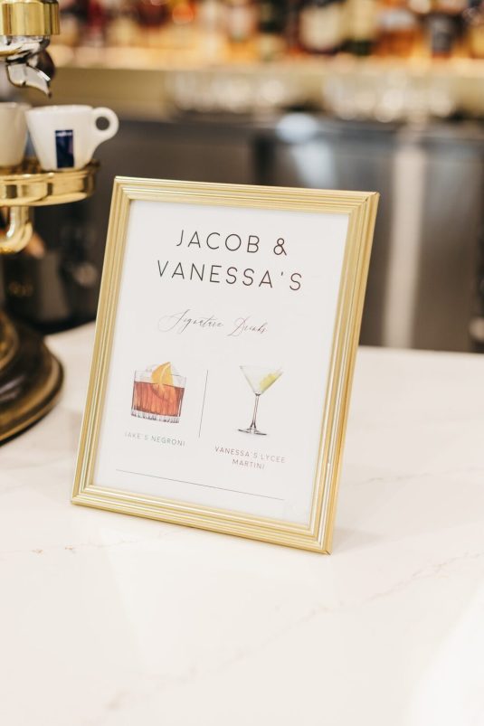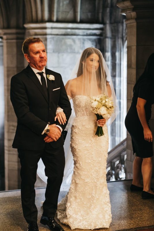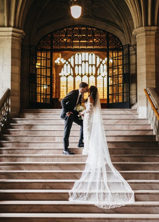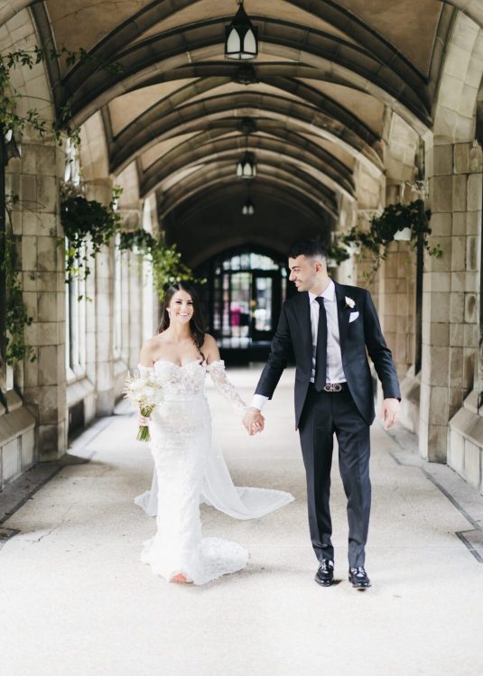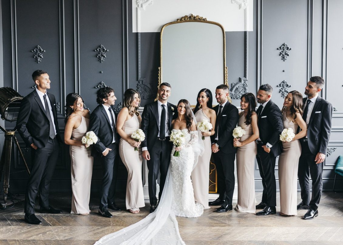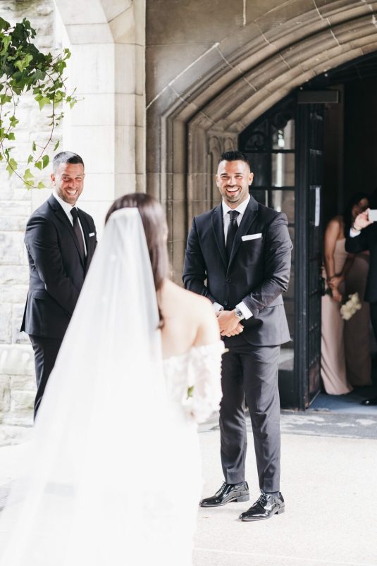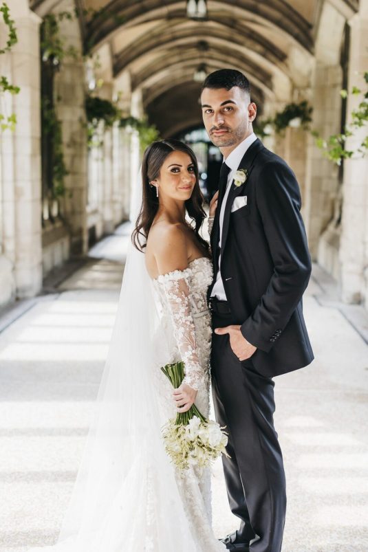 Vanessa and Jacob felt like they were “at the MET” at their black-tie wedding in Toronto, Ontario with 250 guests in attendance. At the cocktail hour, freshly carved prosciutto was served with espresso as the guests enjoy live music entertainment. For the reception, Vanessa traded her veil for a bridal headband, and Jacob changed into a black suit jacket with red undertones.
