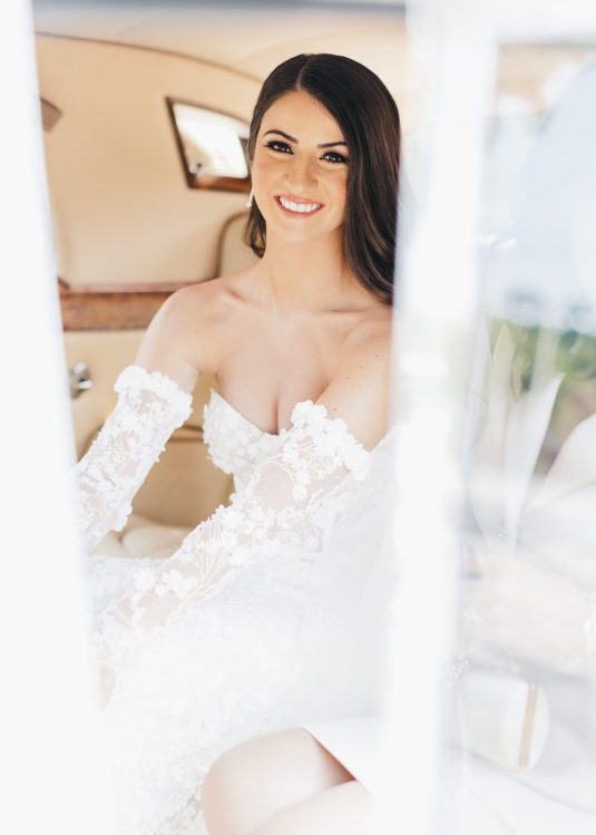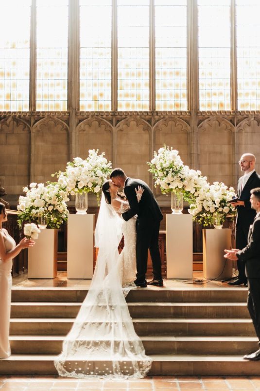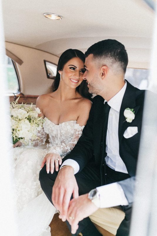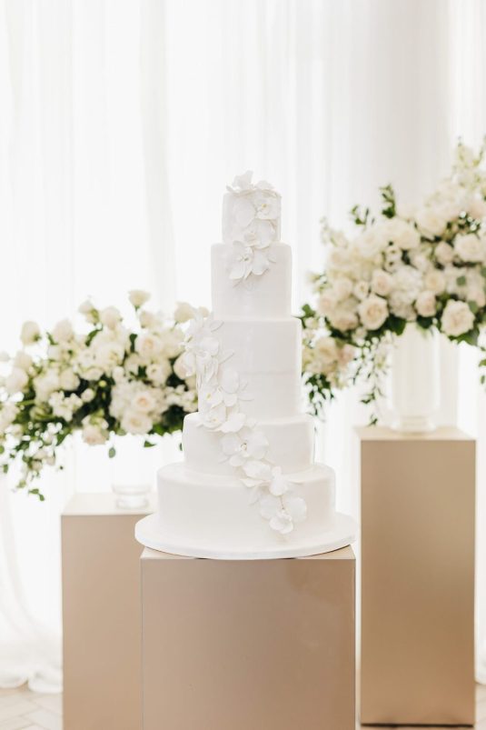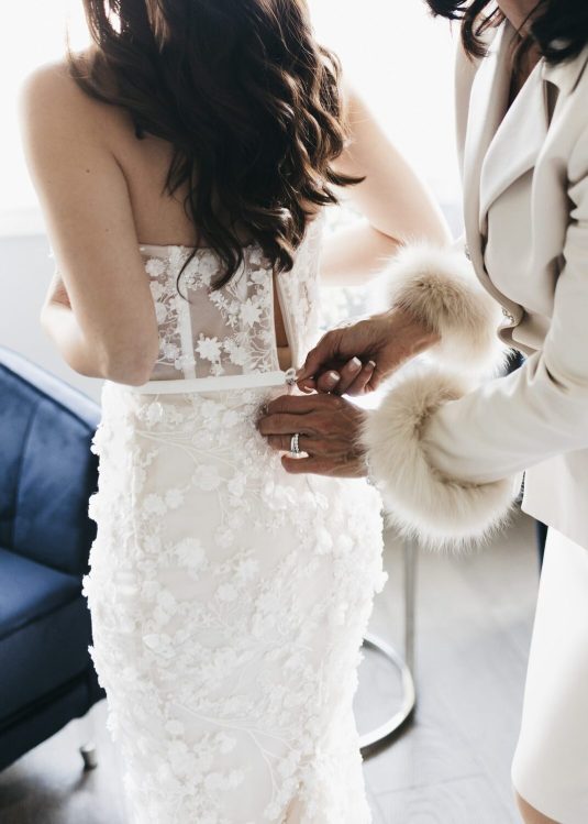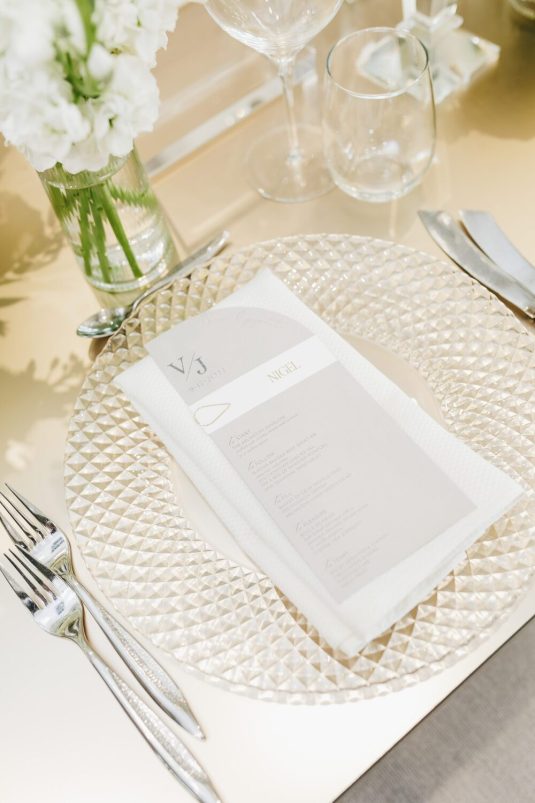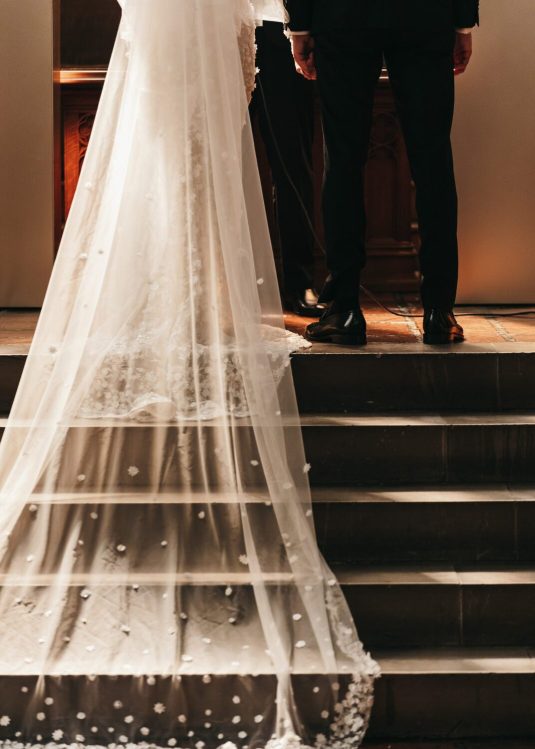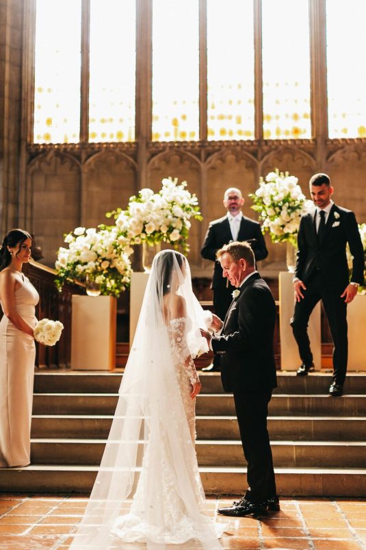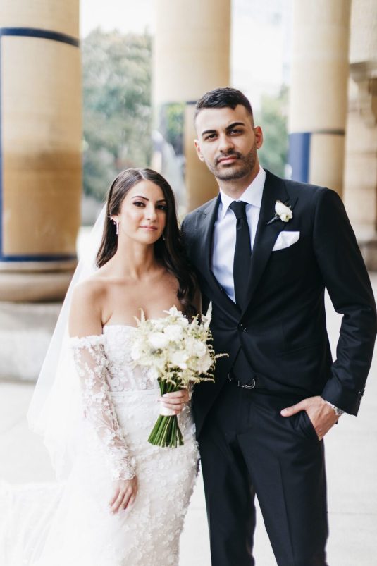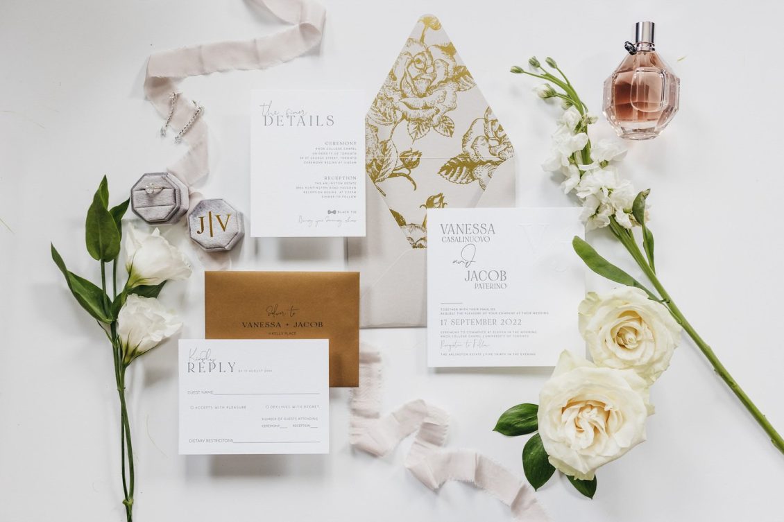 Vanessa and Jacob felt like they were “at the MET” at their black-tie wedding in Toronto, Ontario with 250 guests in attendance. At the cocktail hour, freshly carved prosciutto was served with espresso as the guests enjoy live music entertainment. For the reception, Vanessa traded her veil for a bridal headband, and Jacob changed into a black suit jacket with red undertones.