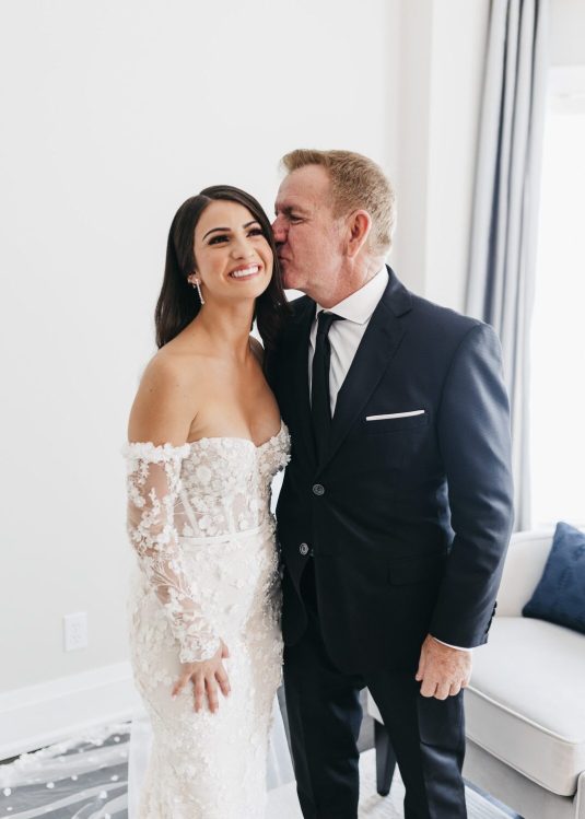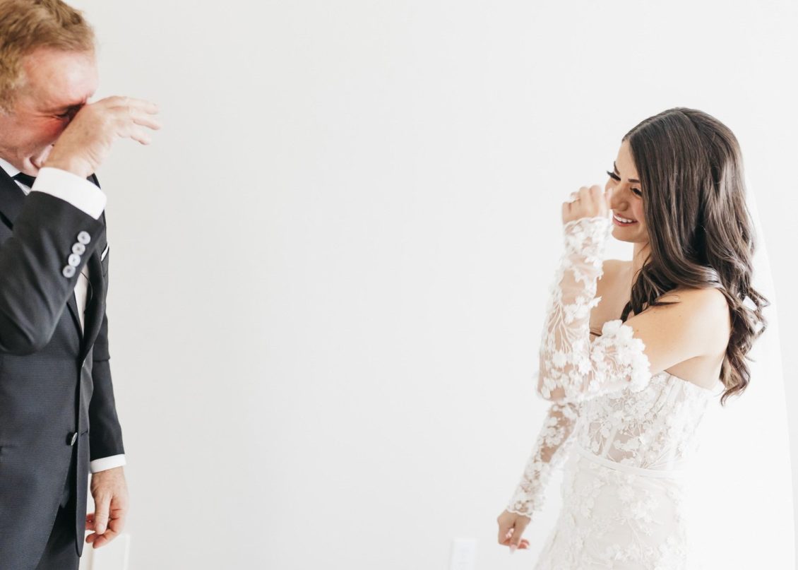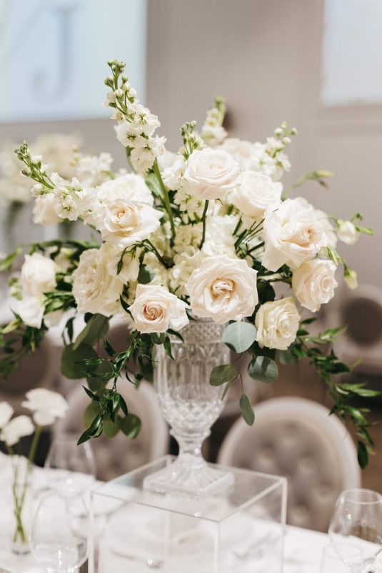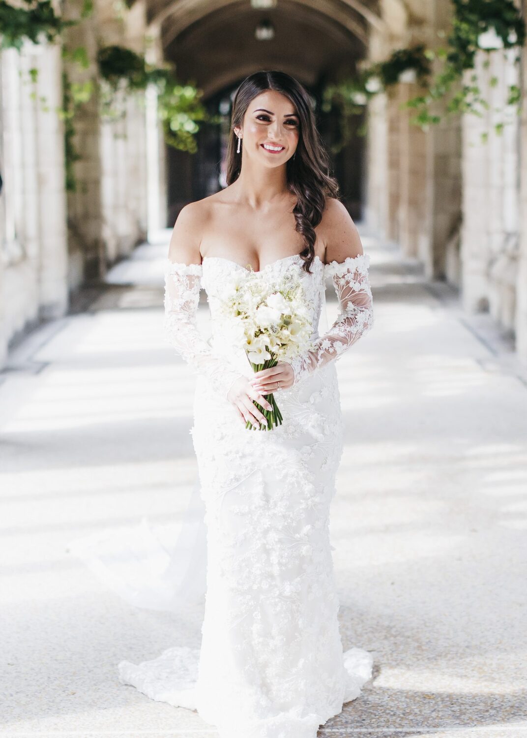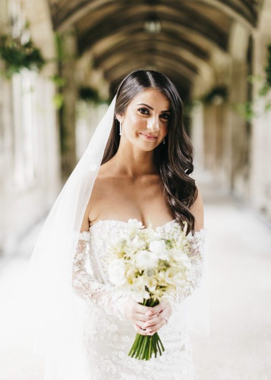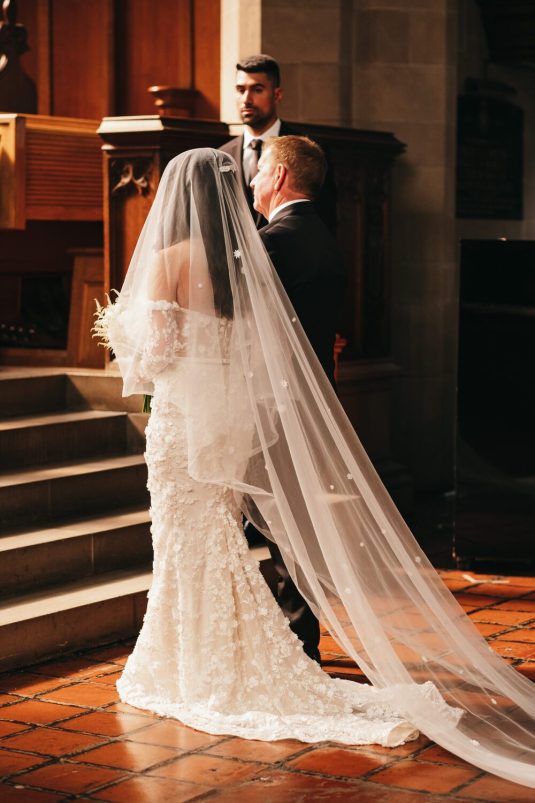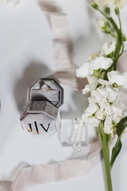 Vanessa and Jacob felt like they were “at the MET” at their black-tie wedding in Toronto, Ontario with 250 guests in attendance. At the cocktail hour, freshly carved prosciutto was served with espresso as the guests enjoy live music entertainment. For the reception, Vanessa traded her veil for a bridal headband, and Jacob changed into a black suit jacket with red undertones.