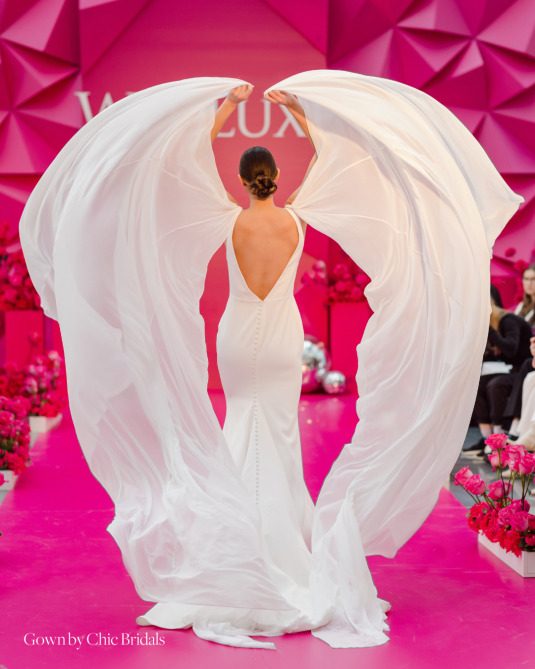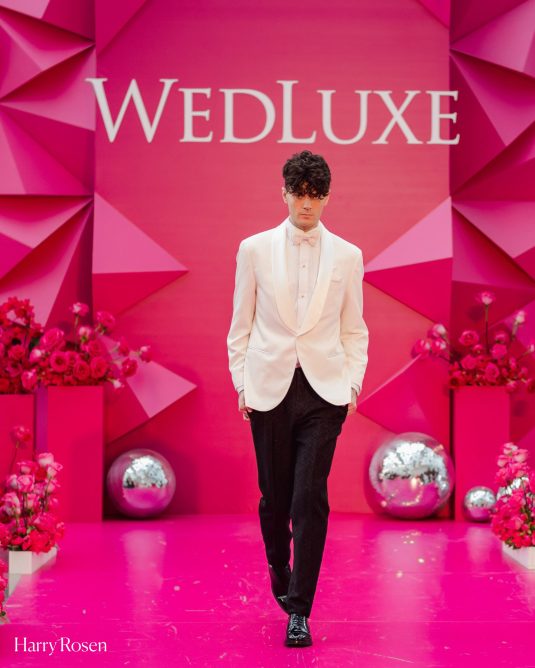 The WedLuxe Runway (known as a show within the show!) also returned to the event in high style. Valentino’s “P.P. Pink” inspired the eye-popping pink elements within the space. Held in the ultra-modern, all-glass structure of New Fort Hall (located on the main level of Hotel X Toronto), space design and planning for The WedLuxe Runway was provided by LA CHIC SOIRÉE with furniture rentals from Detailz Couture Event Rentals .