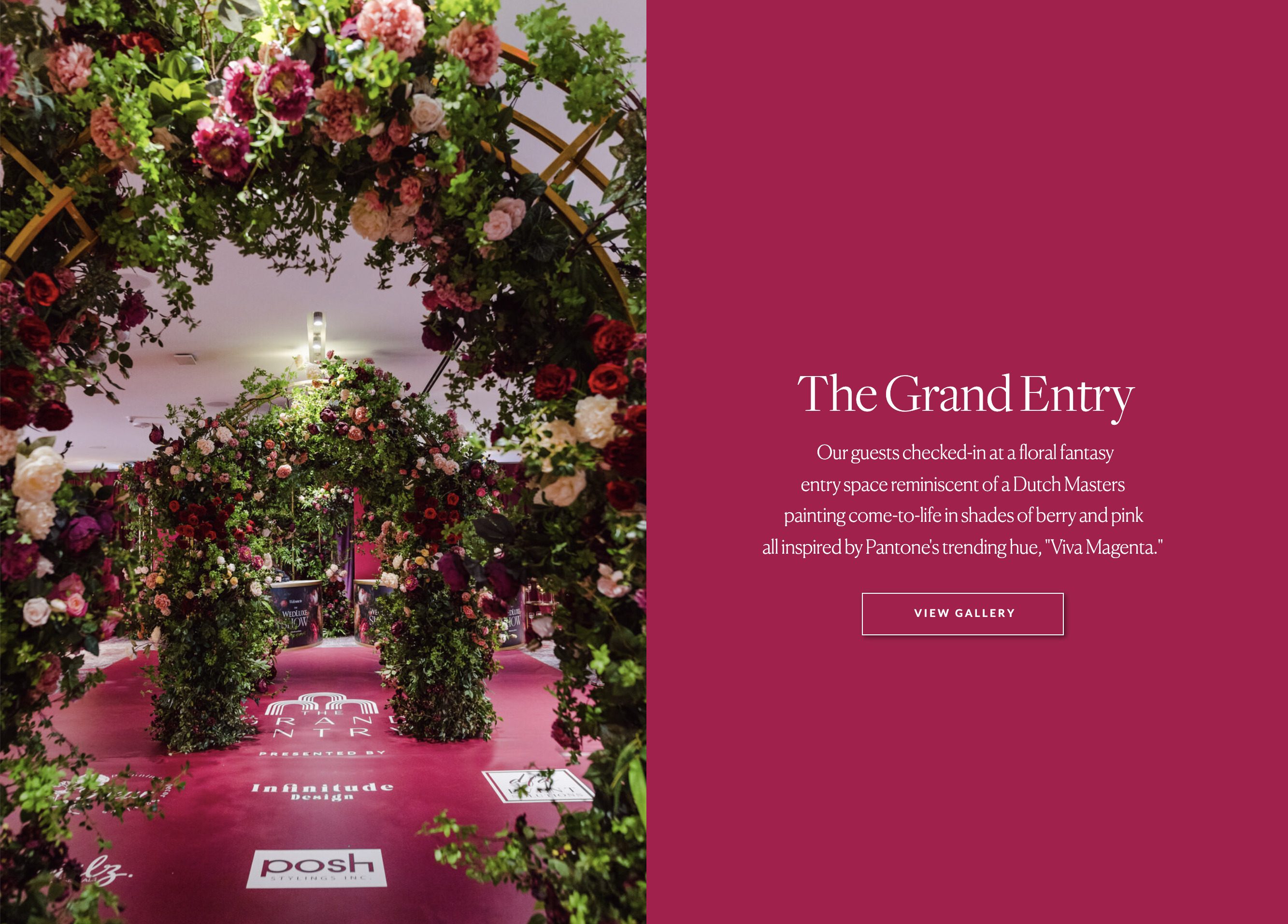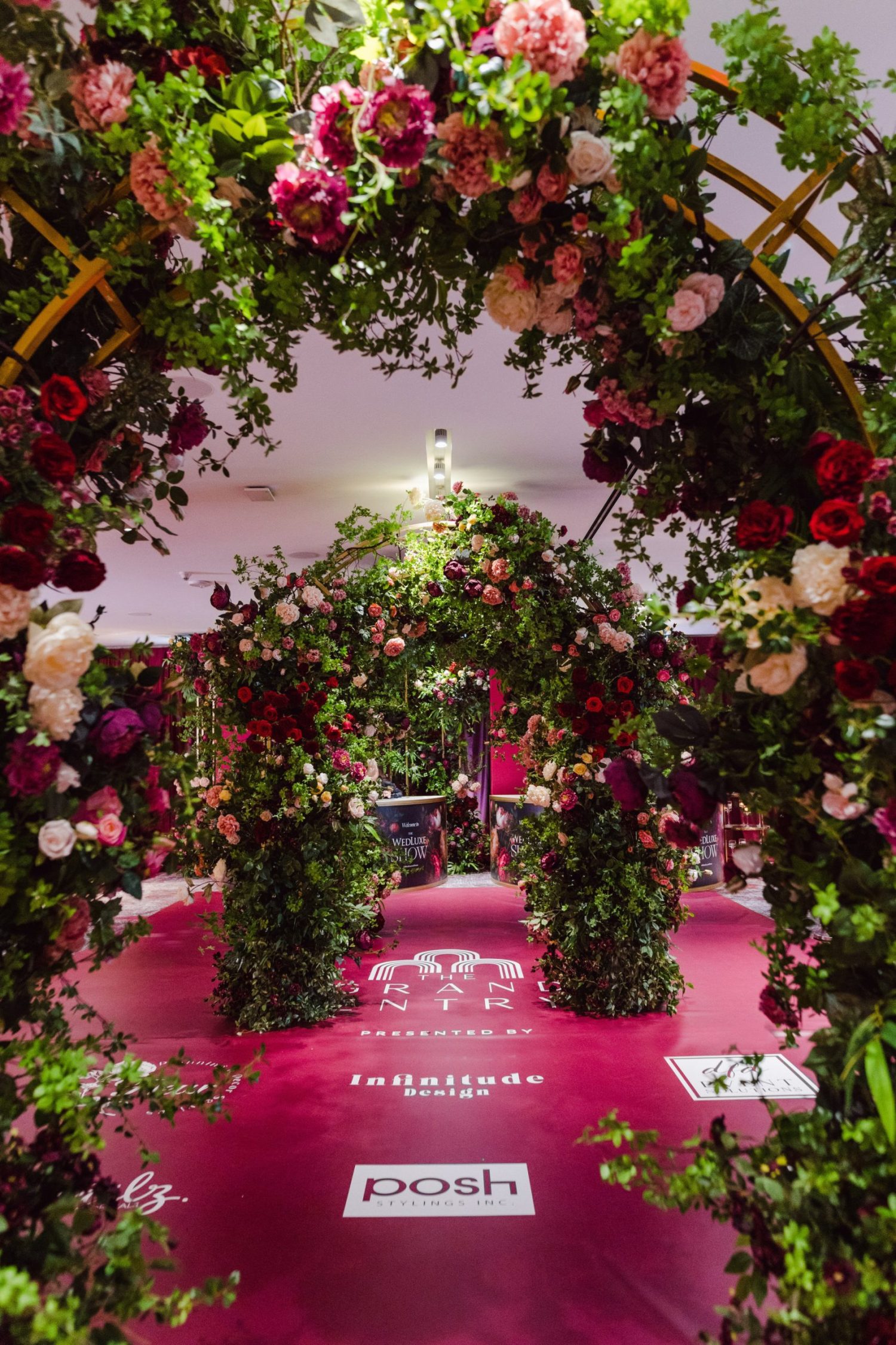 , who provided space planning and design, The Grand Entry was designed with Pantone’s newest hit hue, “Viva Magenta,” in mind. The floral design team at INFINITUDE DESIGN brought the graphics pattern to life by creating three magnificent floral arches integrating thousands of magenta-hued peonies, roses, and foliage.