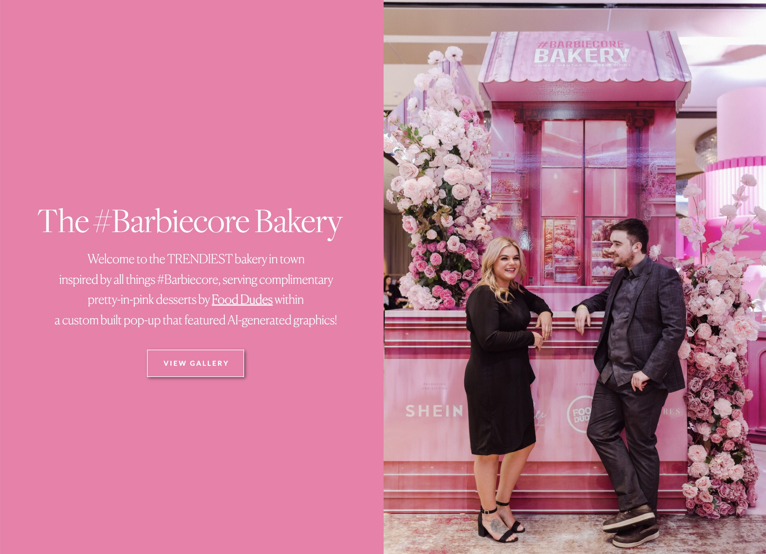 The 22ft x 22ft bakery structure was plotted out and built by DFD Event Solutions featuring printed graphics I generated with A.I. using Midjourney. Then, I stitched together and customized the A.I.-generated images to fit the structure using Photoshop and other programs. Our bakery event planning and design partner, DIANA PIRES EVENTS, took it from there, adding her signature attention to detail with the bakery’s planning, interior design, flow, and logistics, including coordination with our catering partner, The Food Dudes , on what the bakery served-up! Think all-pink desserts, including the yummy pink ice-cream sandwiches that were a crowd fav! An extraordinary 12-foot-tall 3D (foam) cake sculpture with an oversized bow, designed and produced by the sculptural decor engineers from Engineered Arts , provided the WOW moment for the center of the space. Finally, CAPRICE DECOR provided exquisite pink floral installations to bring the entire thing together. It was a fun and unique collaboration for all.”